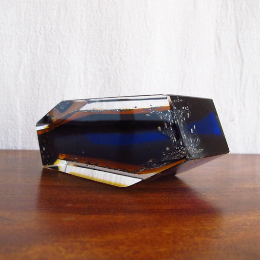 1970s Italian Art Glass Vase (or possibly bowl), Faceted Geometric with Blue and Amber and Clear Glass