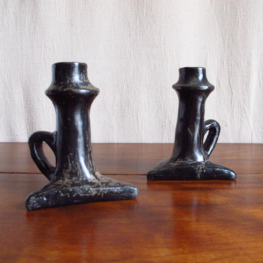 Pair of Southwest Santa Clara black Native American pottery candlesticks, c. 1920