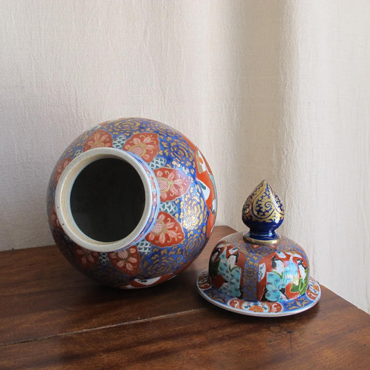 LARGE antique Japanese Imari / Arita ware covered jar, depicting dancers with fans, c. 1860 1880
