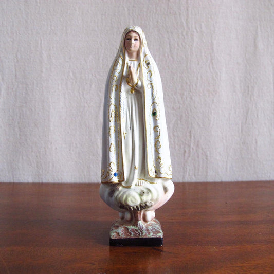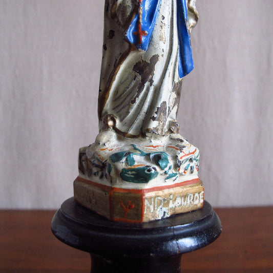 Polychrome over Spelter Madonna “Our Lady of Lourdes” Souvenir with Wooden Plinth, c. 1890 1900