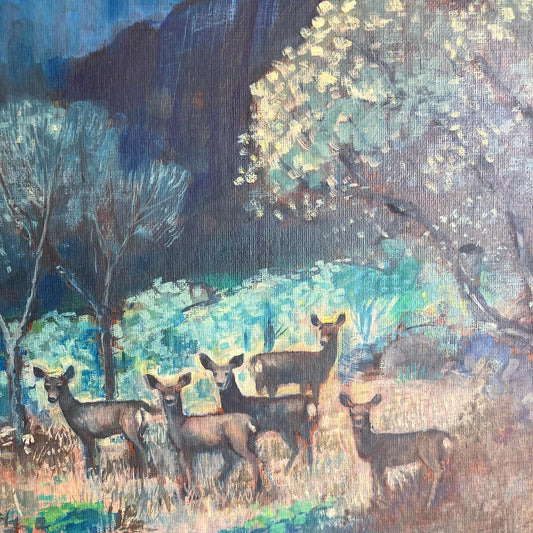 Western American art oil on canvasboard canyon scene with mountain range and a herd of deer at twilight, by Johnson, dated 1967