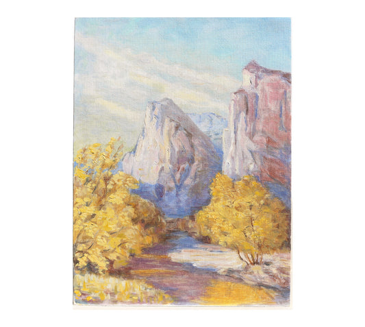Oil Painting Landscape Treescape on Canvasboard "Connecticut Rock Formations with Autumn Fall Trees" Artist Jule Melbardis 1950s