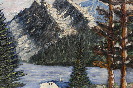 Oil Painting 19th century Oil on Board Monks in North American West Log Cabins Canada Canadian Rockies or American Tetons Mountains