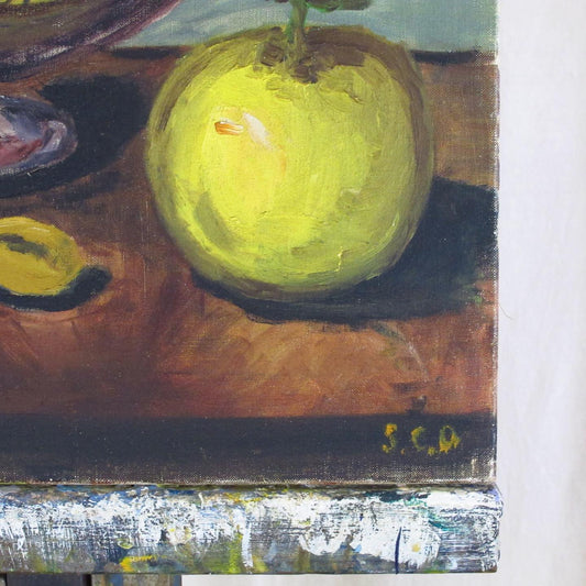 Oil on Canvas Painting, SCD Artist Signed French Still Life of Persimmon, Mangos and Orange Fruit in Compote, c. 1950