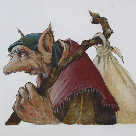 Egg Tempera Fantasy Illustration Portrait of an Ogre or Troll with Knapsack c. 1980