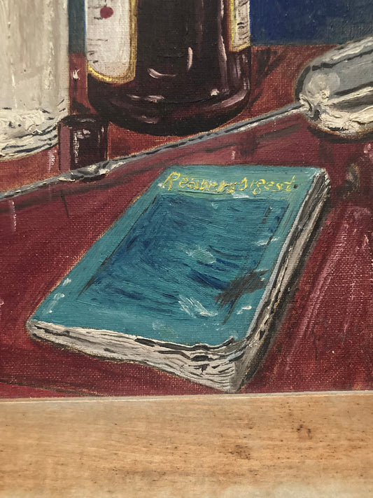 Still Life Painting Naive 1950s Smoking Cigarette with Liquor Bottles and Dogeared Readers Digest and Masonic Symbols