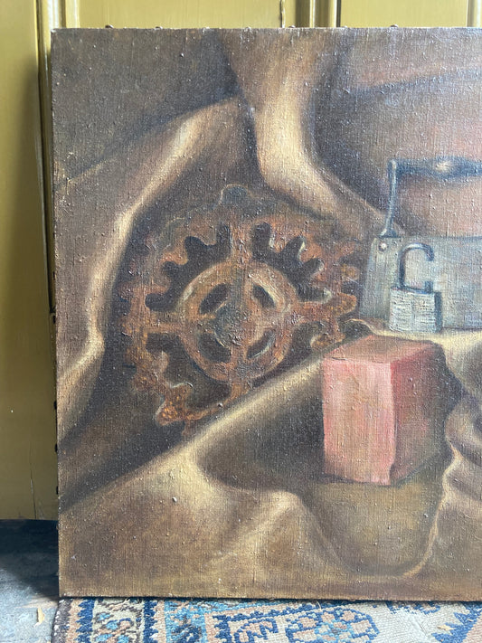Oil on Canvas Painting, Industrial Still Life of Rusty Gear, Lock, Brick and Mandolin c. 1940 1950, artist signed N. Davis