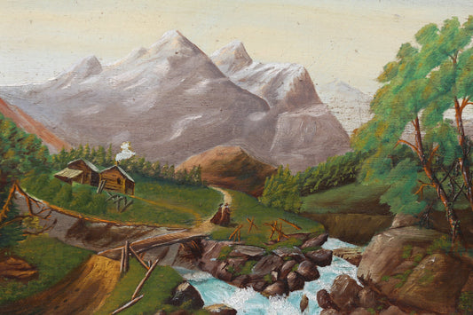 Oil Painting 19th century Oil on Board Monks in North American West Log Cabins Canada Canadian Rockies or American Tetons Mountains