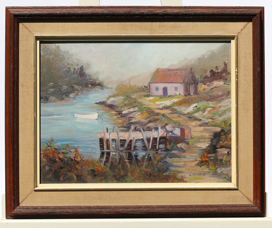 Oil Painting Signed American Impressionist River Harbor Cottage and Dory Rowboat 1970s Period Frame on Board