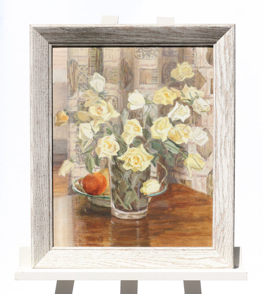 Painting Oil on Canvasboard "Pale Roses" Artist Signed Jule Melbardis 1950s Yellow Roses Modernist MCM Mid Century Modern Realist
