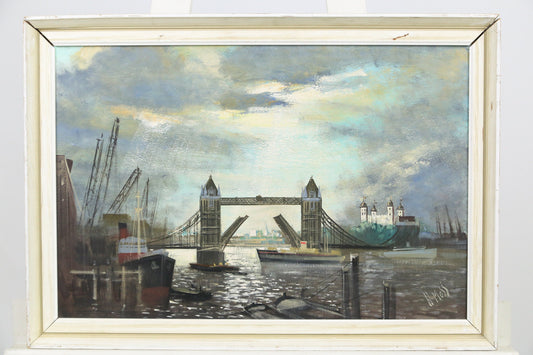 Oil Painting London England Cityscape Tower of London Bridge Harbor River Thames Signed H. Moss 1950s UK English