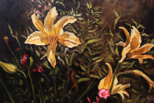 Oil Painting Still Life Moody on Board Day Lilies and Wildflowers Artist Signed J. Palmer Libby 1993