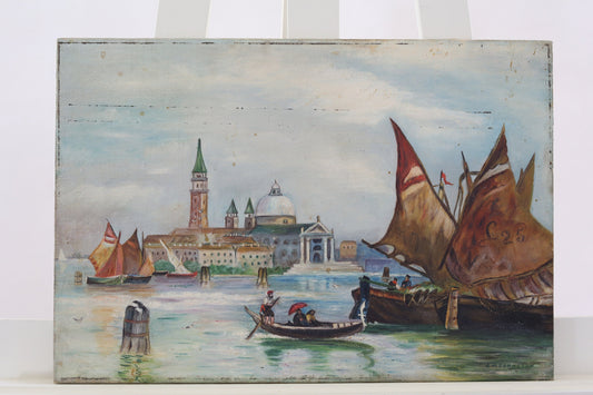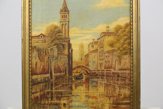 Painting on Canvas Venice Oil on Canvas ca 1900-1910 Signed GM Johnston Original Harbor Nautical Italy Antique Grand Canal Gondolas
