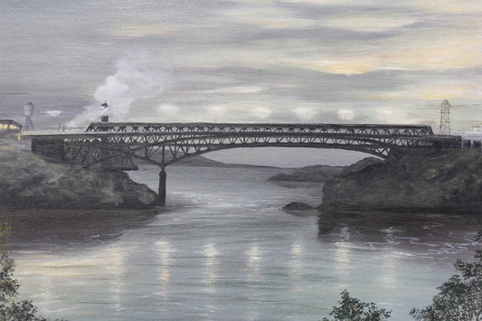 Oil Painting Reversing Falls Bridge St. John New Brunswick Canada Foggy Artist Signed Nardini 1950s on Canvas board