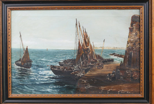 Painting Seascape Oil on Canvas Harbor Boats Signed A Bain 1911 Framed
