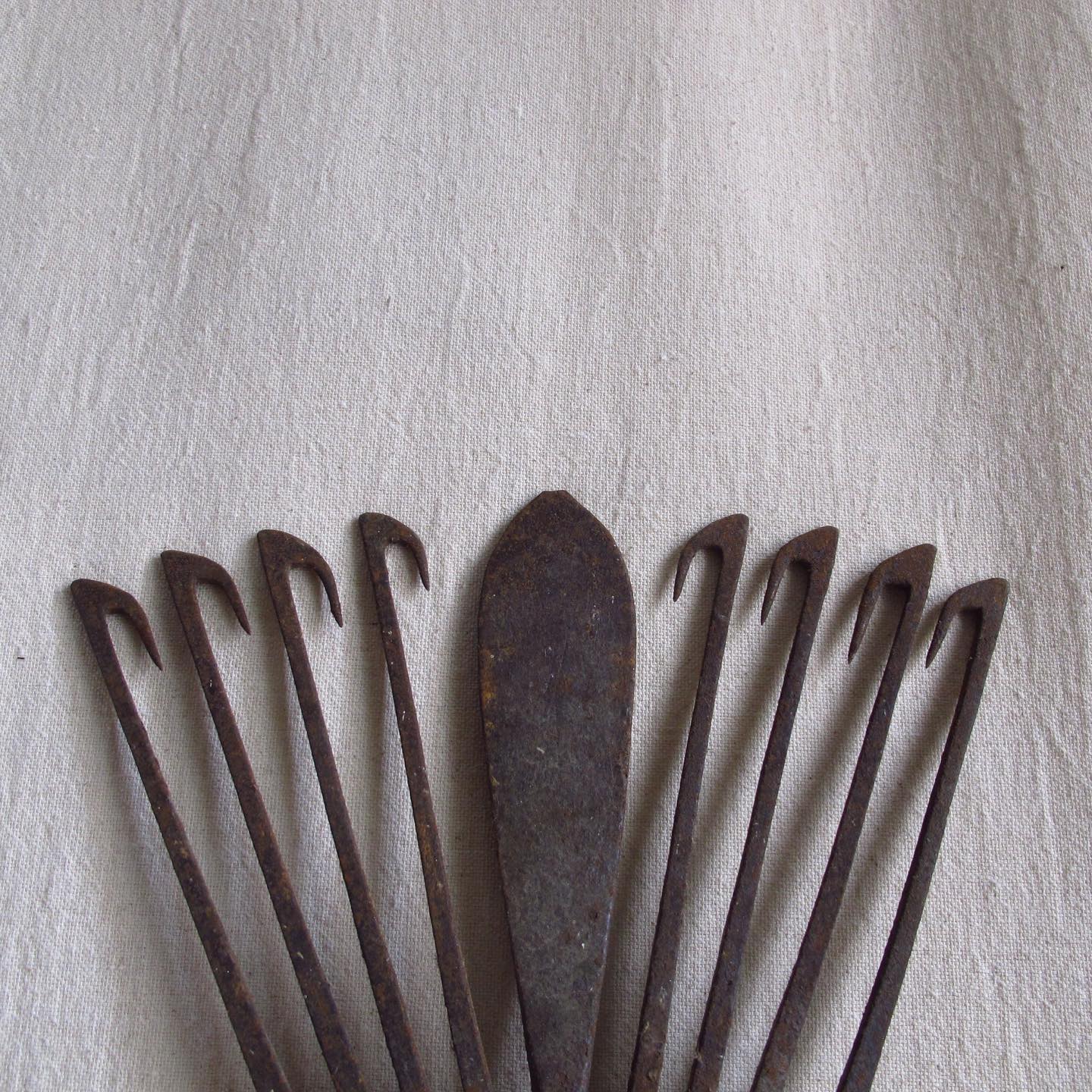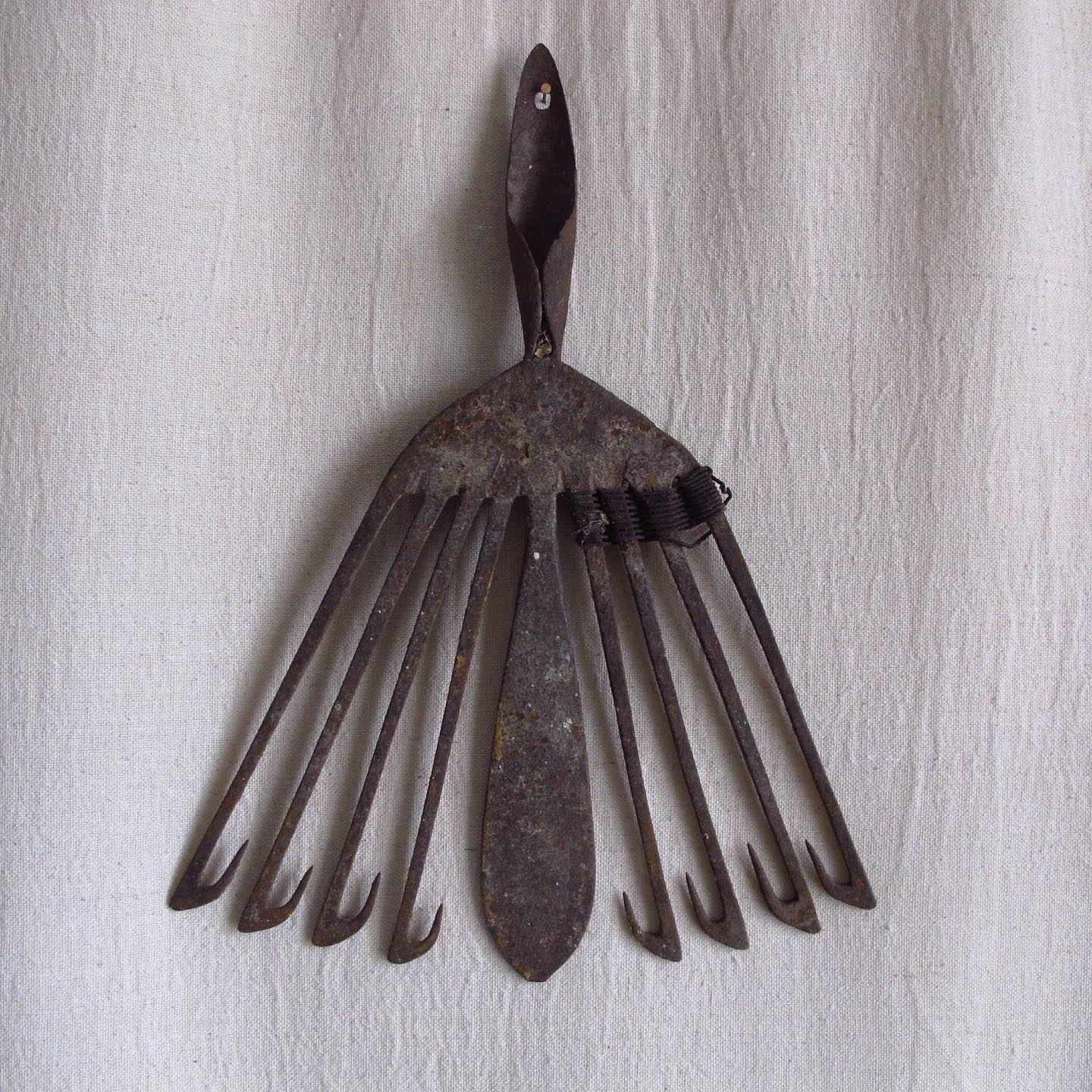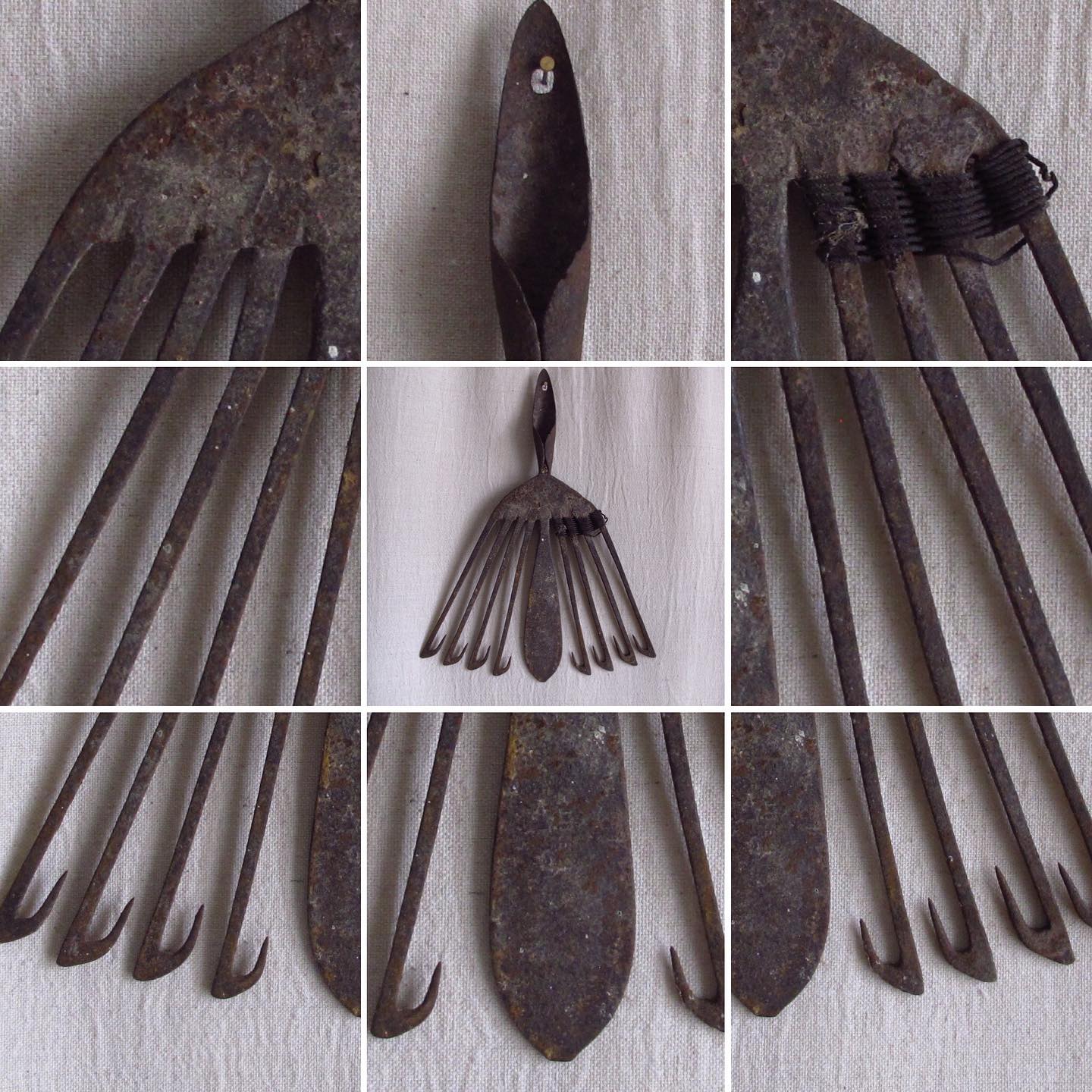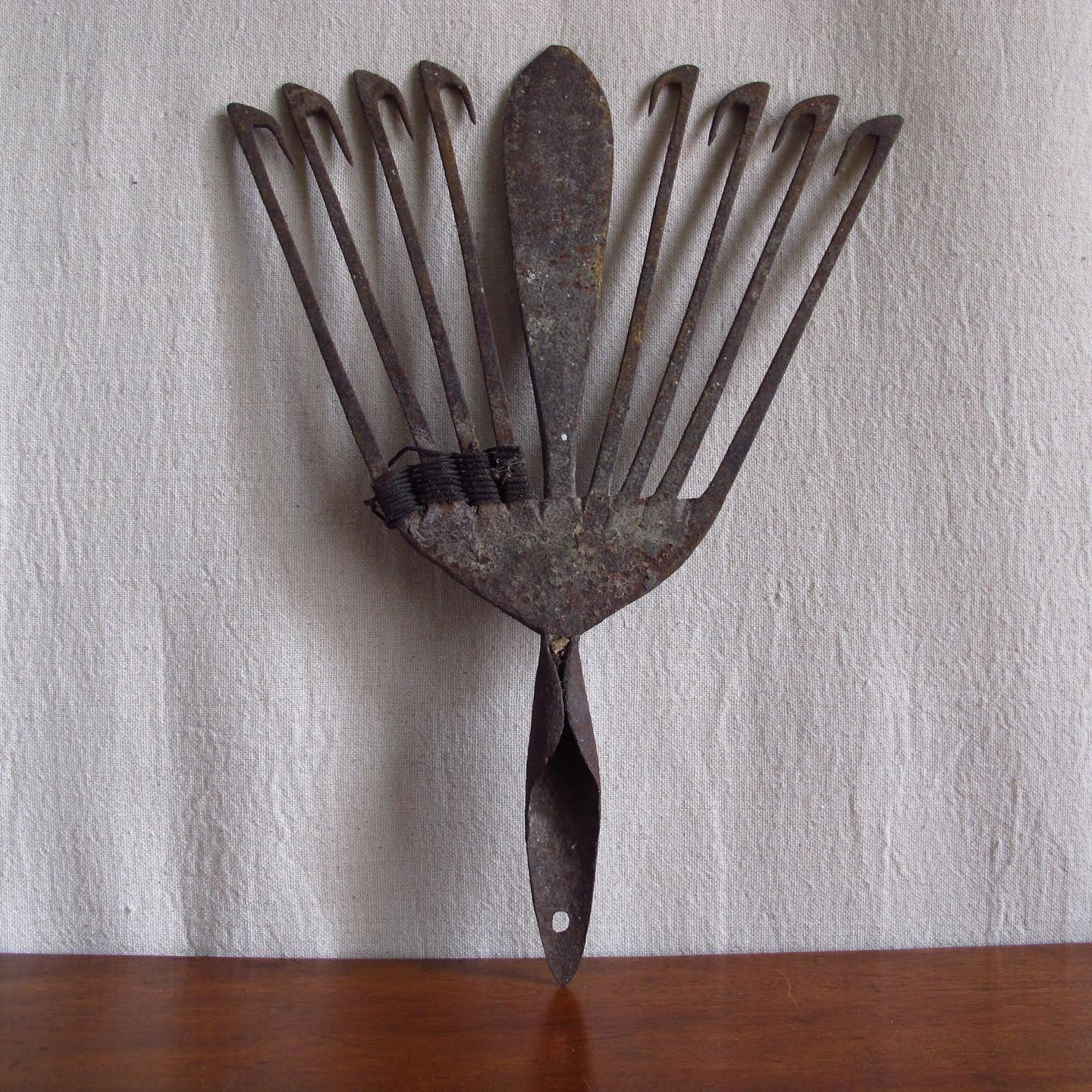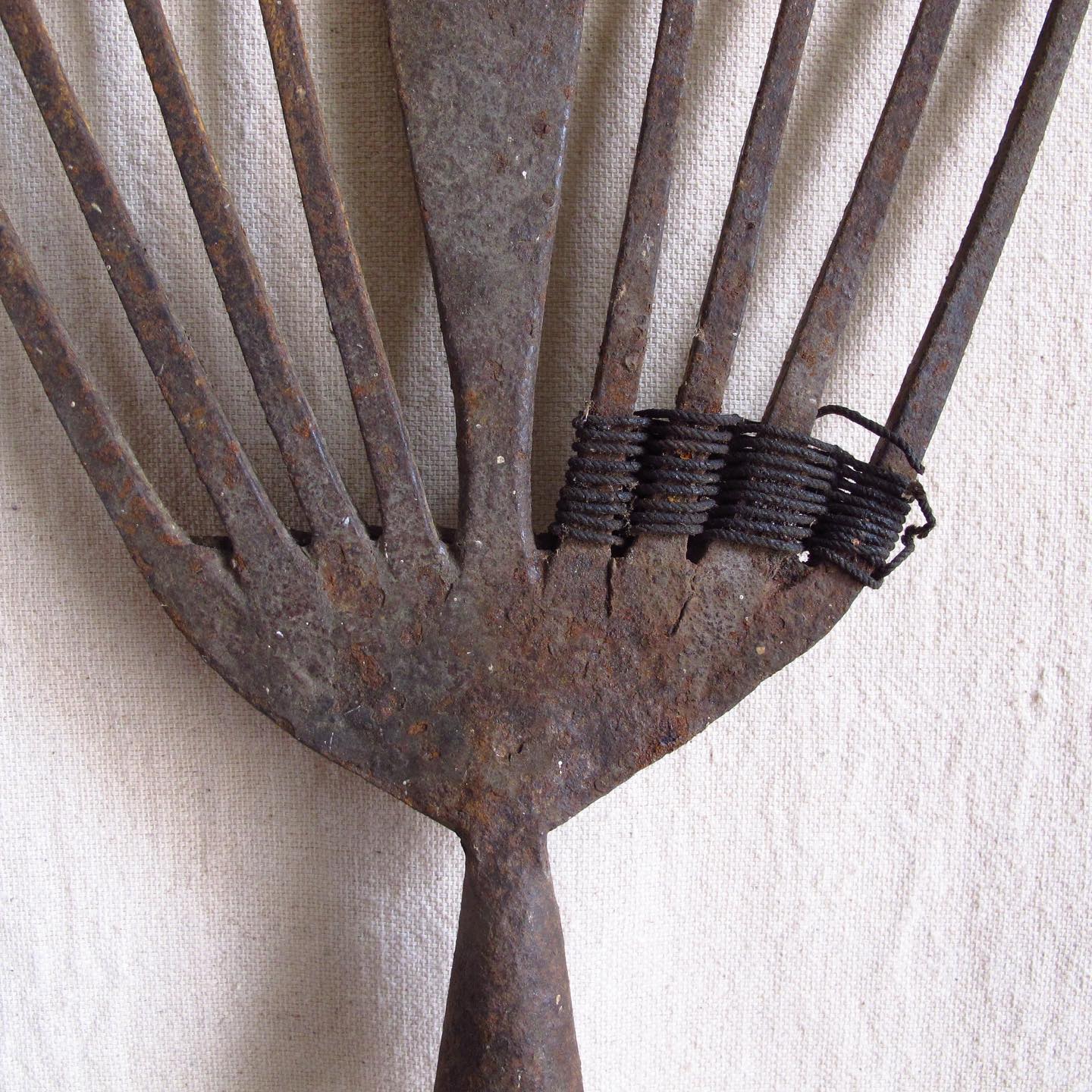Wonderful and sculptural. The laces do not appear to relate to failing structure on the rake itself, but some how mostly missing function. Big graphic punch on the wall.