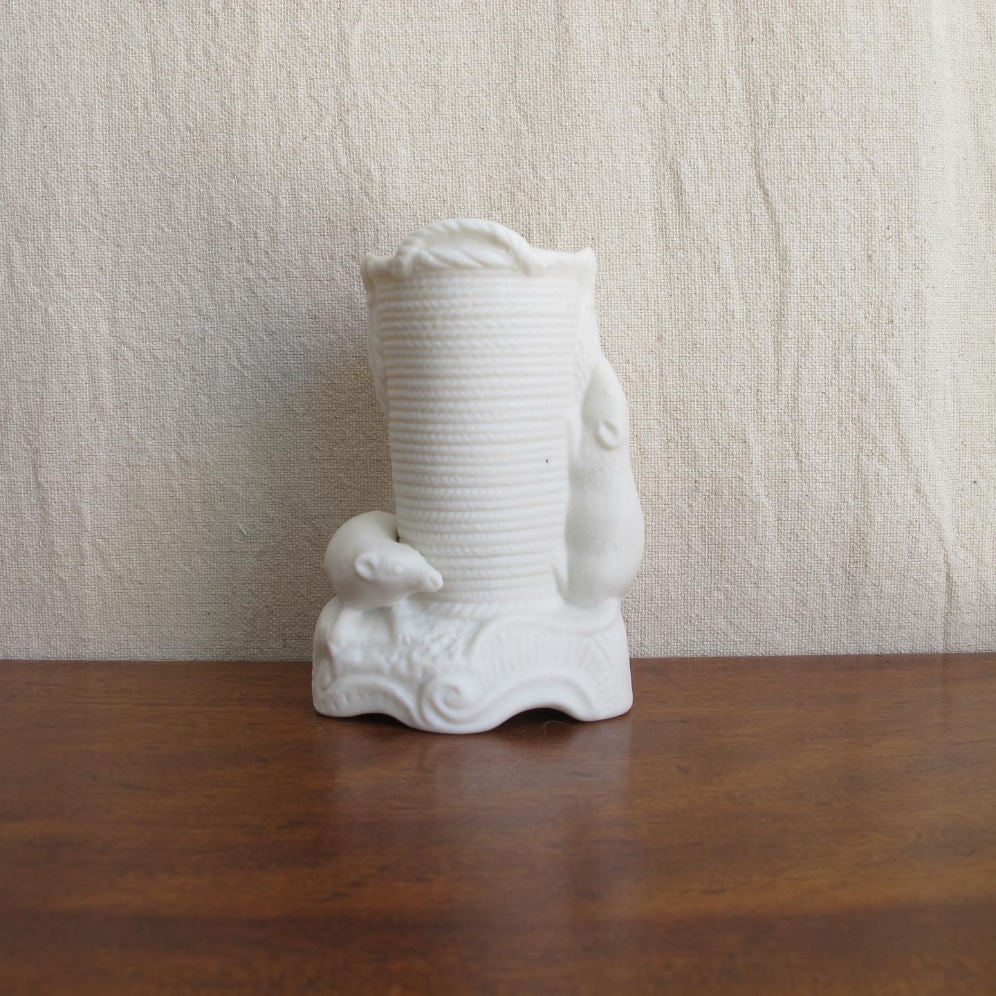 22SU_105_D8 Available. Parian porcelain vase with figural mice, exploring a coil of rope, extremely rare, c. 1860 1870, 4.625” T x 3.25” W x 2.5” in diameter