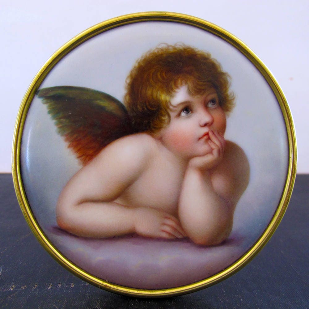 On offer an exceptional quality KPM or KPM quality, possibly Hutschenreuther hand painted porcelain plaque depicting one of Raphael's angels from the Madonna di San Sisto. This plaque is signed as shown on the reverse, and may be marked KPM in a location covered by the gilt brass band. Quite charming and the height of Victorian taste of the 1880s -- 1890s. This may have been set into a frame to be viewed on the wall, or possibly into the top of a jewelry box or music box. Comparable confirmed KPM plaques are sold for thousands -- and this is absolutely of that quality.