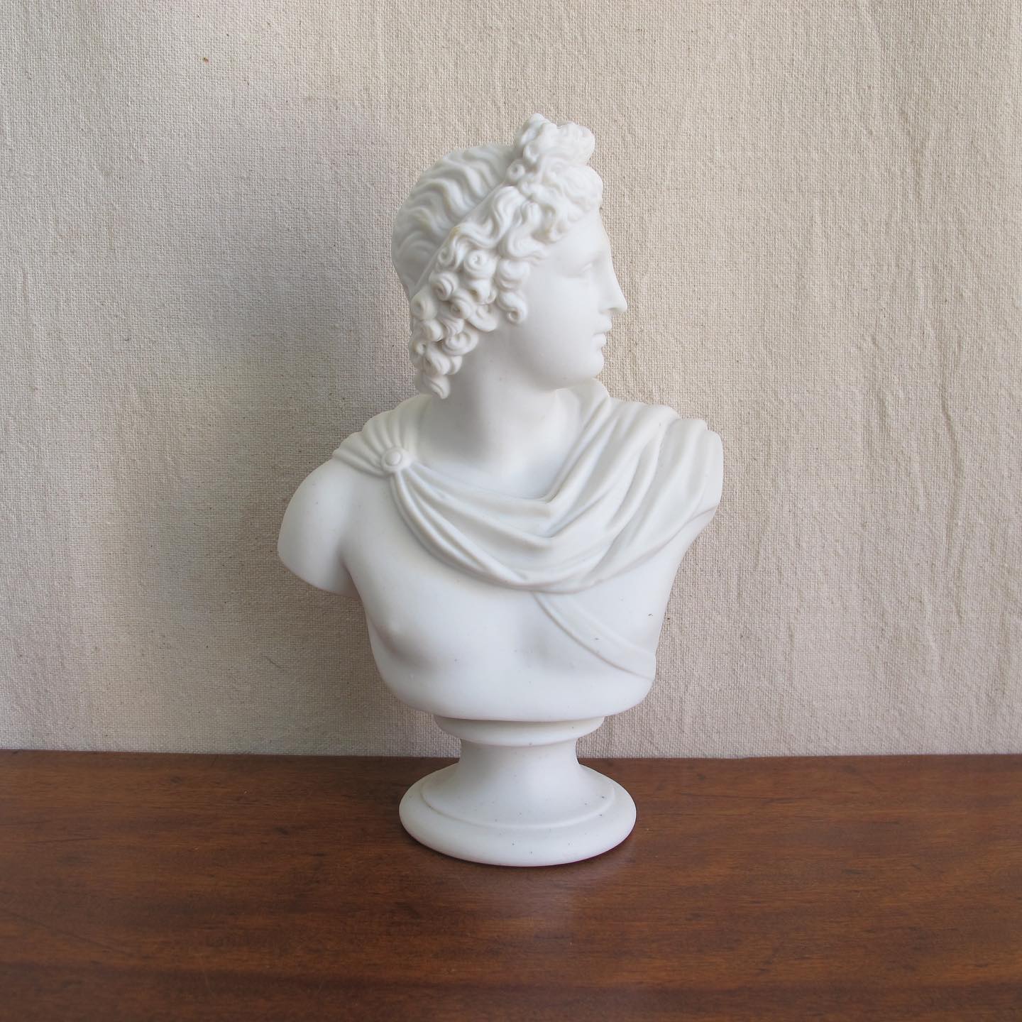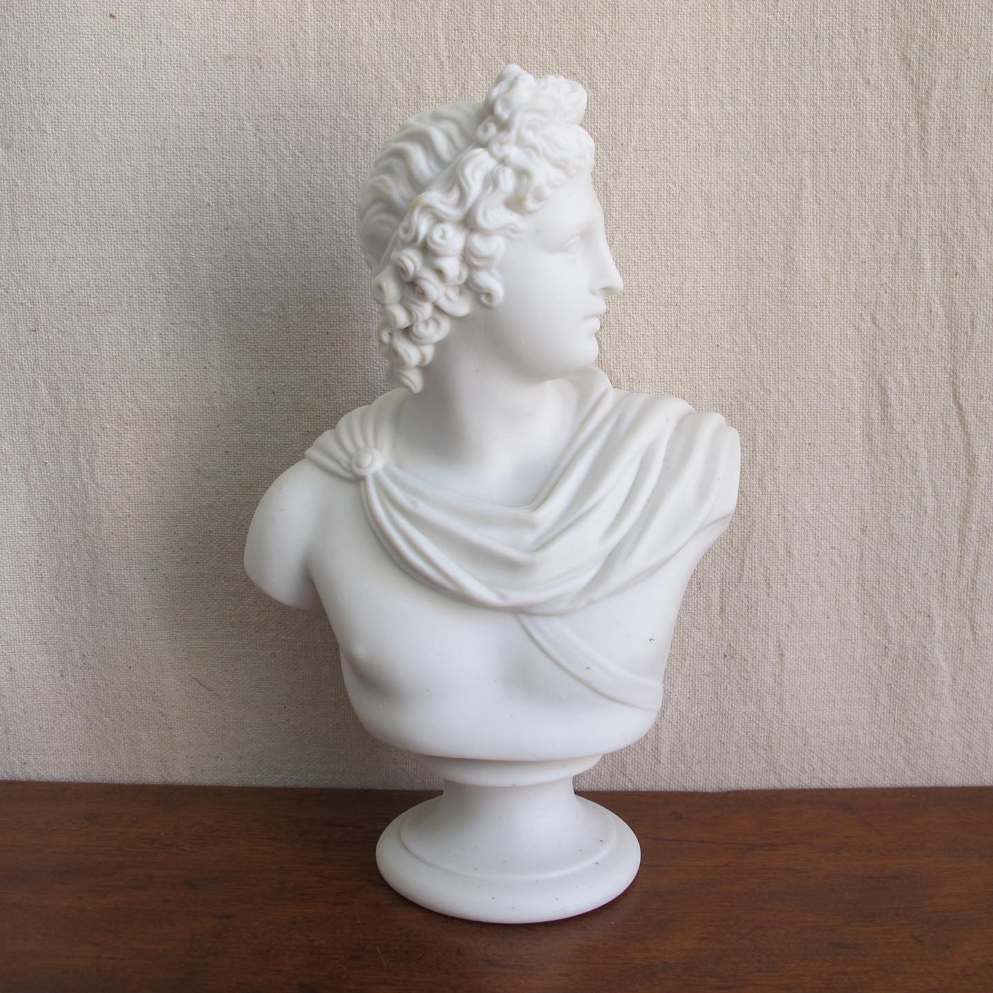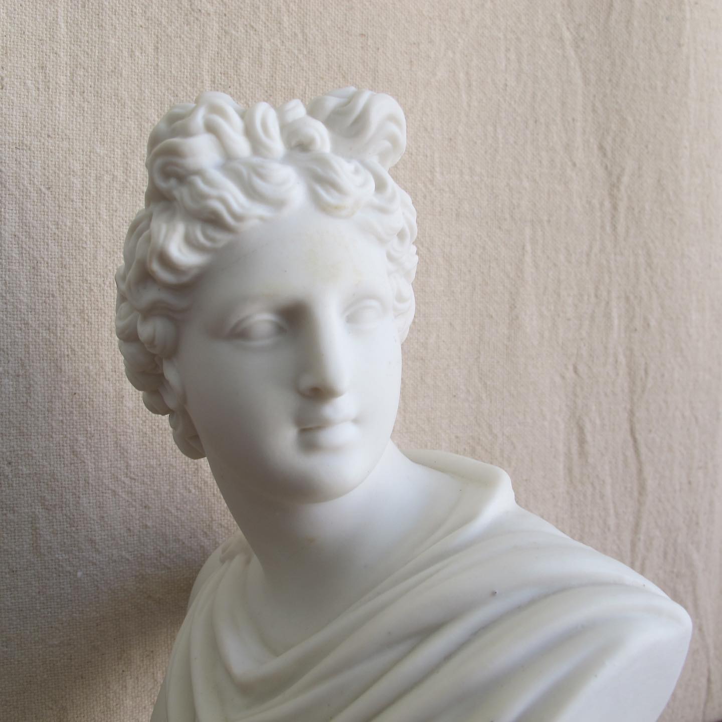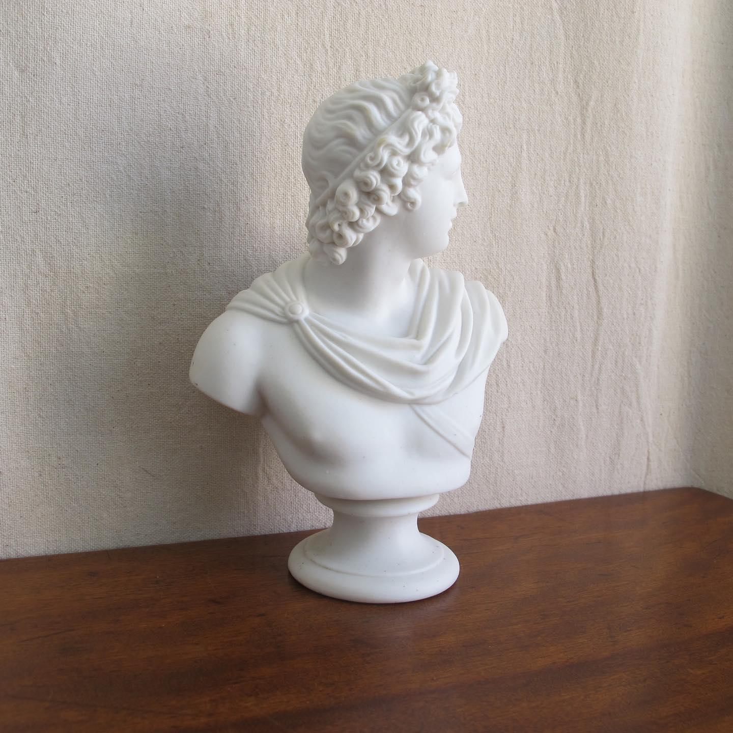 Apollo Belvedere Parian Grand Tour bust, c. 1860, 9” T x 6” W x 3” D, typical slight marks, flecks where the socle meets the figure, as shown, overall very good condition.