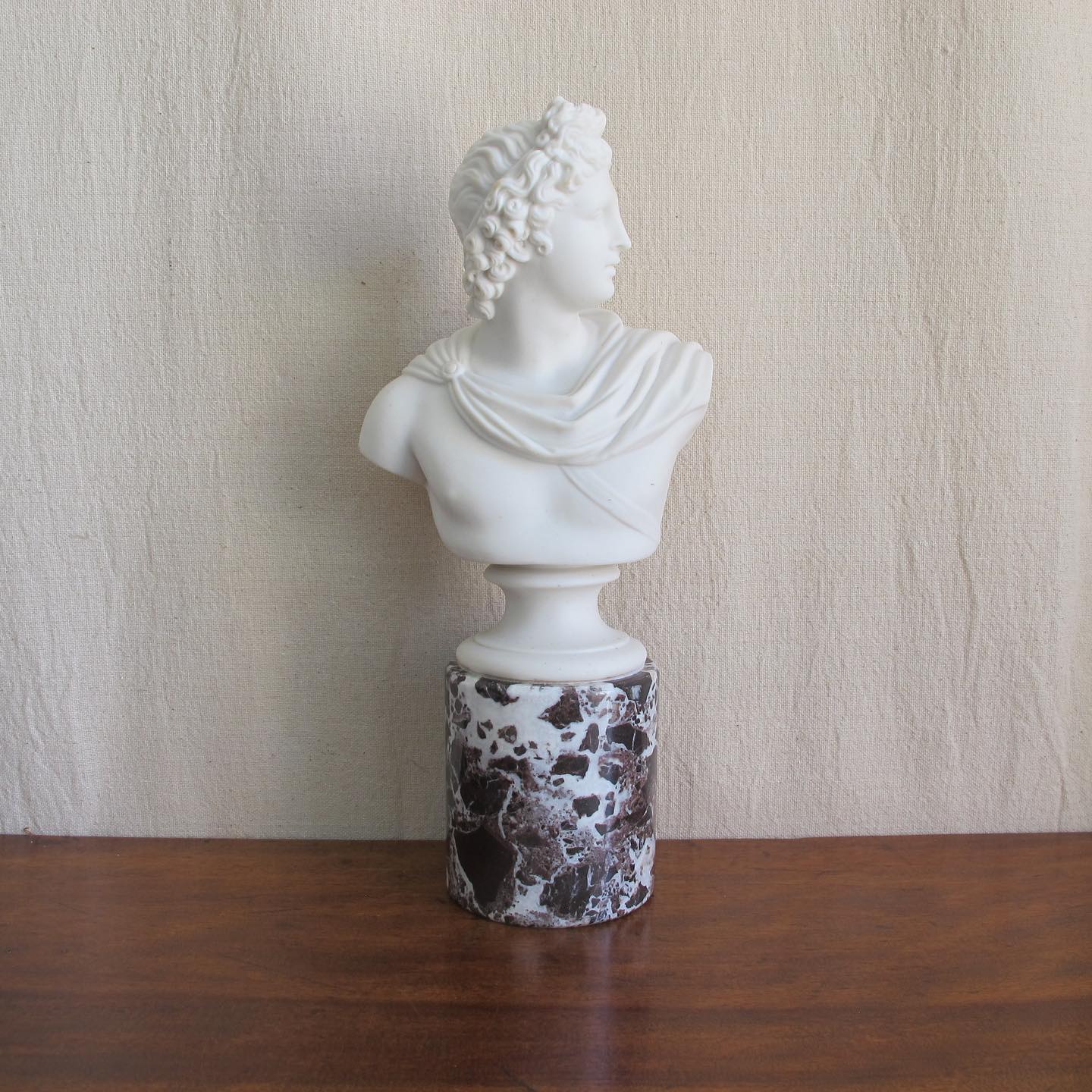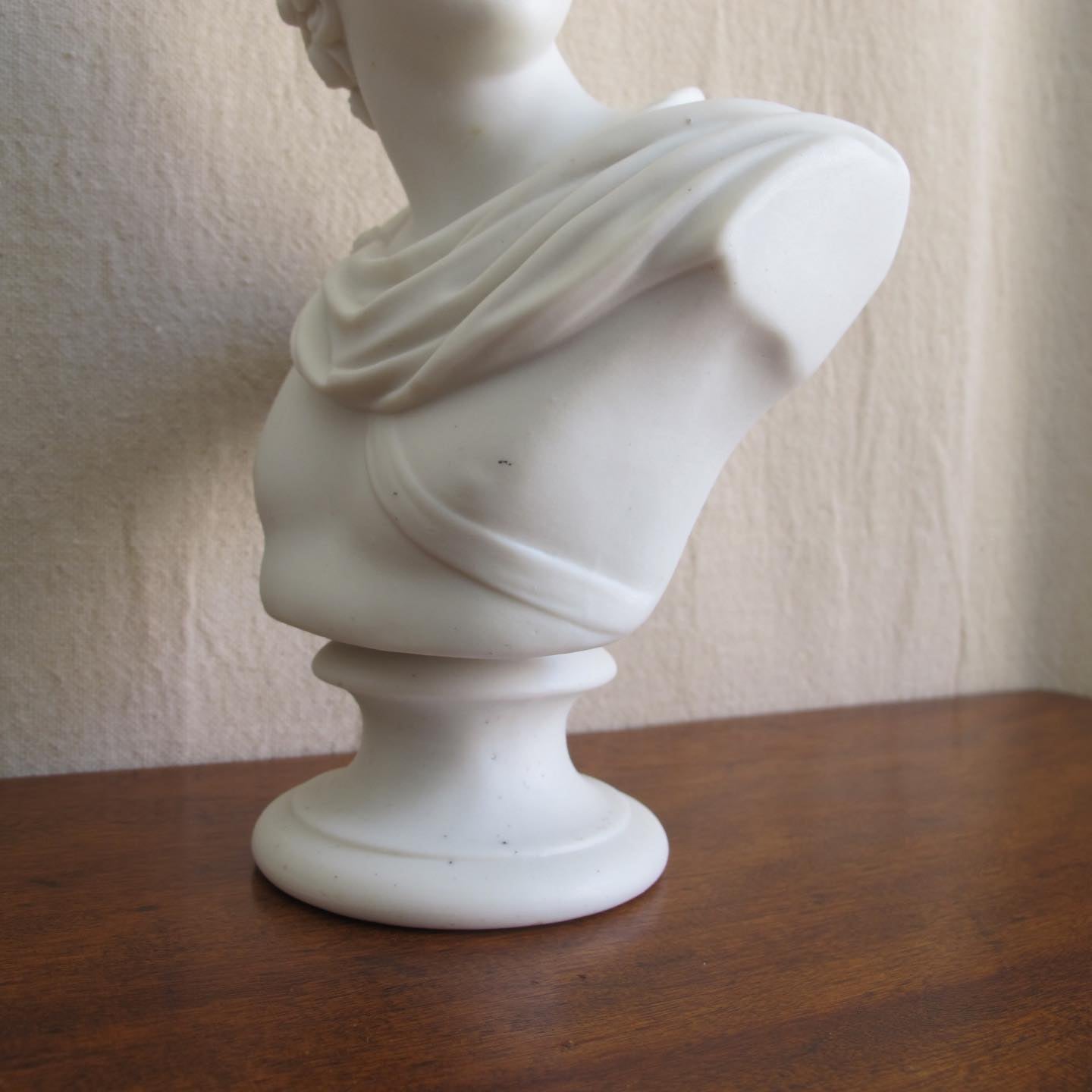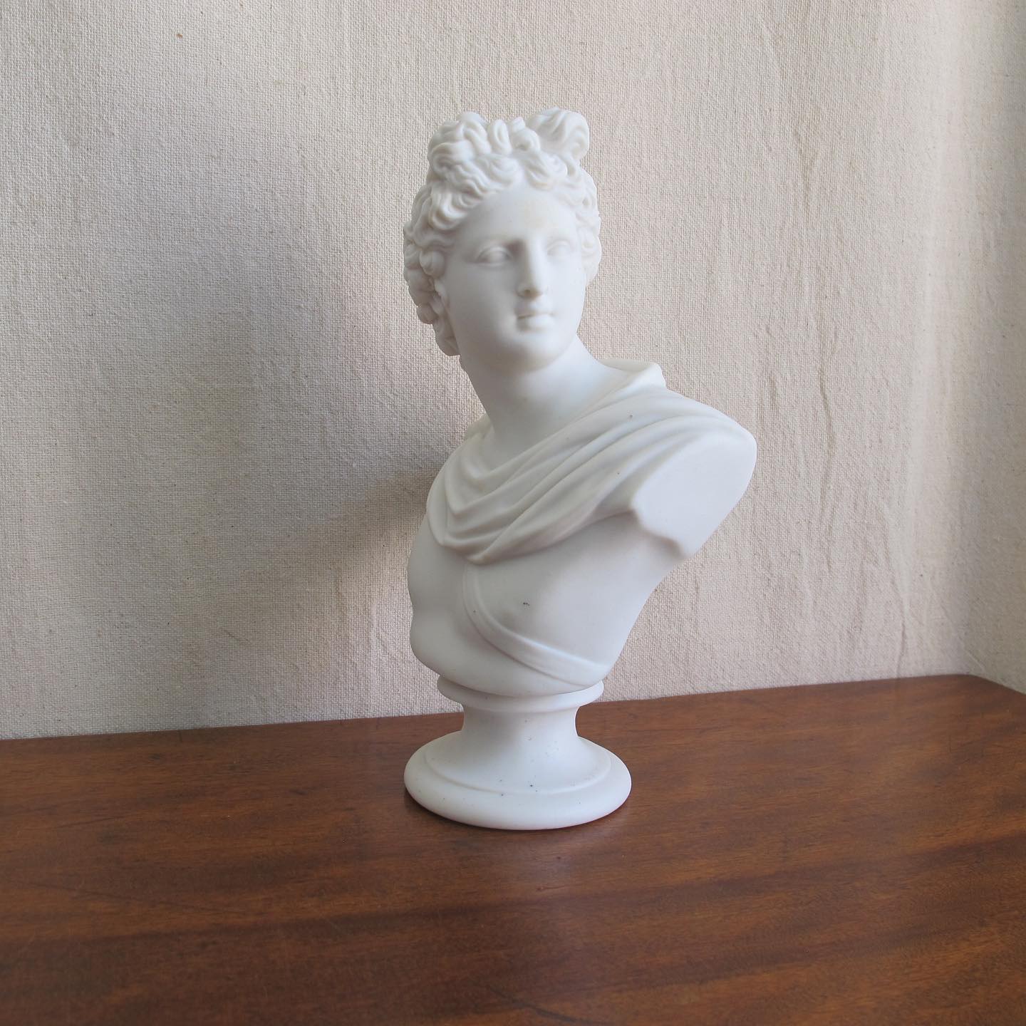 Apollo Belvedere Parian Grand Tour bust, c. 1860, 9” T x 6” W x 3” D, typical slight marks, flecks where the socle meets the figure, as shown, overall very good condition.
