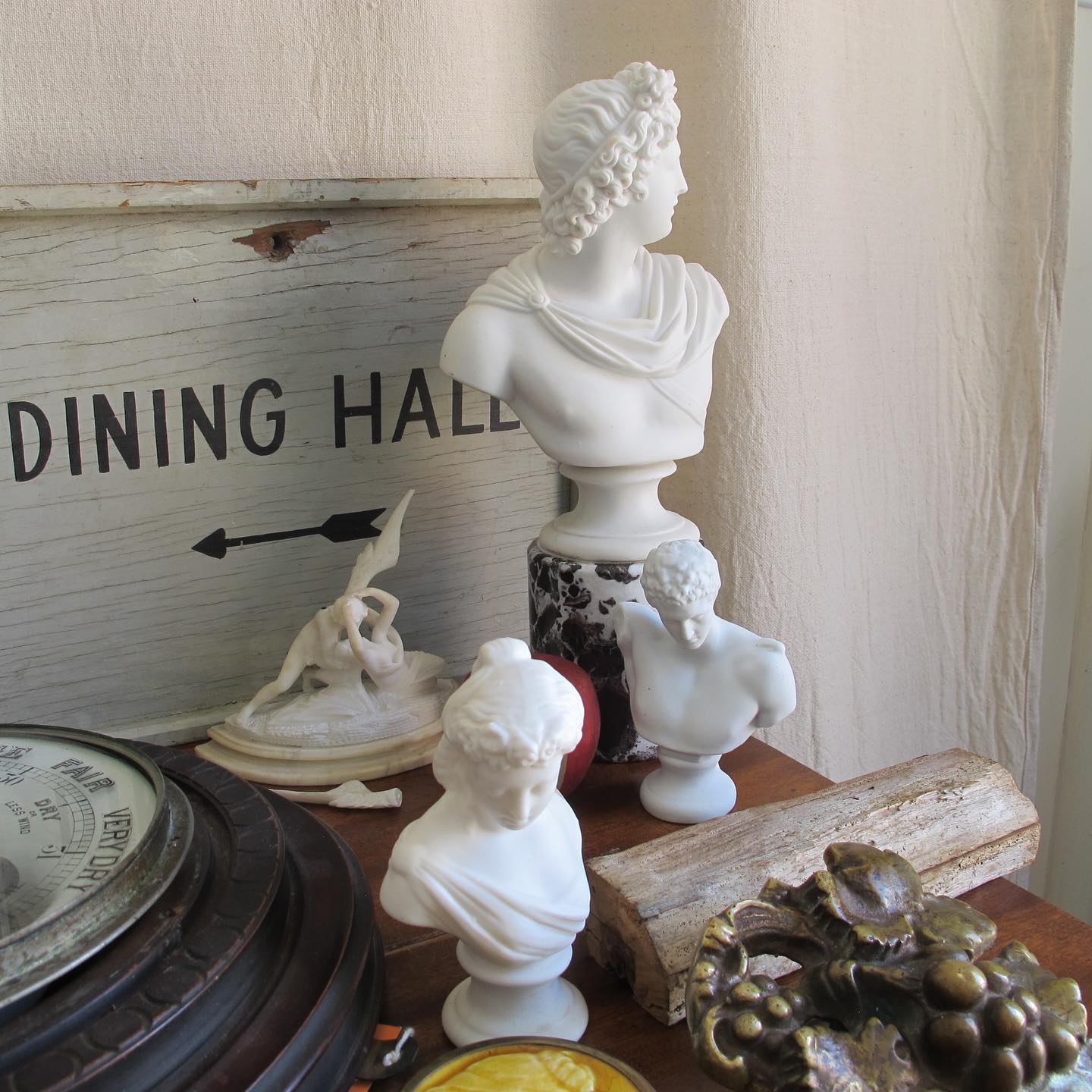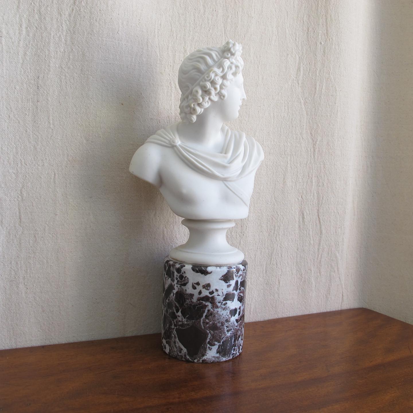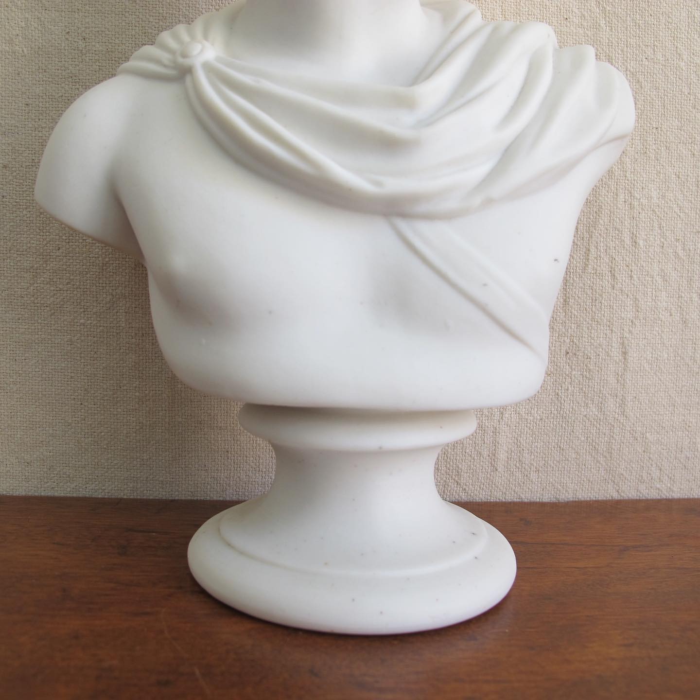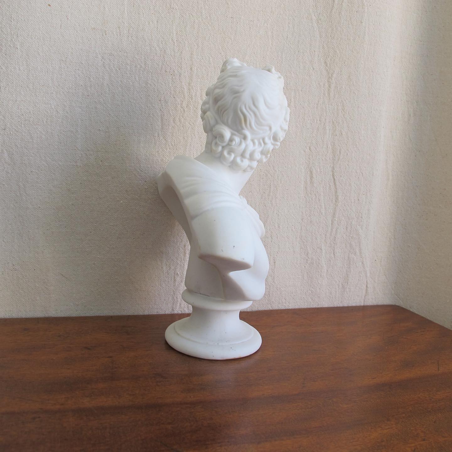 Apollo Belvedere Parian Grand Tour bust, c. 1860, 9” T x 6” W x 3” D, typical slight marks, flecks where the socle meets the figure, as shown, overall very good condition.