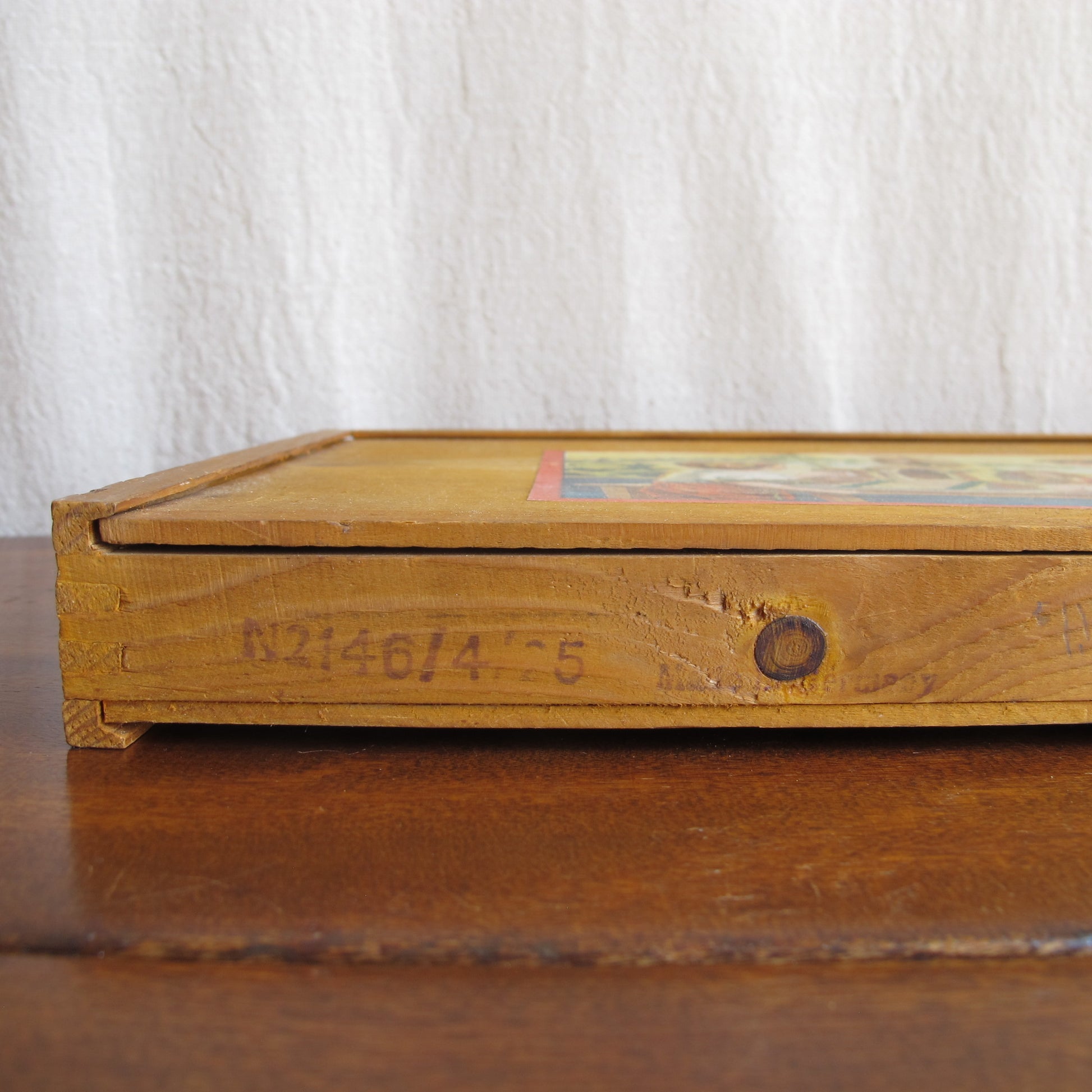 Architectural toy building block set in wood with paper and mica made to look like windows, with printed ashlar bricks, arches, turned balustrade, and other architectural forms, made in Germany, c. 1920. The cover illustrates how the blocks can be used -- a seemingly complete set. Unusually small and charming.