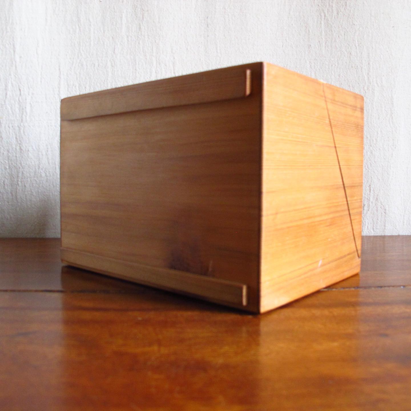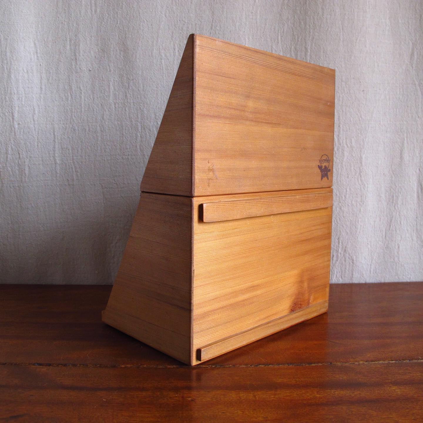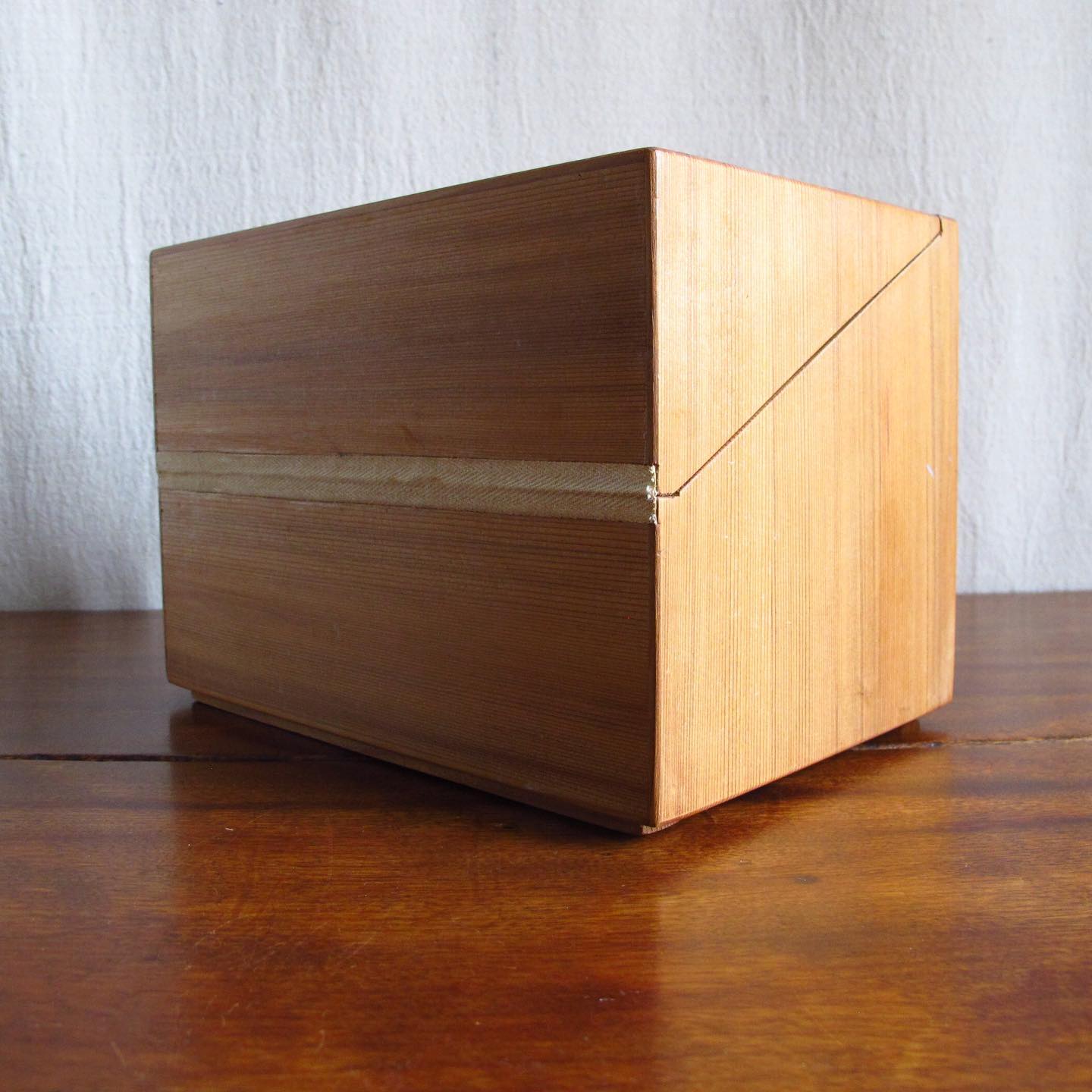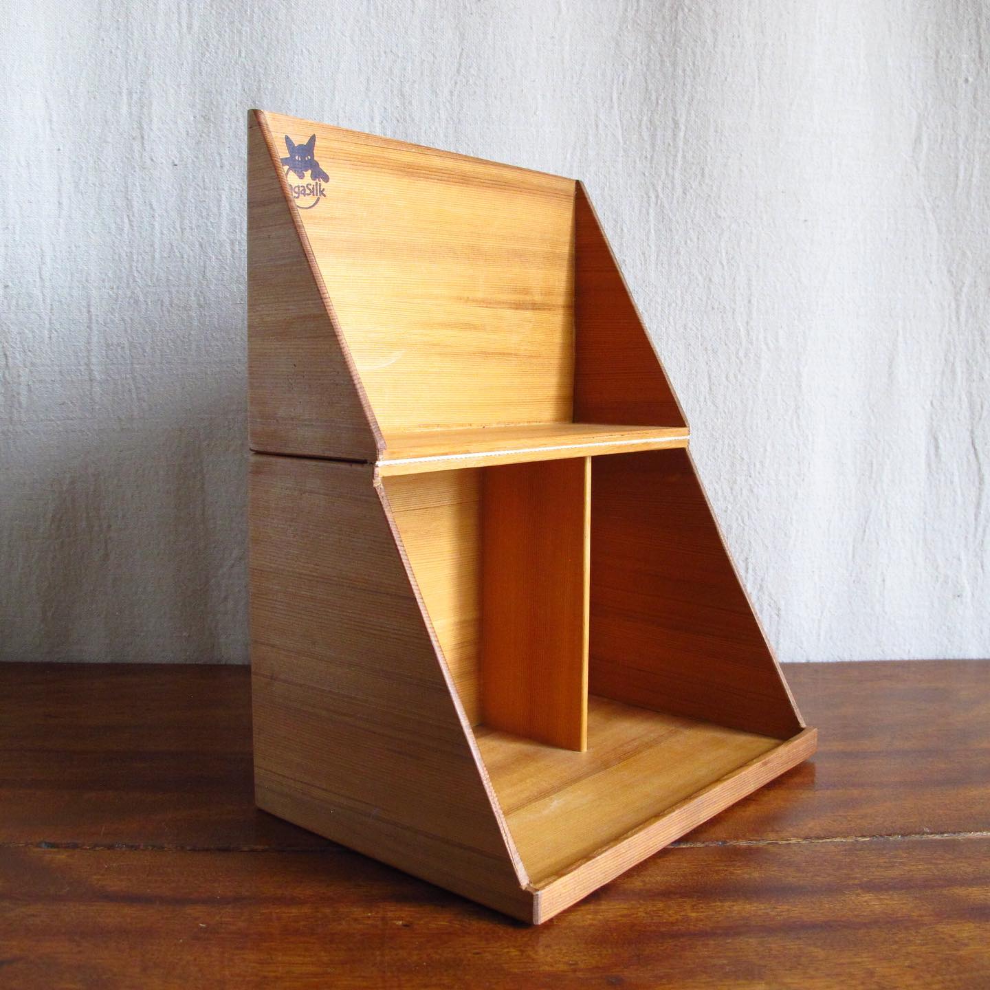 Artisan made midcentury wooden box or desk organizer, Canadian or possibly Japanese, signed to bottom illegibly, dated 1952. Note the singed cat logo, impressed on both the interior and exterior.
