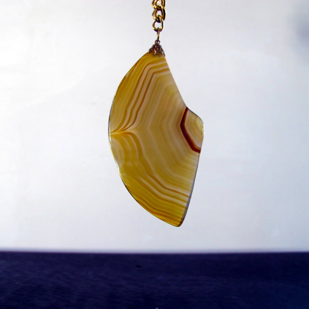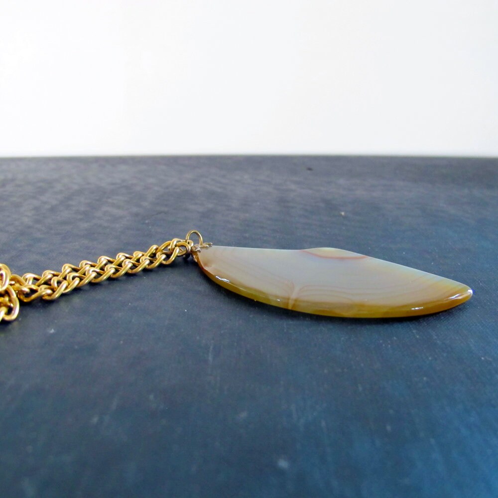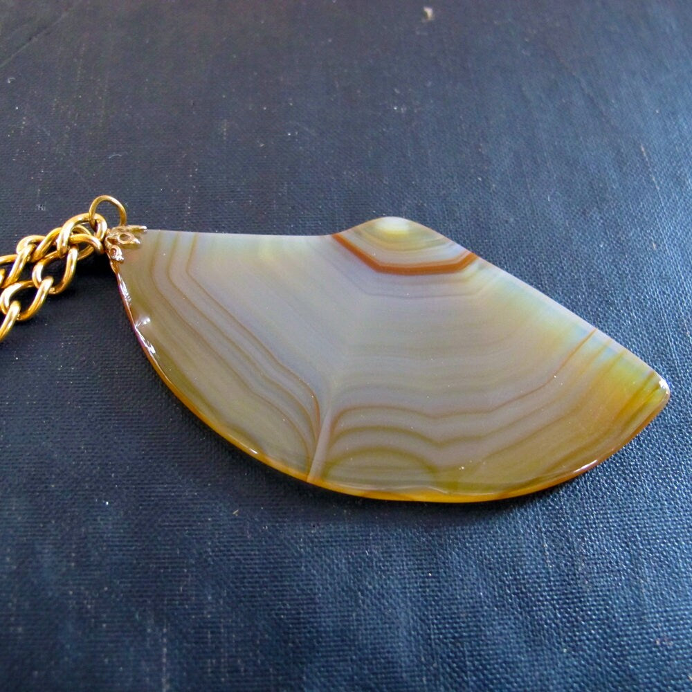 On offer an banded agate necklace set in goldtone prongs with goldtone necklace chain. This is an original piece of costume jewelry set with semiprecious banded agate in the 1970s. Natural undyed color. True bohemian style!