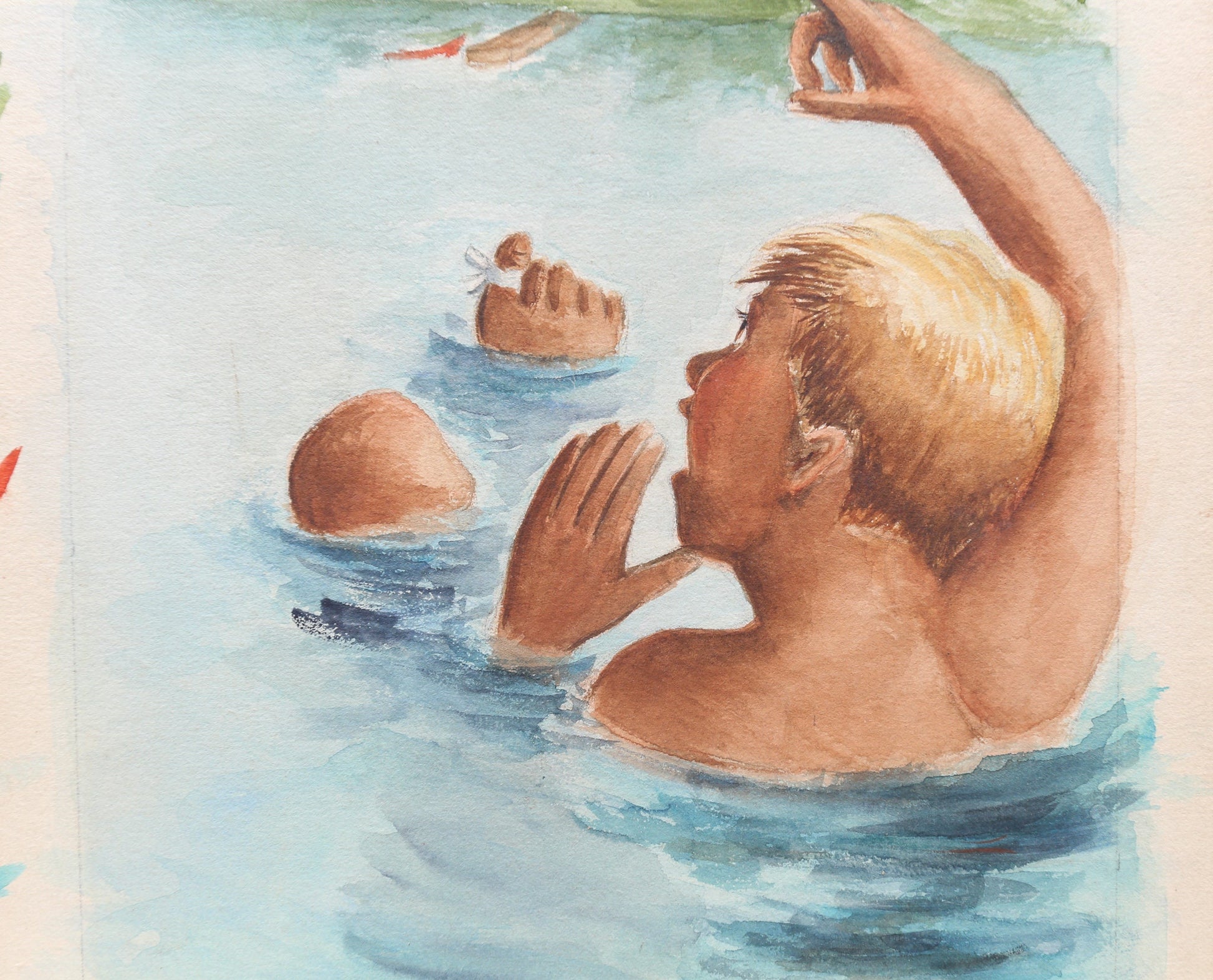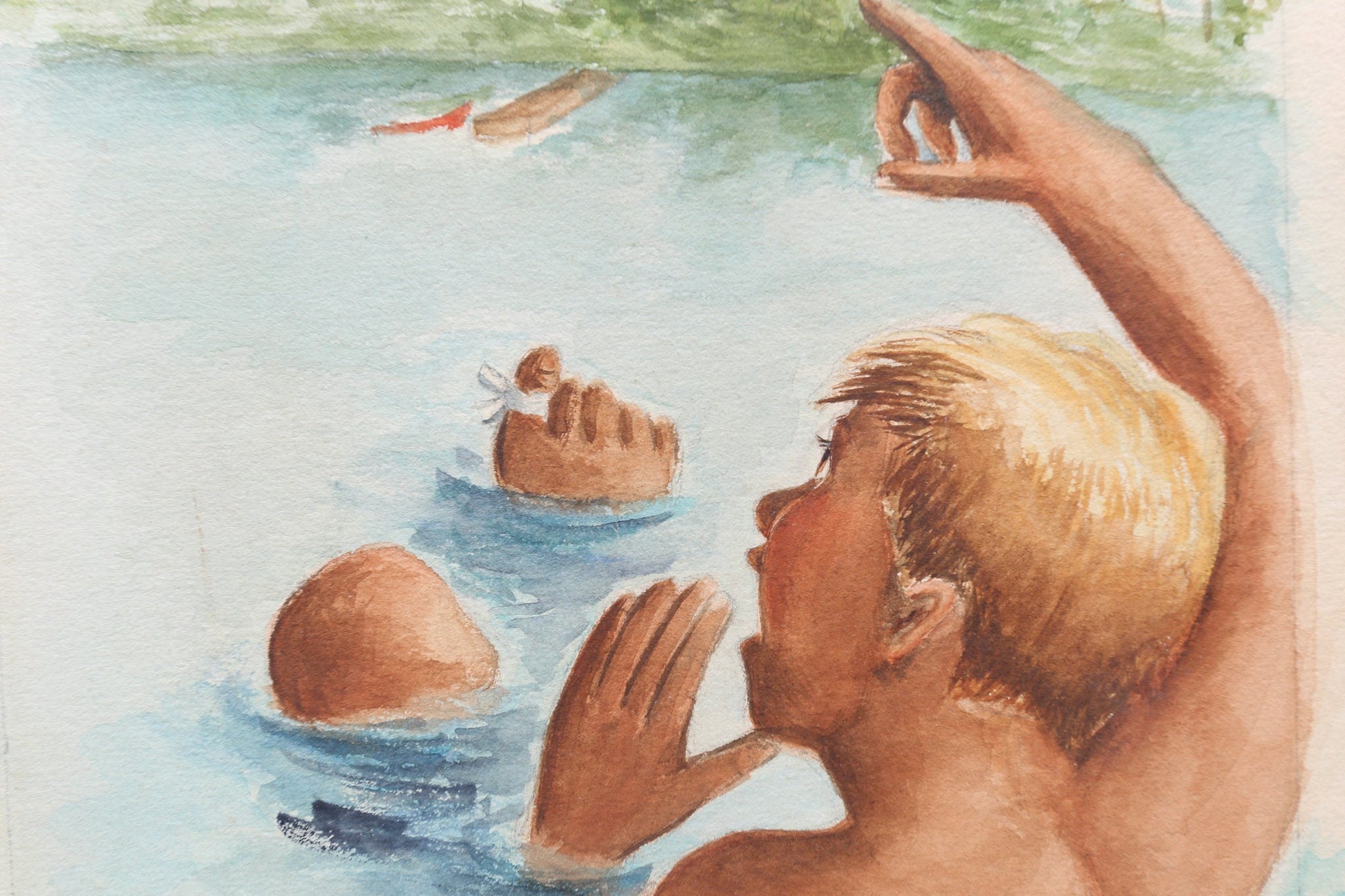 Boys Playing in Lake Watercolor Gouache Painting Louise Rosen II