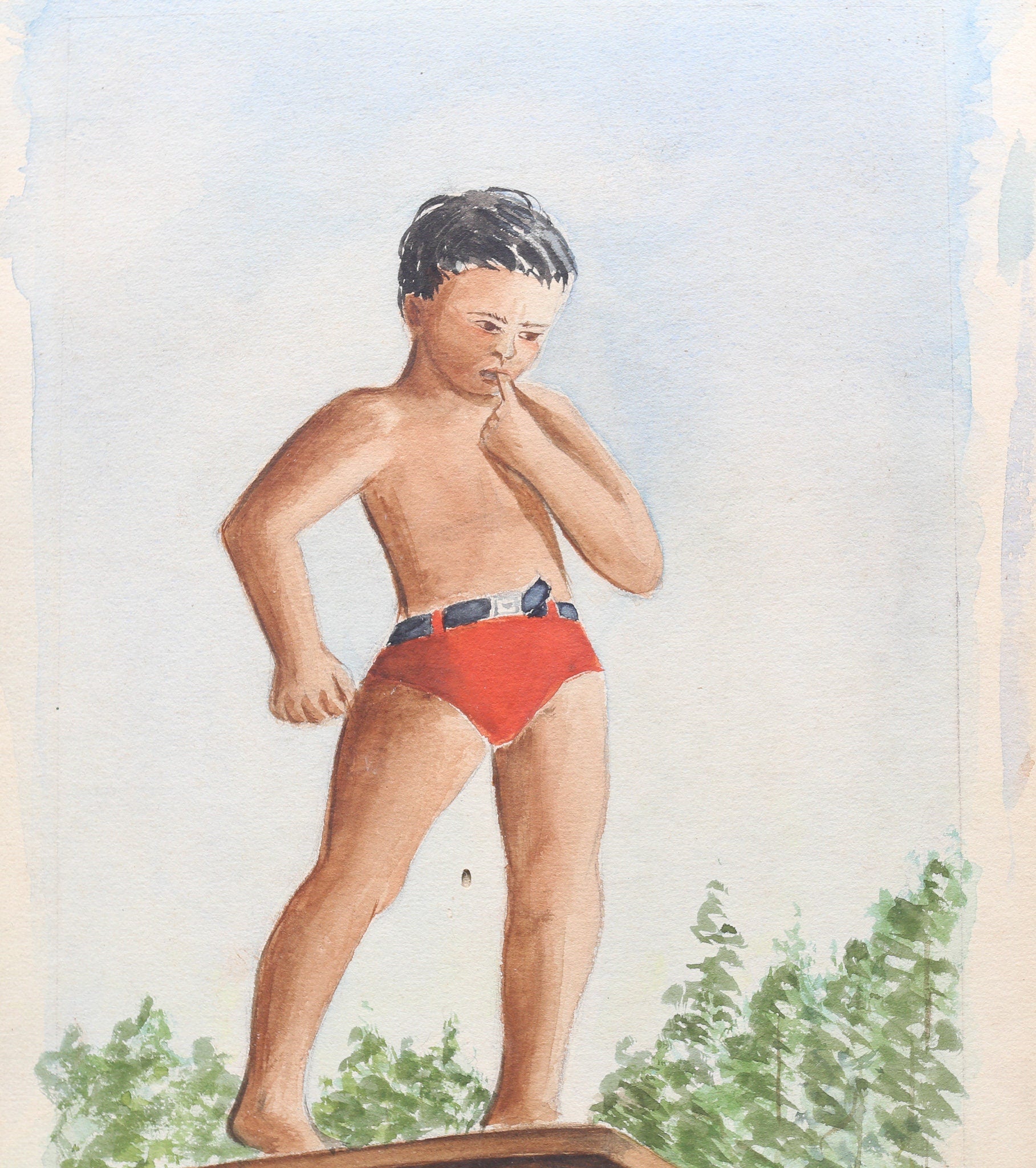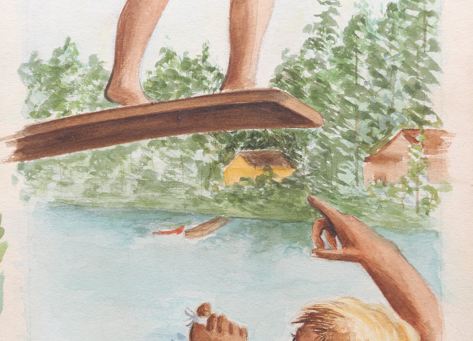 On offer watercolor gouache illustration on board depicting a pair of boys swimming. This illustration was clearly some sort of cautionary tale. One of the boys stands in terror on the diving board, while another boy with an injured toe beckons him to jump. Perhaps the intent of this image was to show the injury that comes from lack of caution. Bright, clear colors throughout. Swimsuit in 1930/40s style. This is one of many original pieces of illustration art by artist Louise Rosen check my other listings.