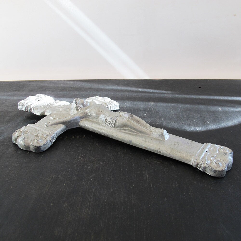 On offer a late 19th, early 20th century cast iron coffin or casket cross that would be given to the family after funeral services. Note the curvature of the form, made to accommodate the coffin lid. This is one of the larger one's I've seen, and significantly heftier than most -- there are others on Etsy that are not as large, as old or similar but damaged -- but this one is perfect. Simply the best casket crucifix you'll find.