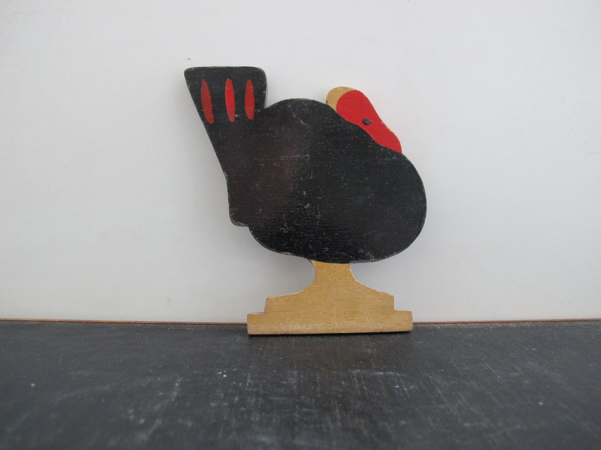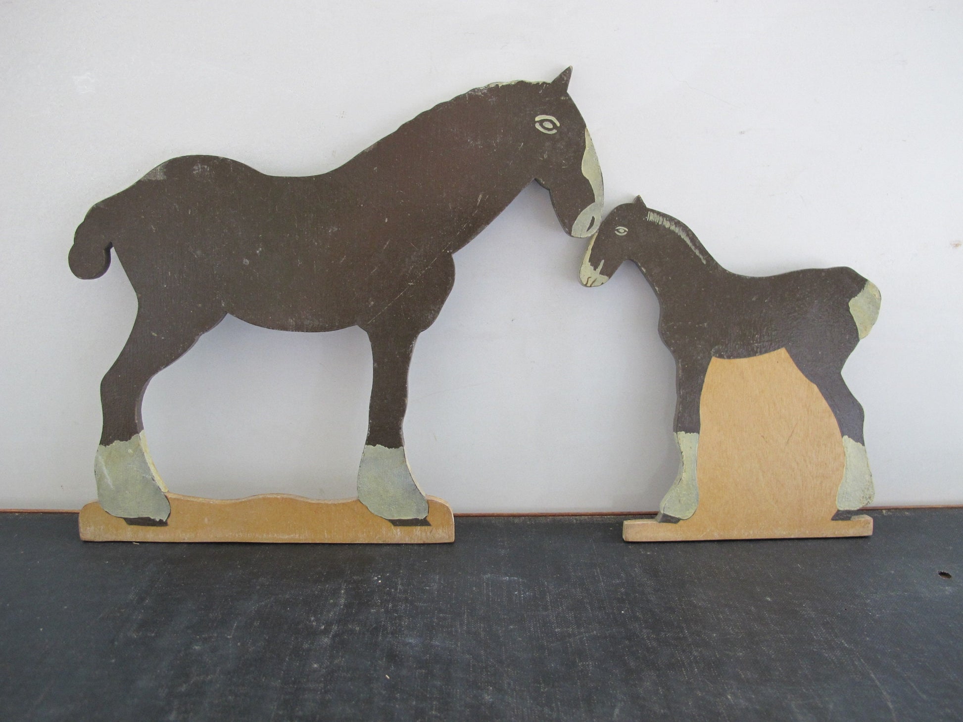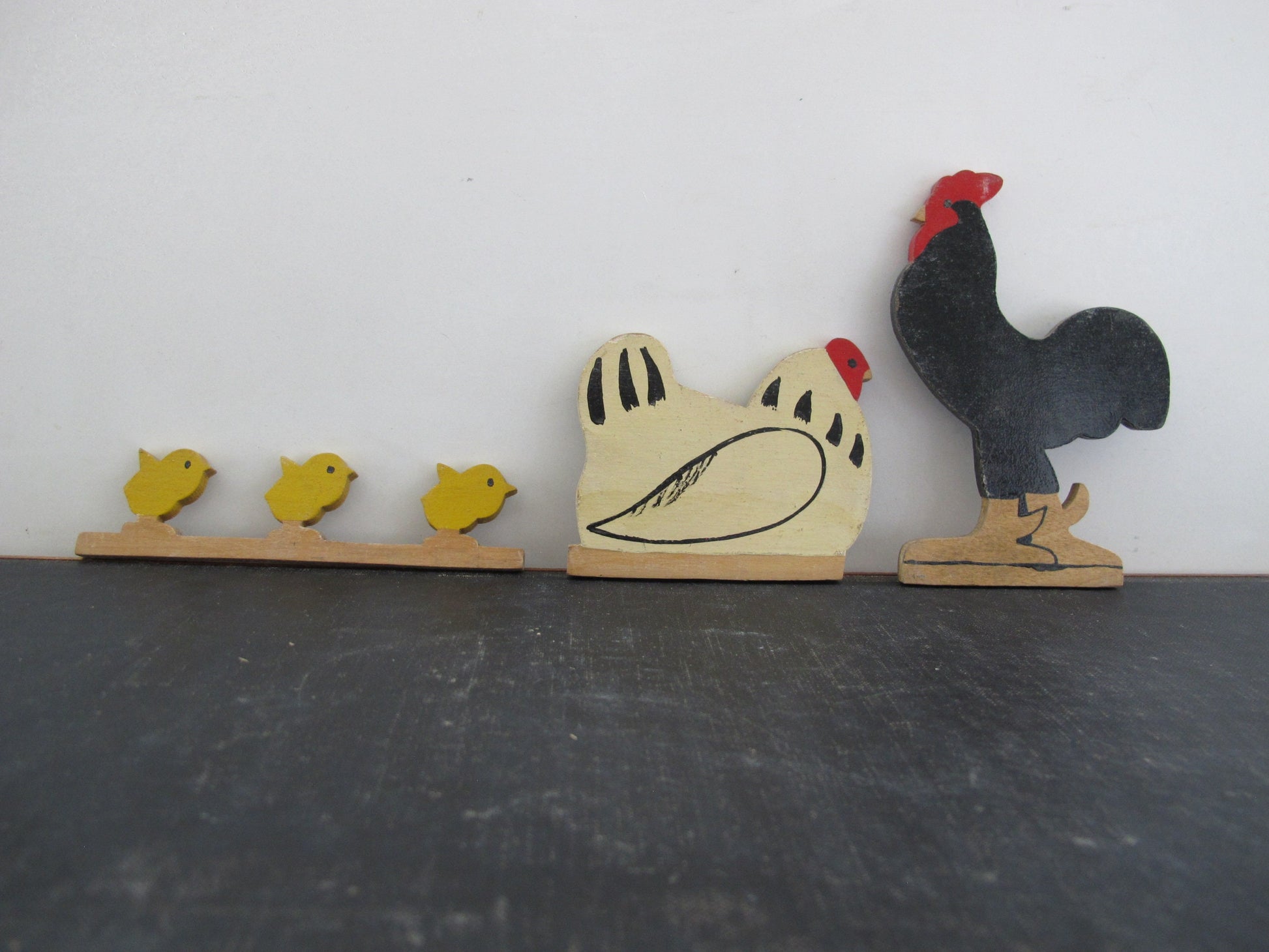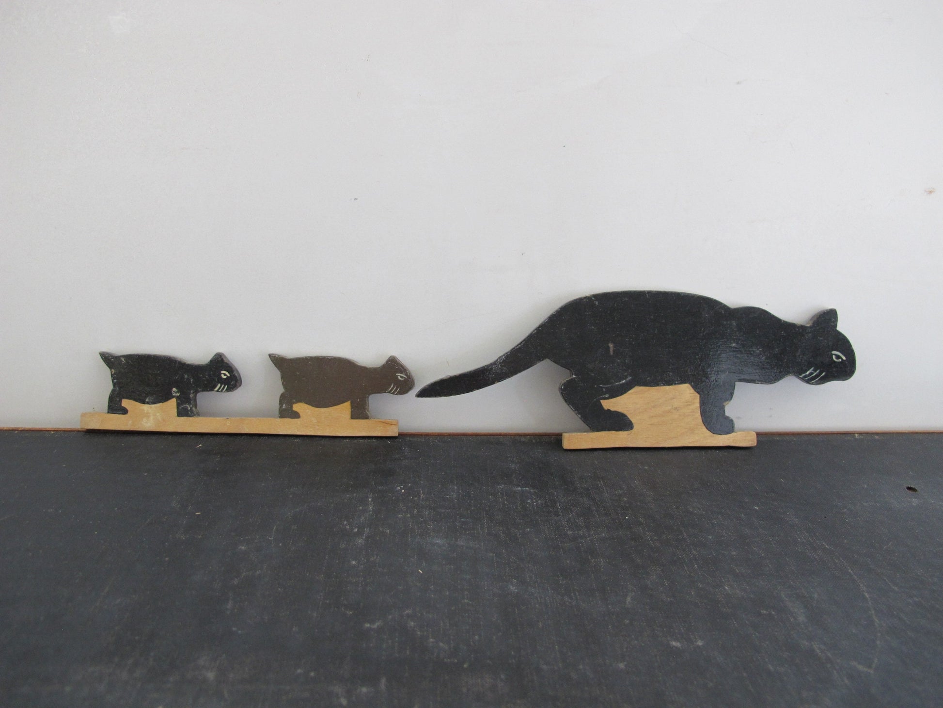 Catharine Chaytor lived from 1907 to 1983. Jarrow is a village in northeast England, located on the River Tyne. These appear to have been Catharine's toys sometime between 1912 and 1917, lovingly handmade for her from painted wood. We have a complete barnyard: cow, calf; horse, colt; sheep, lamb; cat, kittens; chicken, rooster, chicks; turkey. Twelve groups in total, with 9 slots for standing them upright. A tiny label identifies these as Catharine Chaytor's Jarrow Toys.