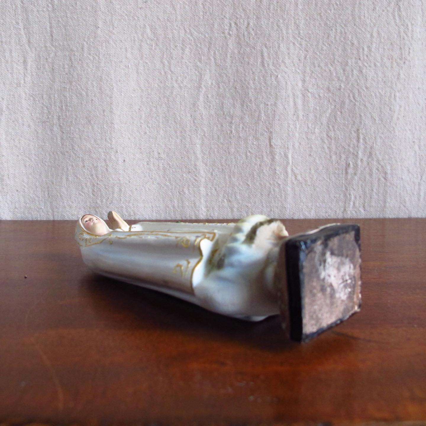 Chalkware or Chalk Madonna with inset glass eyes and scattered jewels, beautifully painted, c. 1920, measuring 5.5" T. Minor losses to crown and gems.