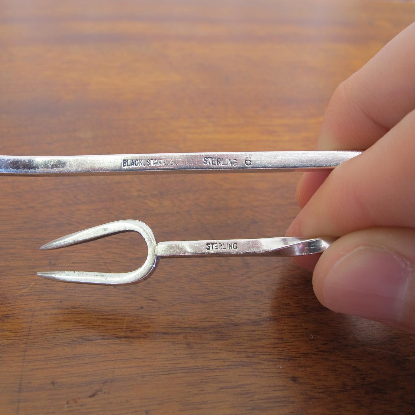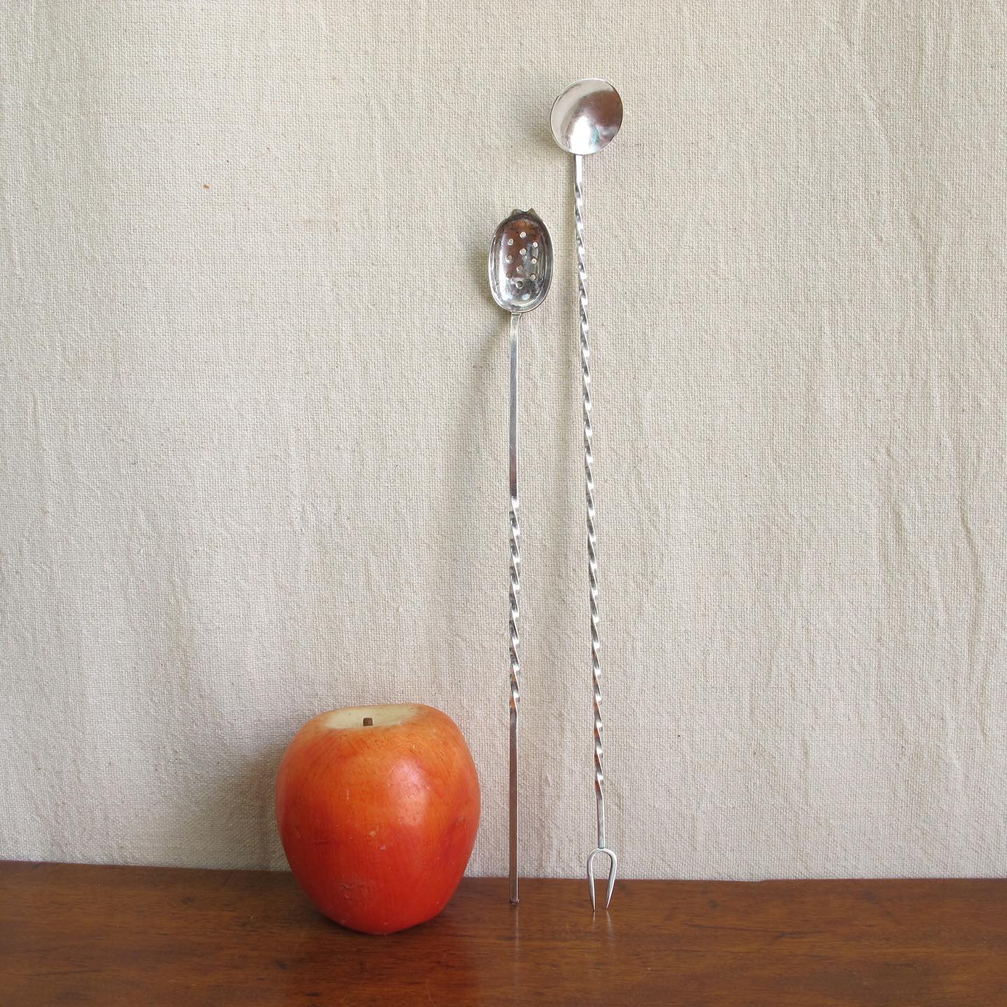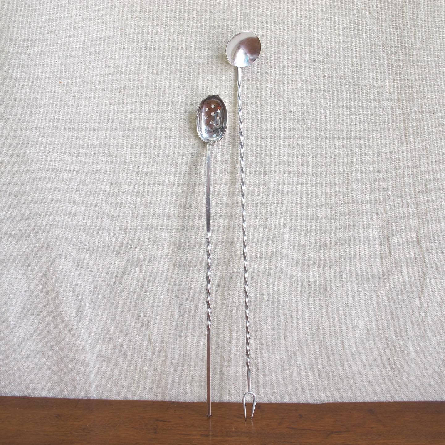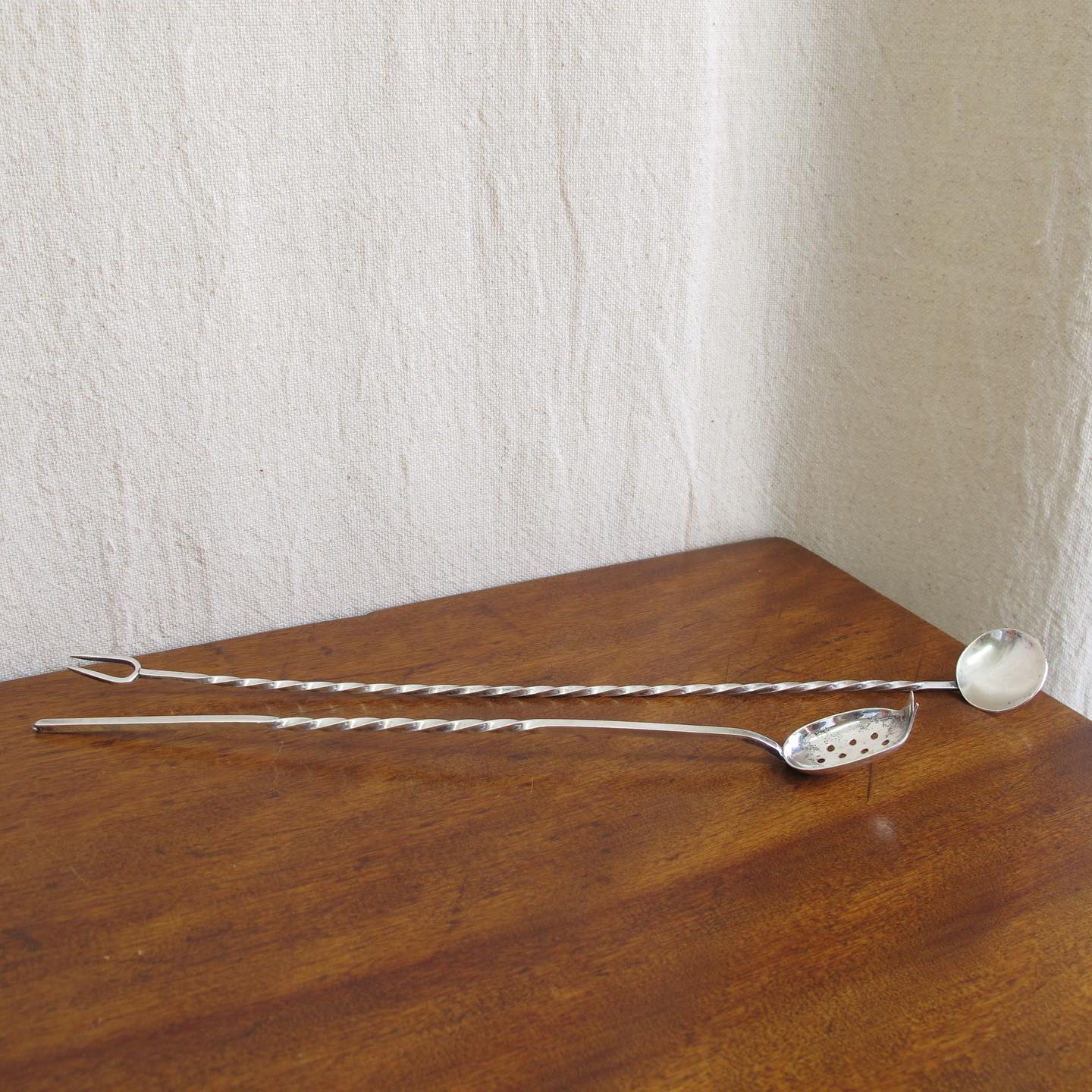 Available. Early cocktail implements in sterling silver, by Black, Starr & Gorham, c. 1920, 11.75” L and 10.125” L respectively, 1.8 oz. together