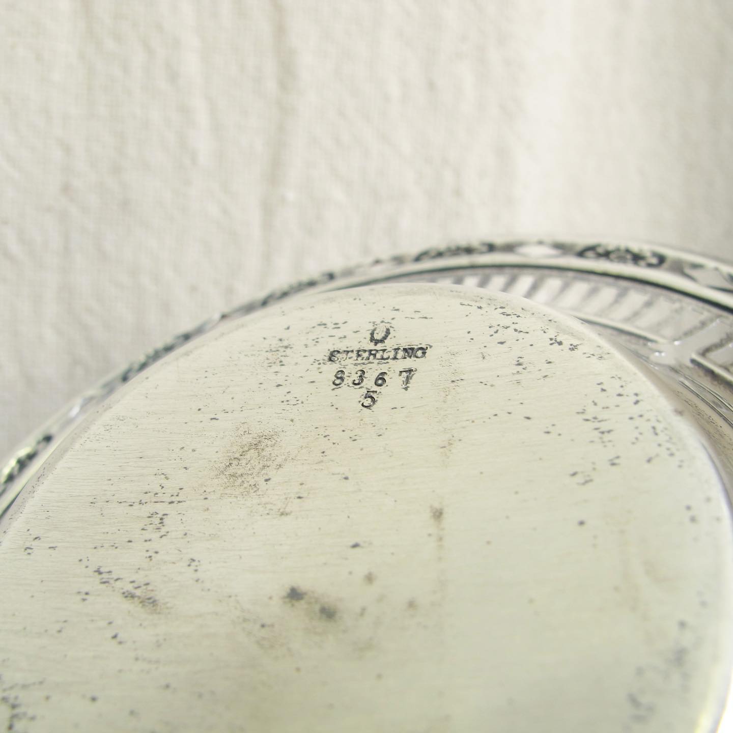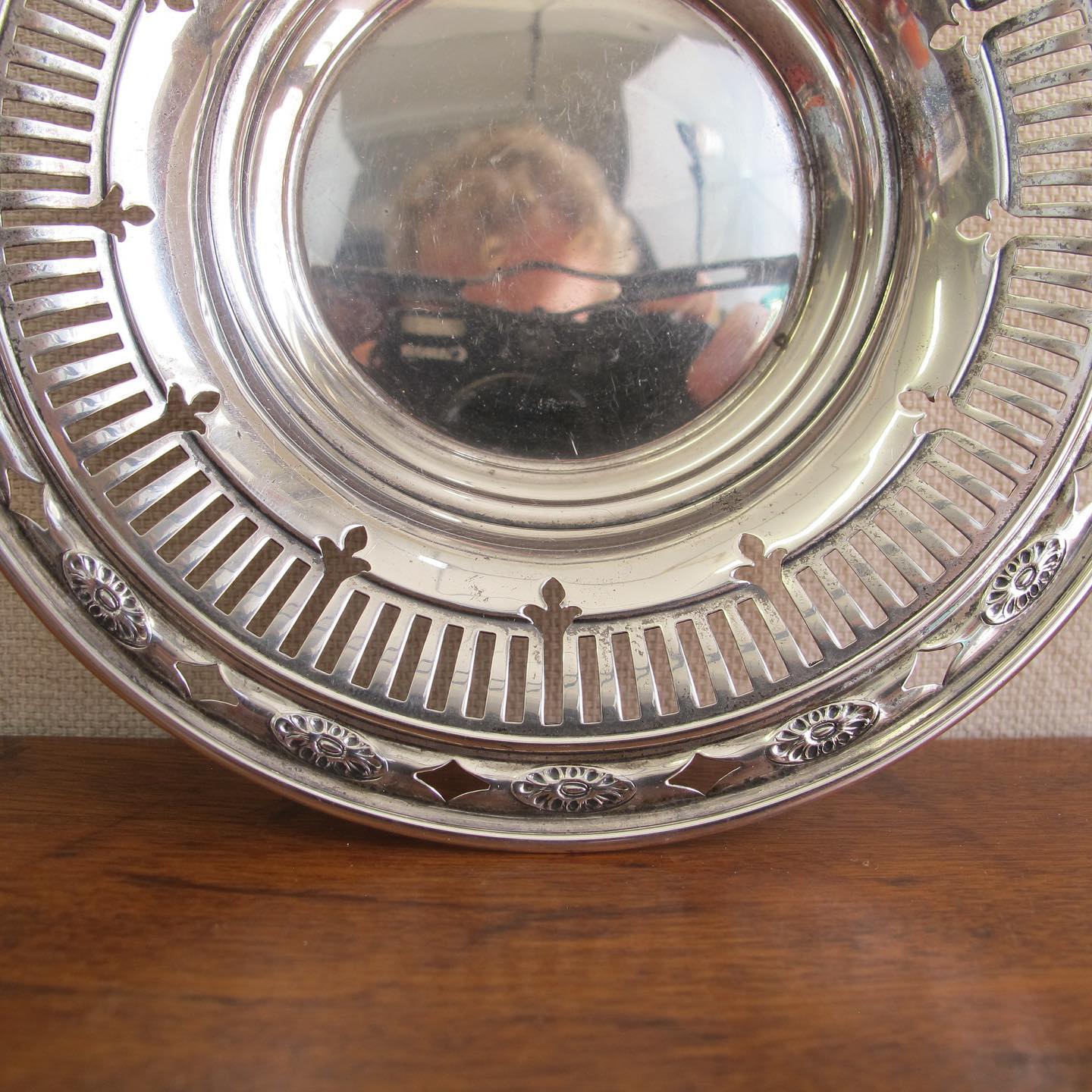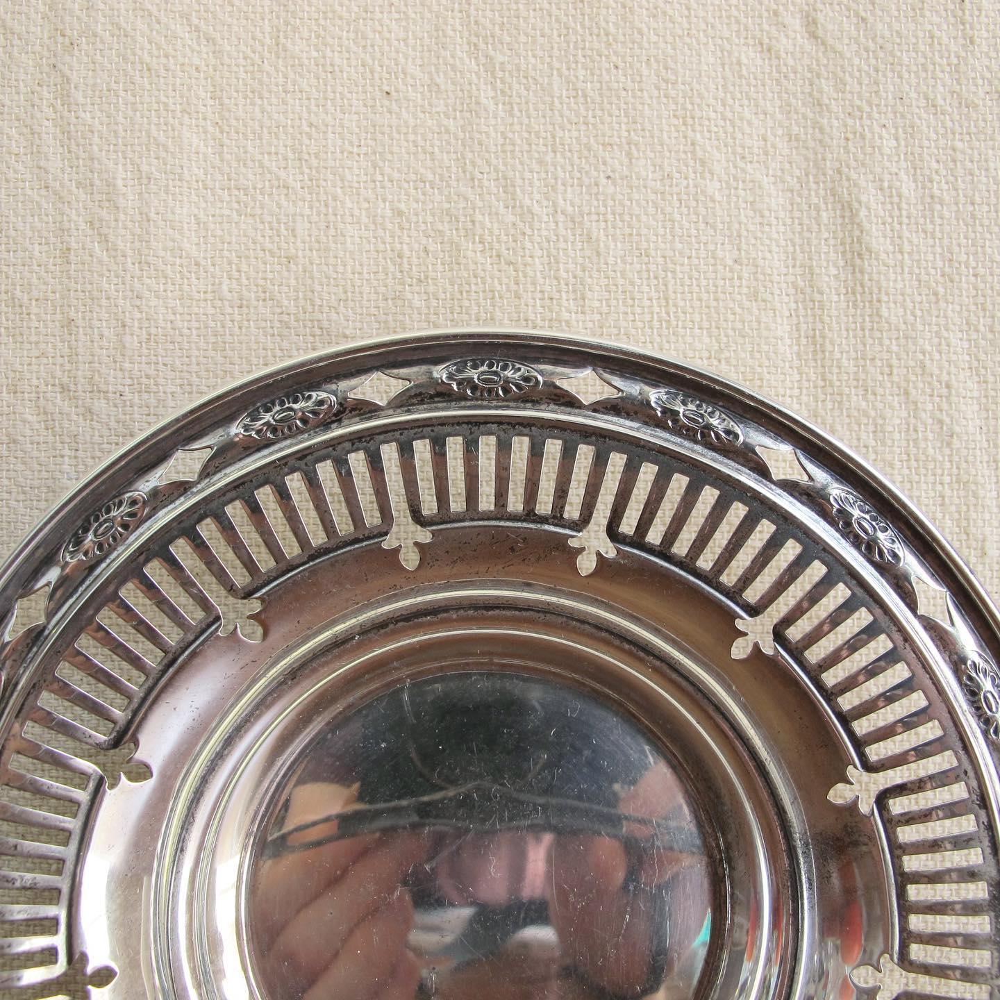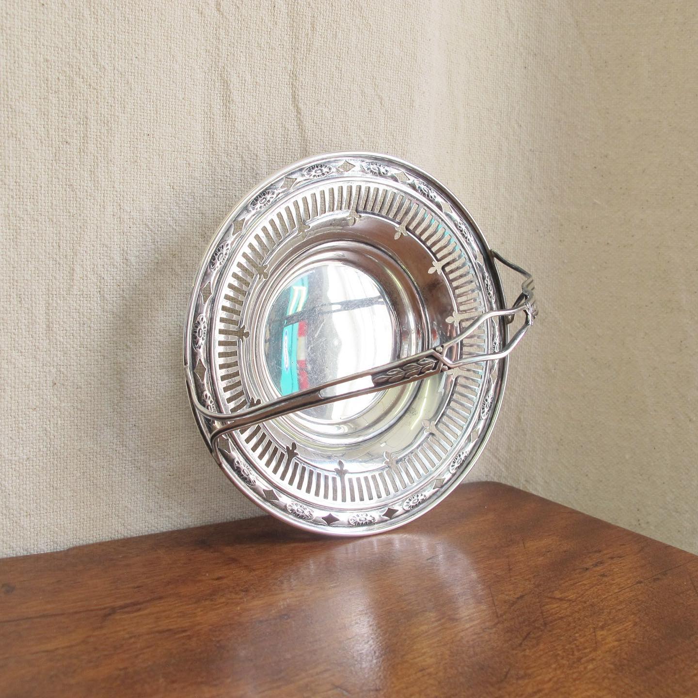 Edwardian sterling reticulated nut or candy basket / dish with handle and classical motifs, c. 1900 1910, 4” T x 5.25” W, 1.8 oz.