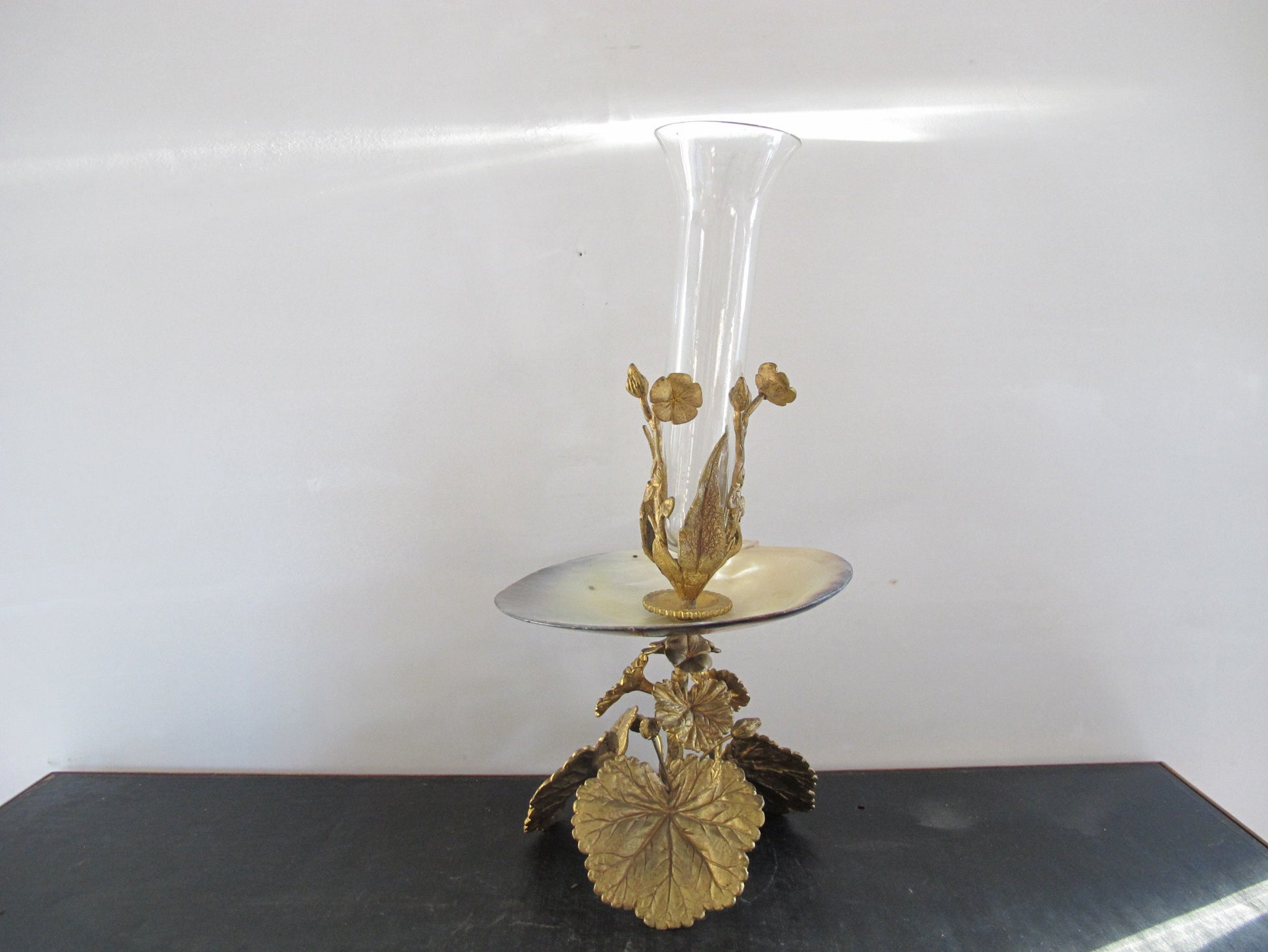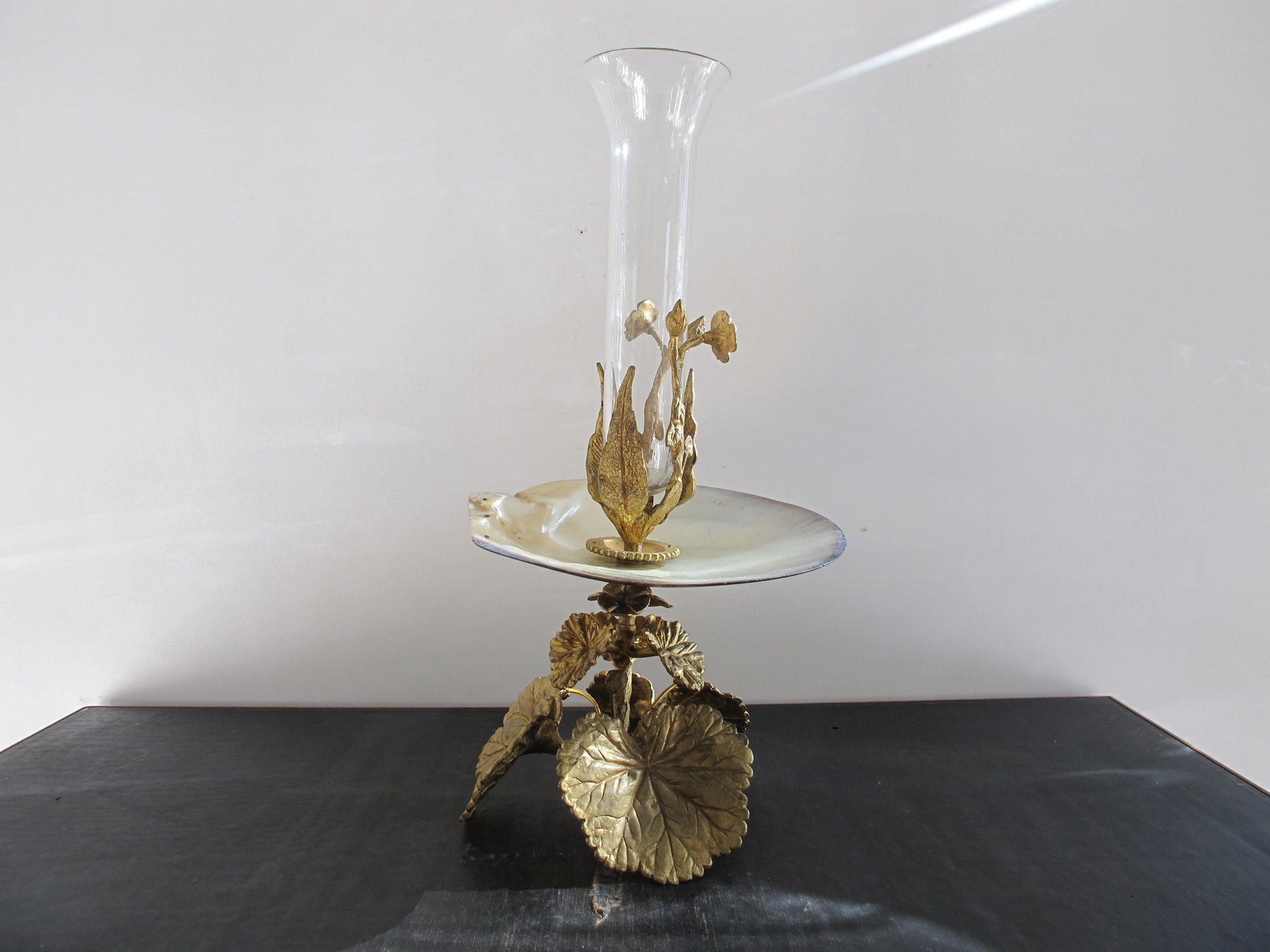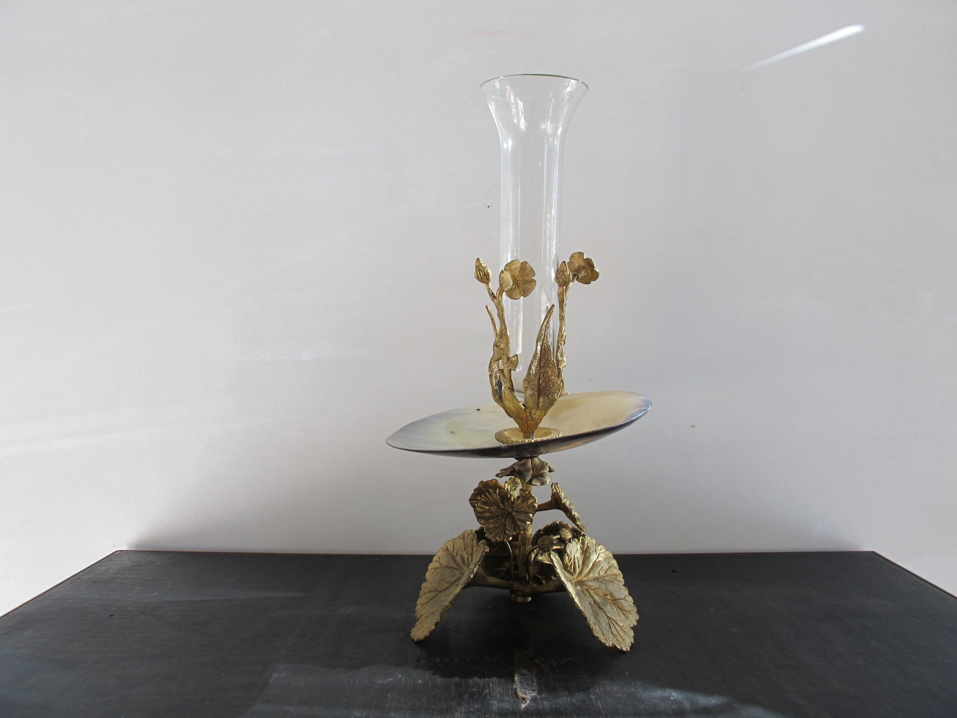 On offer high Victorian epergne centerpiece c. 1880, which a level made of a large scallop shell for fruit / nuts and a vase for flowers. Gilt brass or bronze throughout in the form of wildflowers -- the base appears to be from castings of begonia leaves, while the vase above is held in place with reeds and small flowers. Stunning.