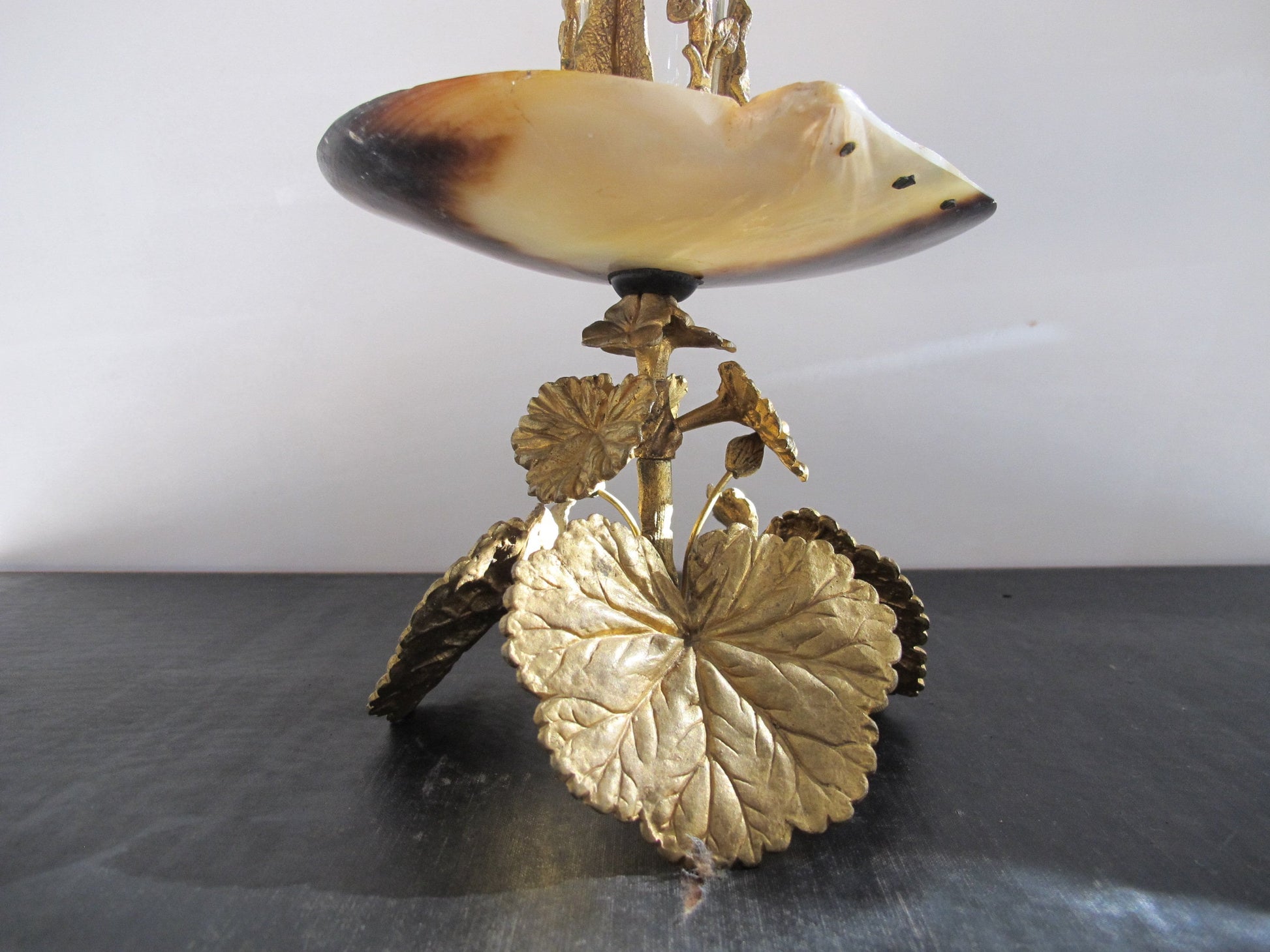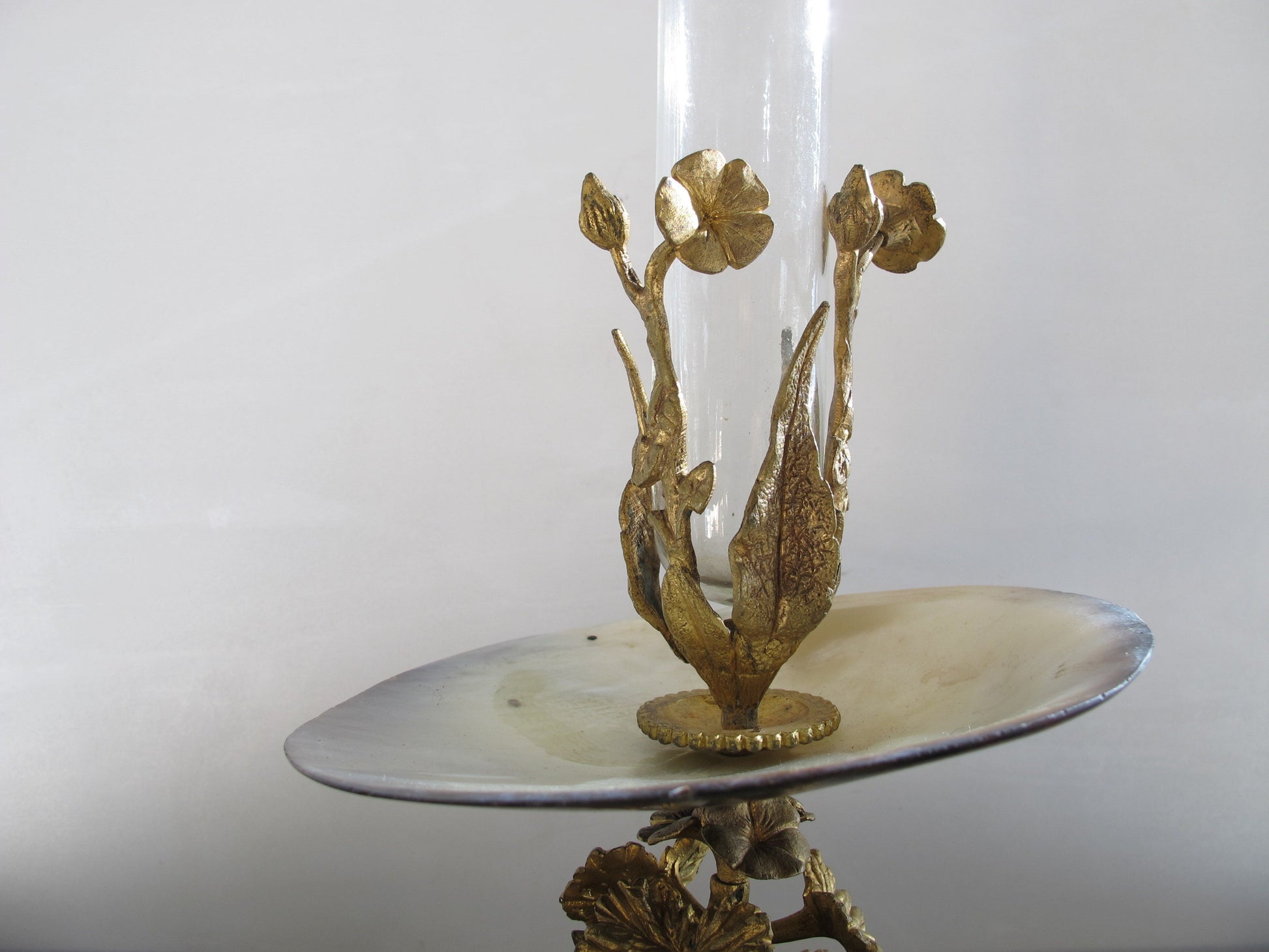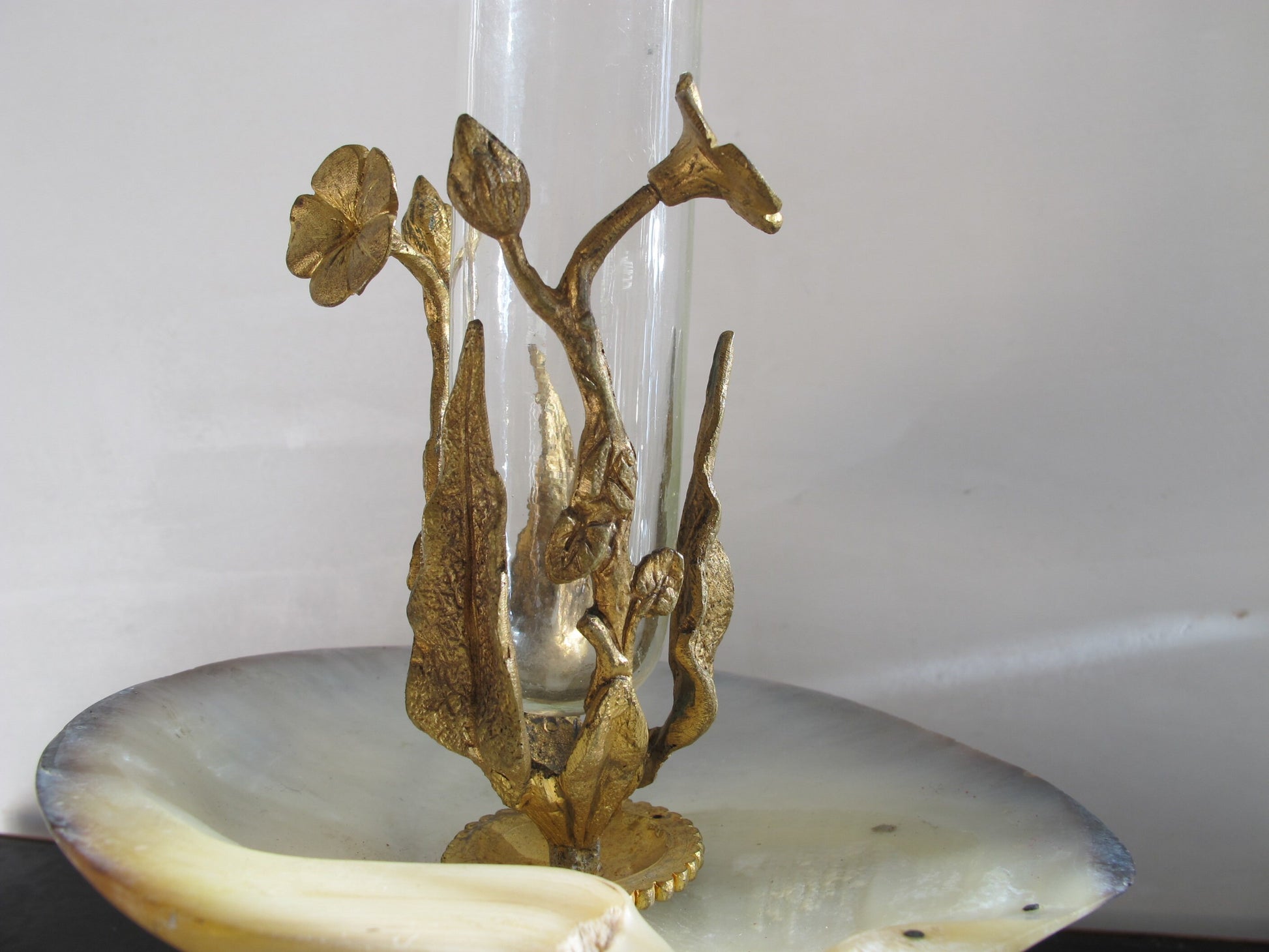 On offer high Victorian epergne centerpiece c. 1880, which a level made of a large scallop shell for fruit / nuts and a vase for flowers. Gilt brass or bronze throughout in the form of wildflowers -- the base appears to be from castings of begonia leaves, while the vase above is held in place with reeds and small flowers. Stunning.