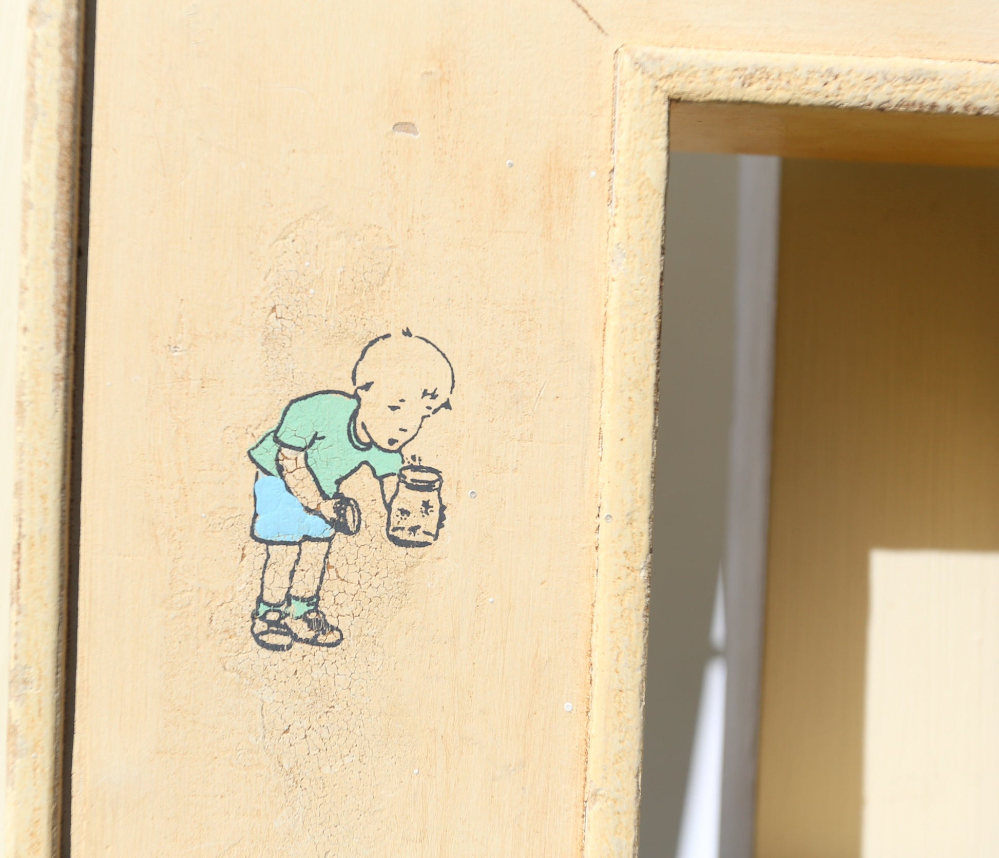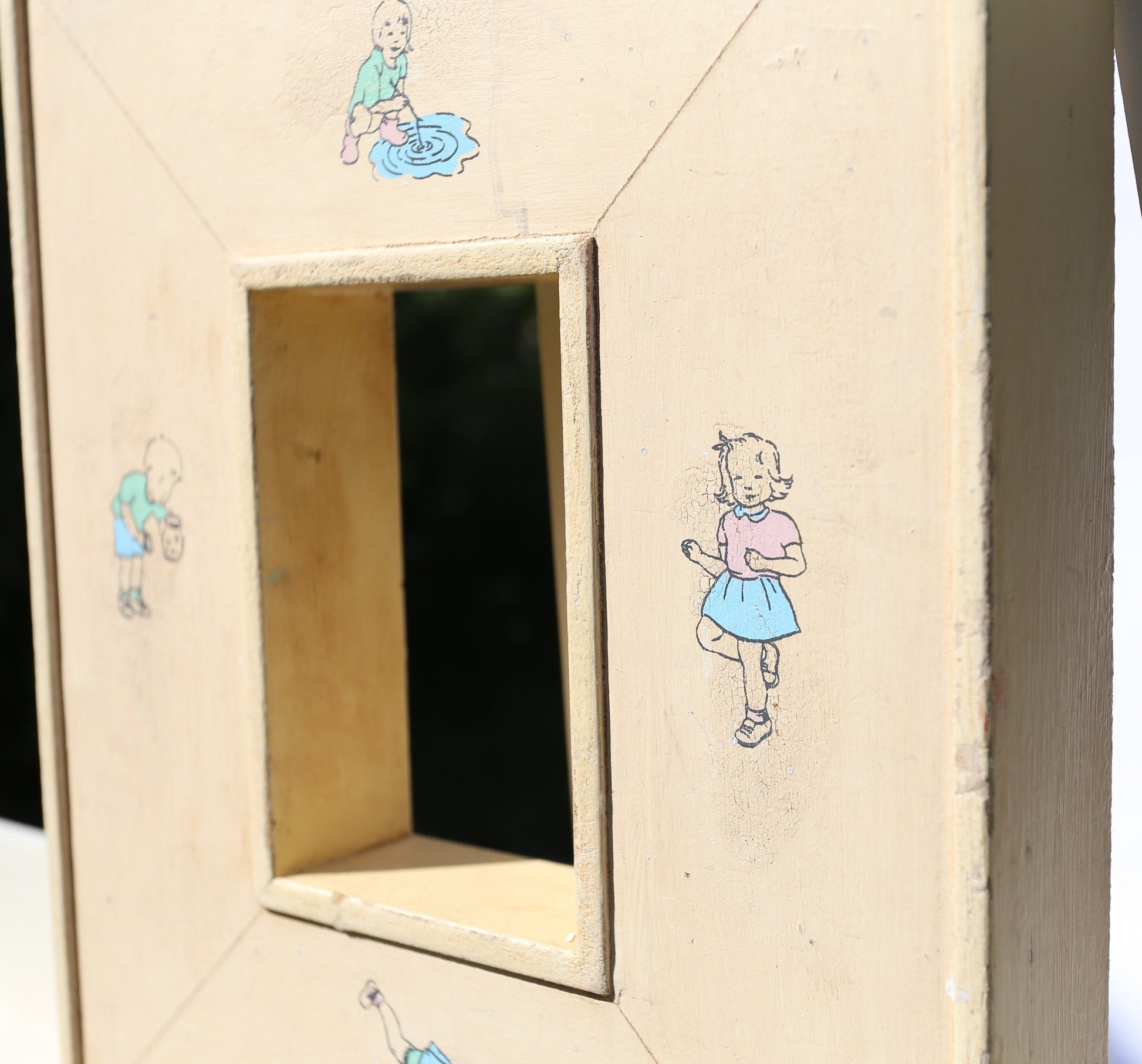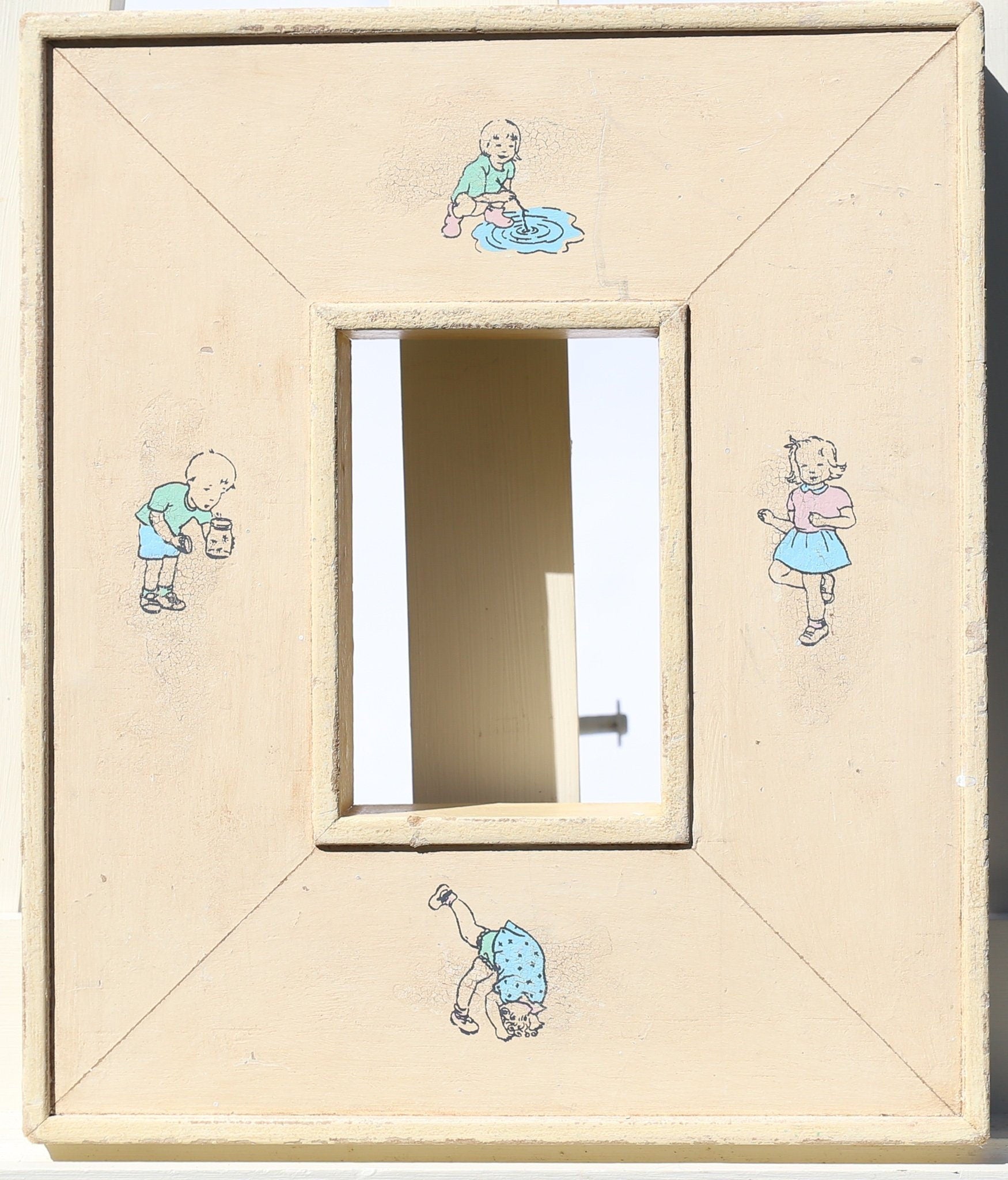 On offer a fantastic children-themed frame, ornamented with decals of children playing against a deep yellow background. The frame itself protrudes from the wall significantly, implying importance -- perfect for either a photo or an original painting.