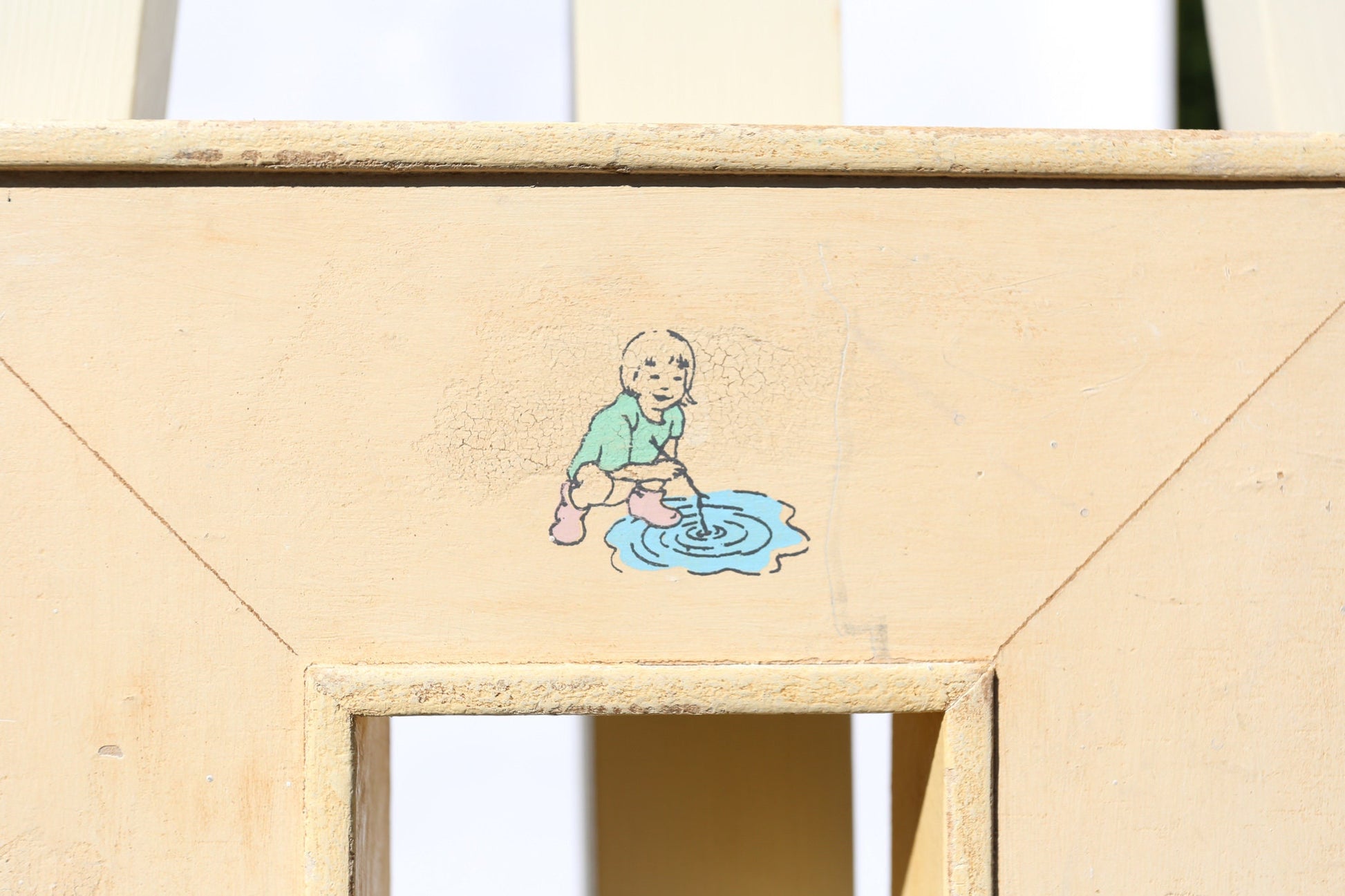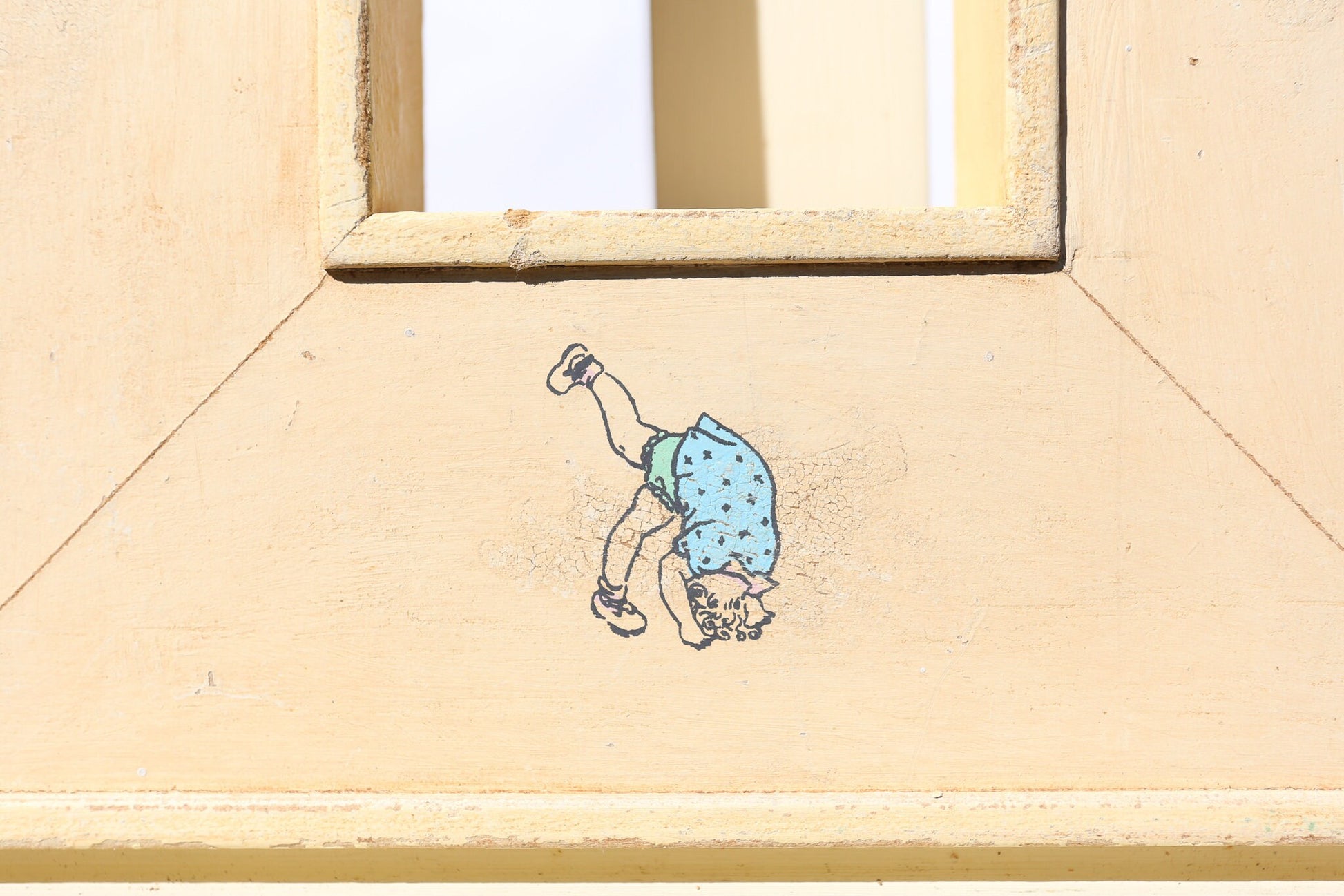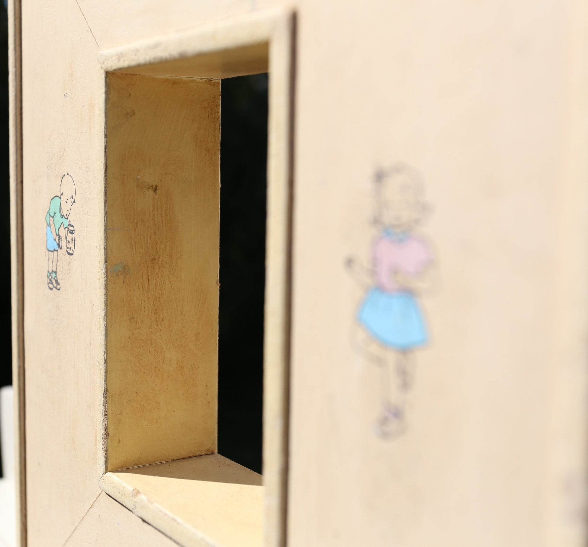 On offer a fantastic children-themed frame, ornamented with decals of children playing against a deep yellow background. The frame itself protrudes from the wall significantly, implying importance -- perfect for either a photo or an original painting.