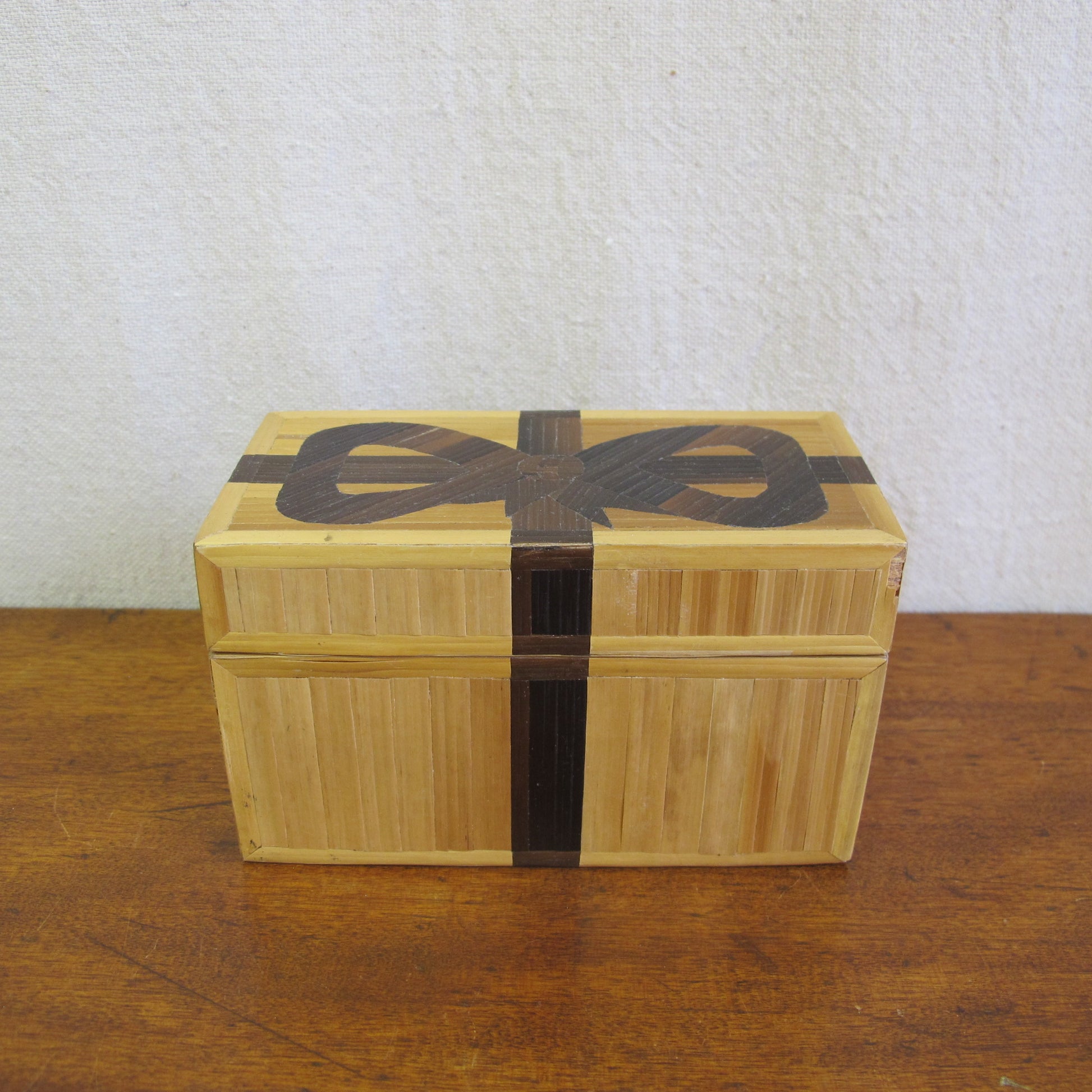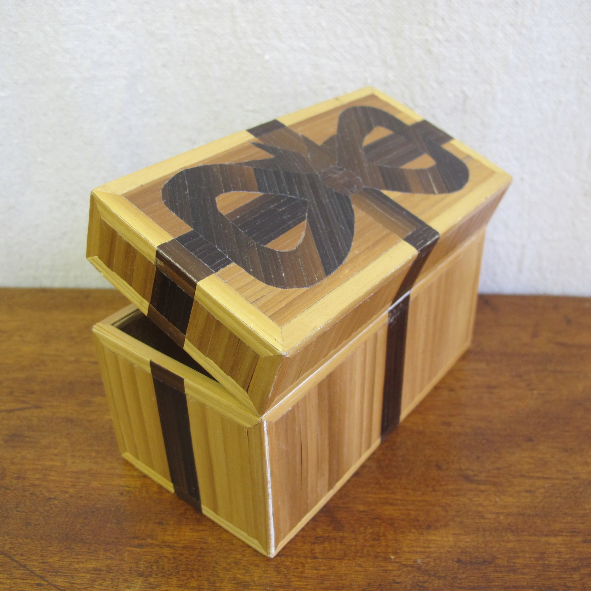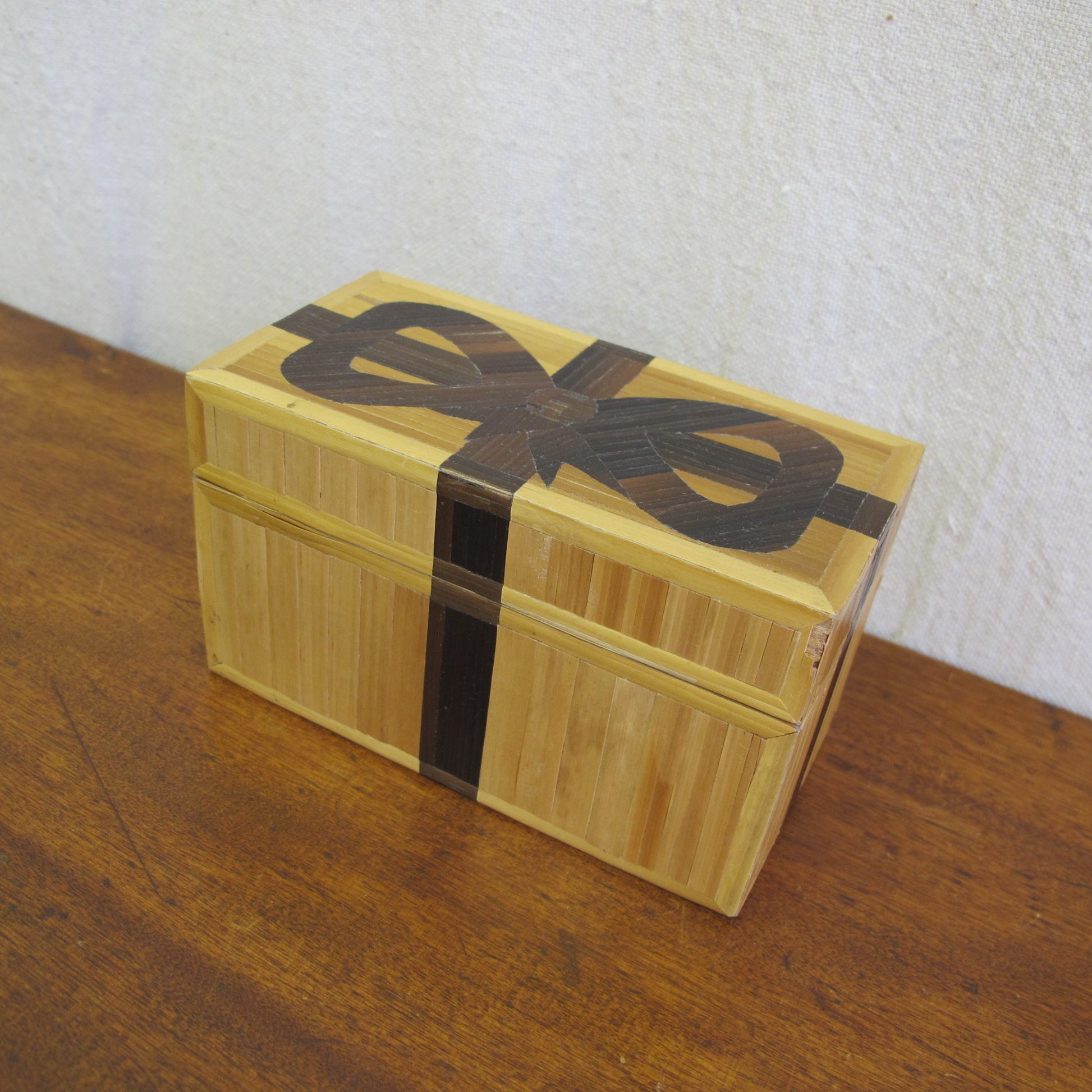 French straw marquetry box made by Rochas in the form of a gift box with bow, c. 1970