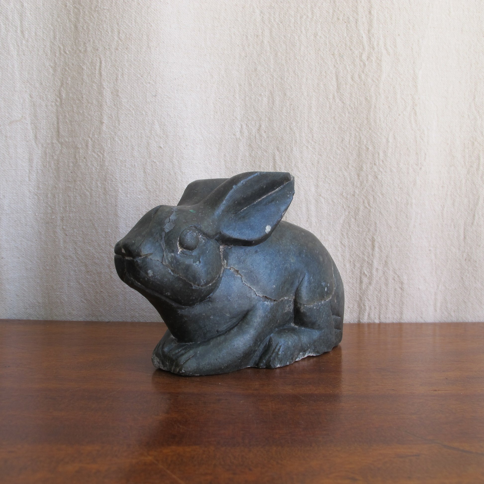 Inuit or Eskimo soapstone rabbit, wonderfully expressive and endearing, c. 1950, with typical wear and losses, as noted in the pictures.