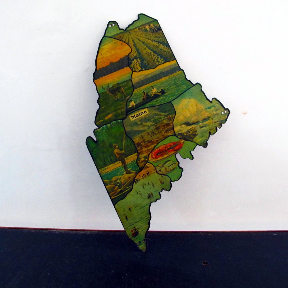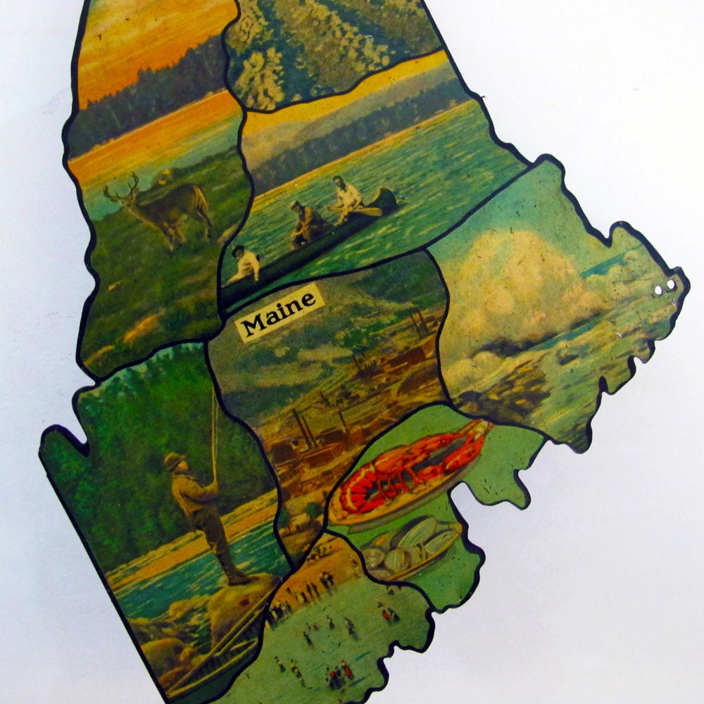 On offer original period Maine sign, chromo lithography on tin sheet. It shows each of the counties of Maine and what they are known for, from swimming to lobster to fishing to potatoes. A marvelous fun piece, and versatile in that the size allows it to be put almost anywhere.