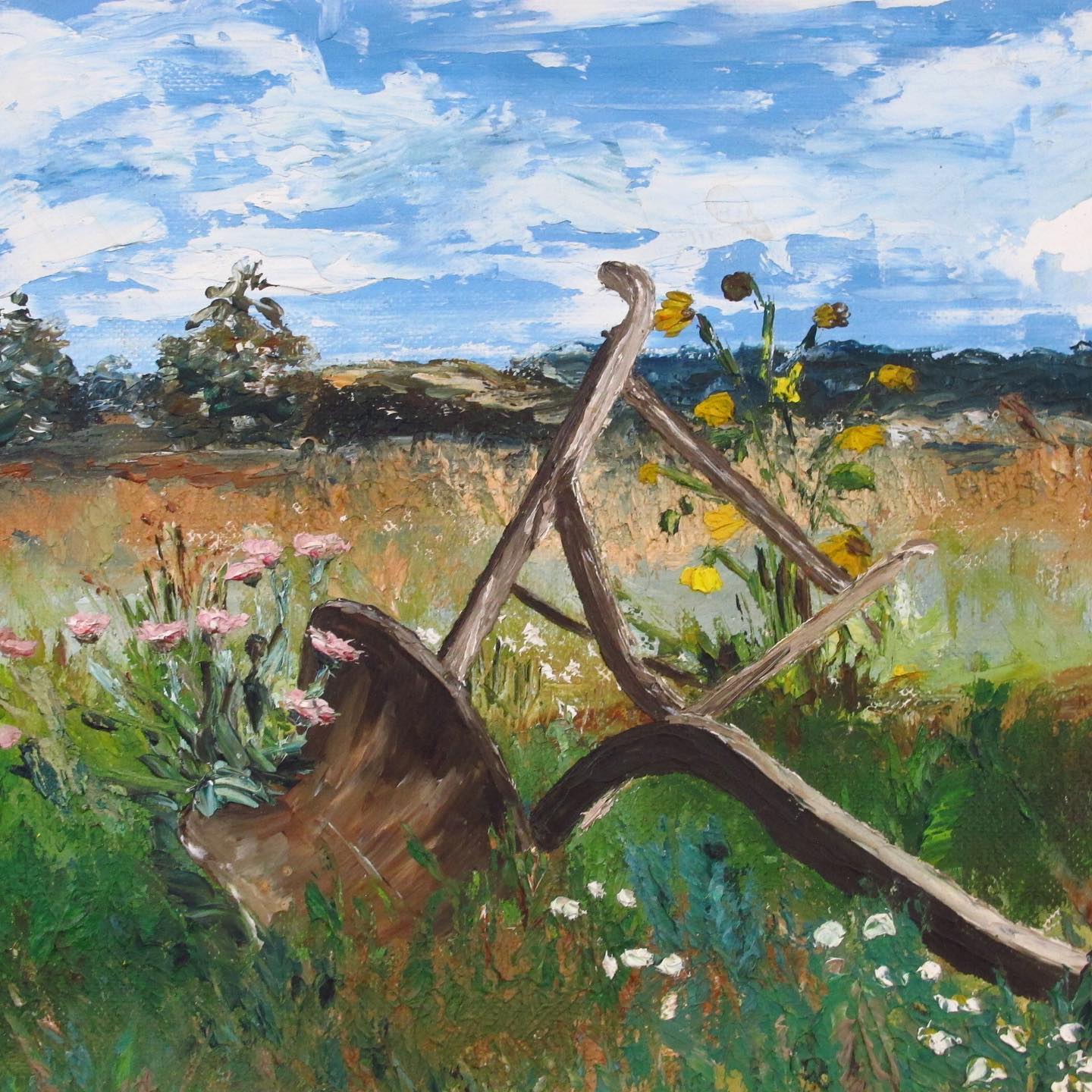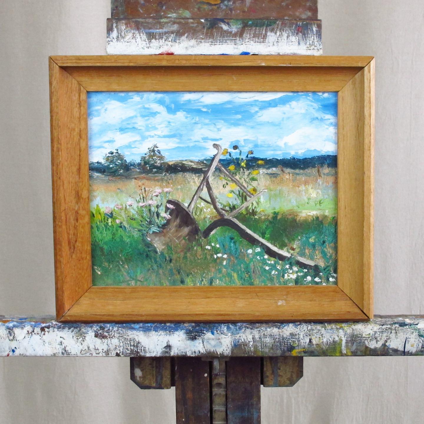 Masterful Oil on Canvas Landscape with Plow, Overgrown Field with Wildflowers, thickly applied in the manner of American Impressionism, c. 1950