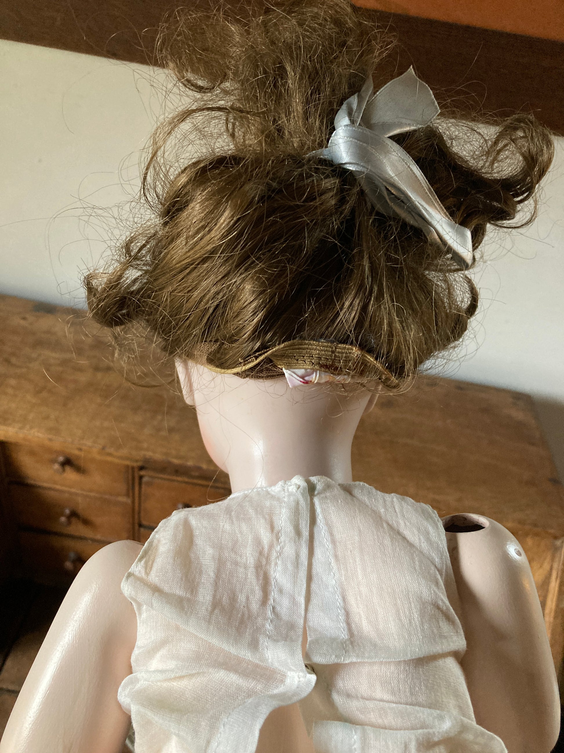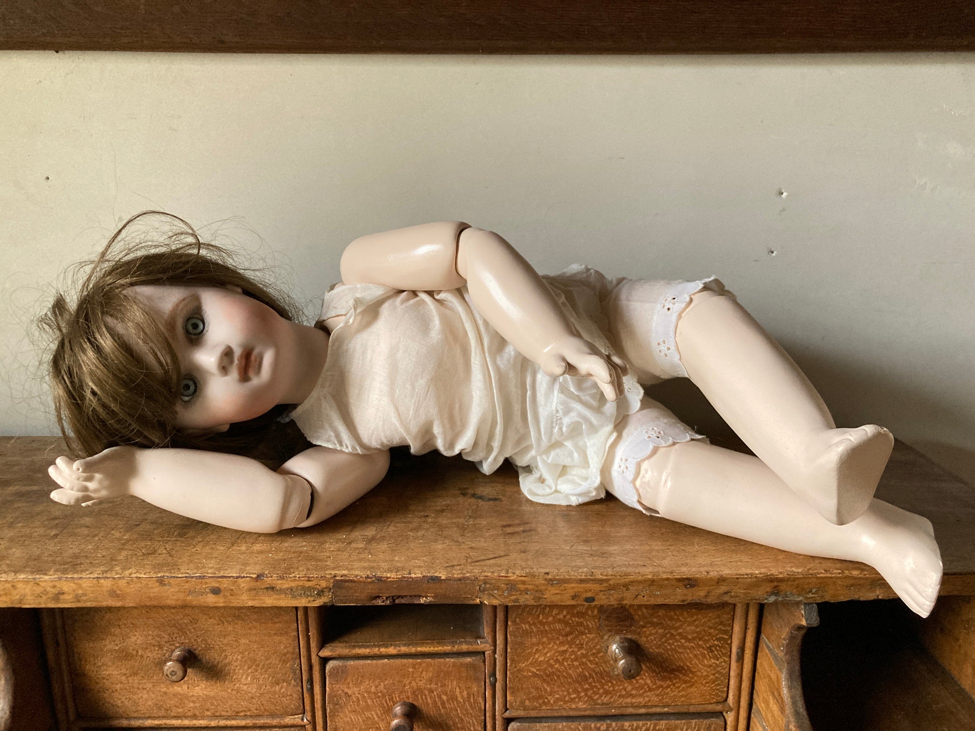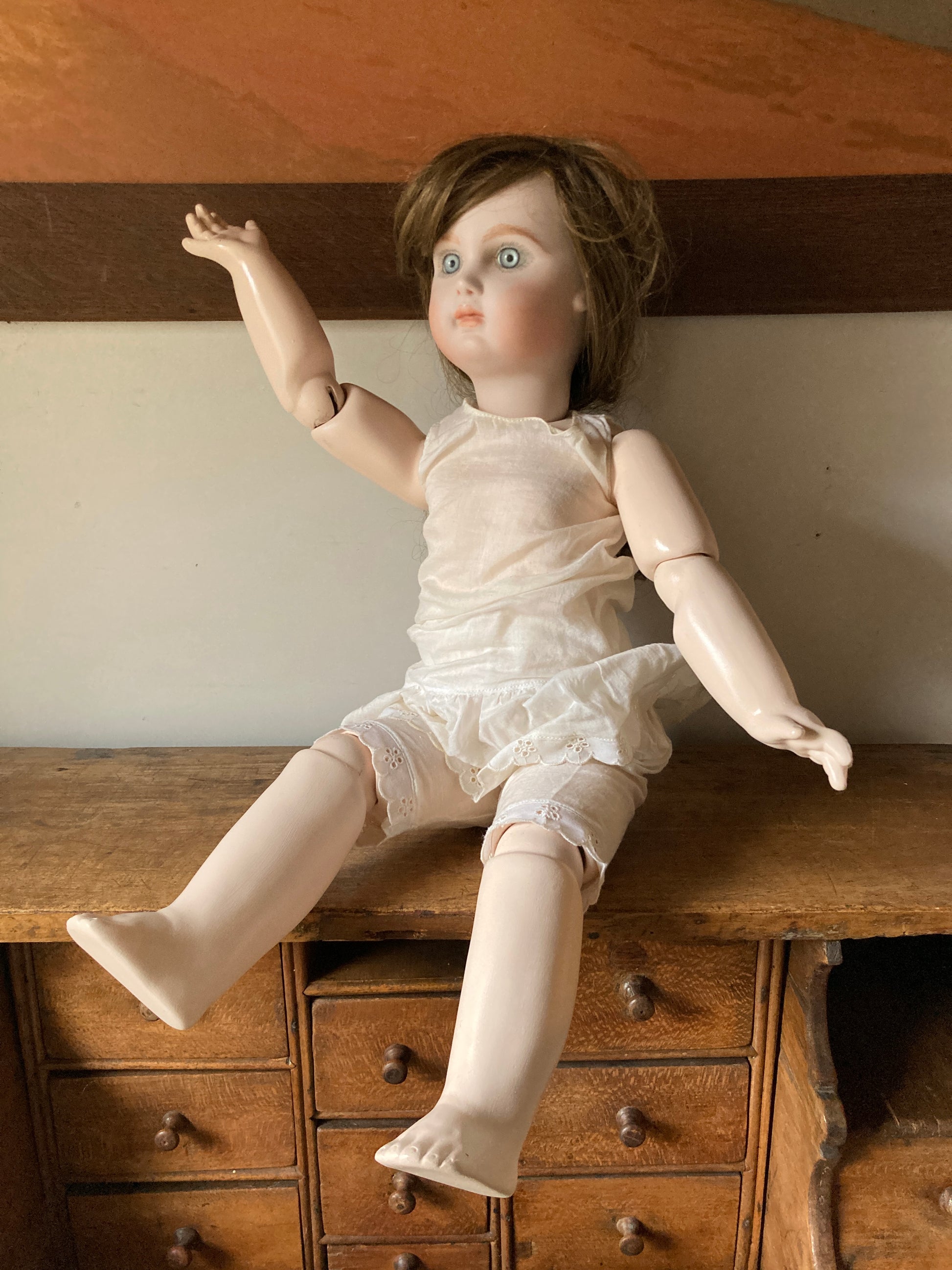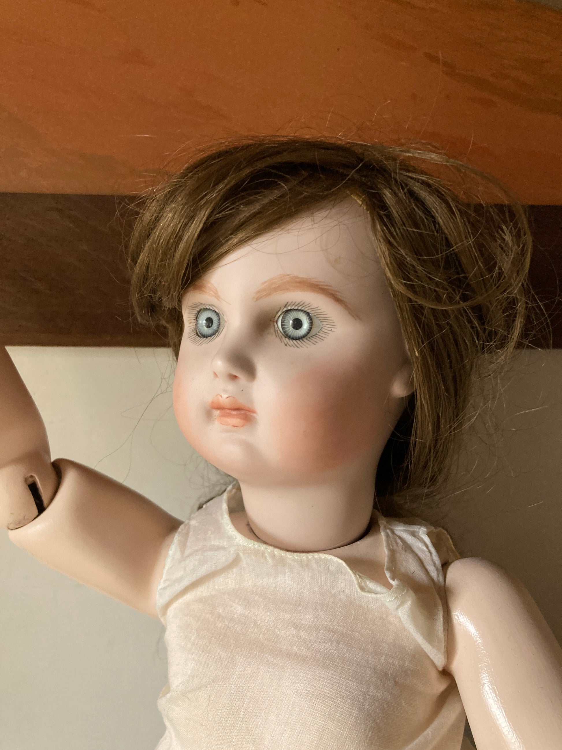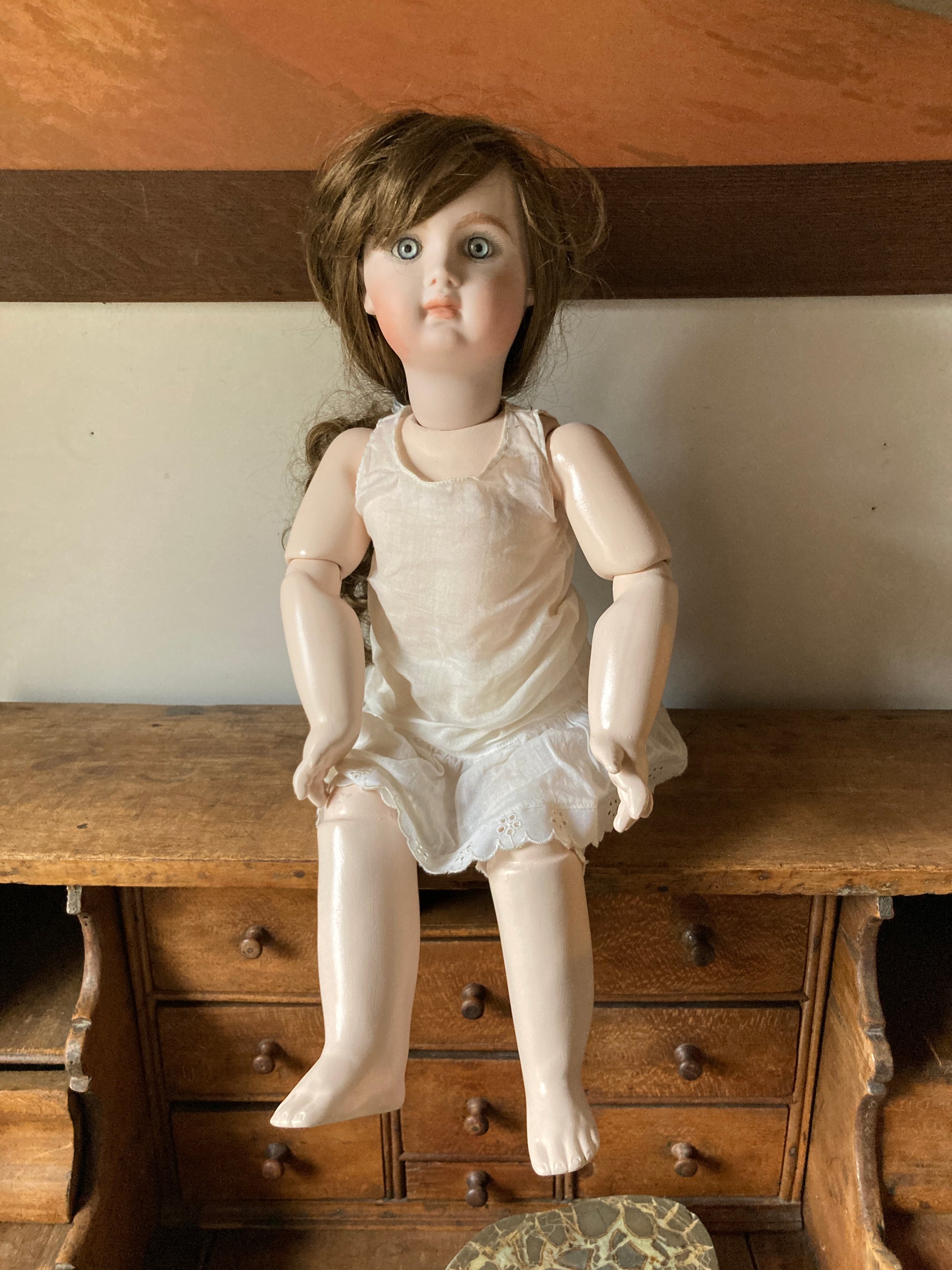 Meticulous reproduction of a closed-mouth Jumeau bebe c. 1895, made in close emulation of the original. This was likely made in the 1980s, based on the collection it came from, and would have been very, very costly. Heavy, solid thing. Porcelain head, blown paperweight eyes, jointed turned wood and composition body. Original Jumeaus still sell for many thousands, while this is far more affordable — you could even give it to a child, perhaps to teach them to appreciate the real things they will inherit in the future.