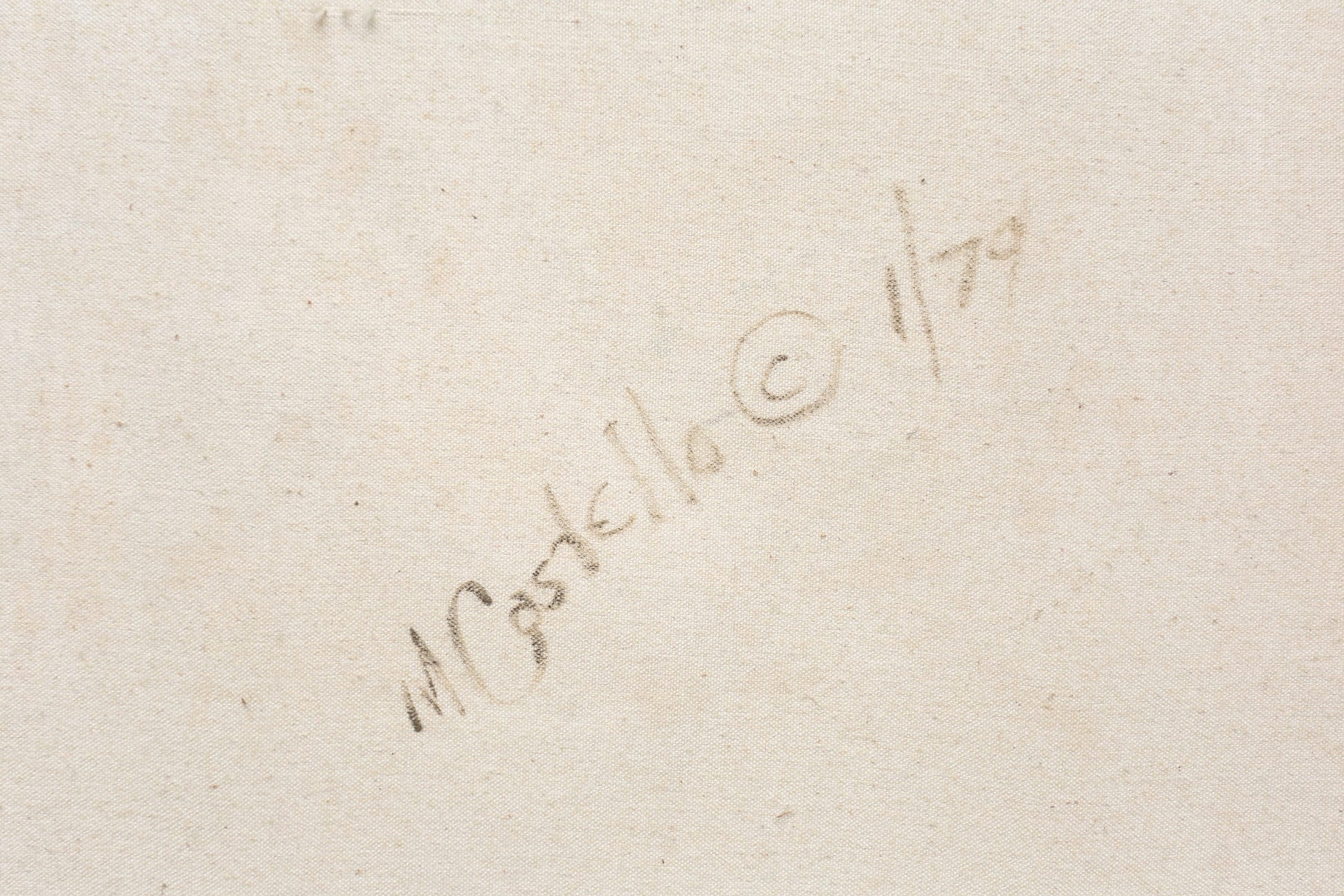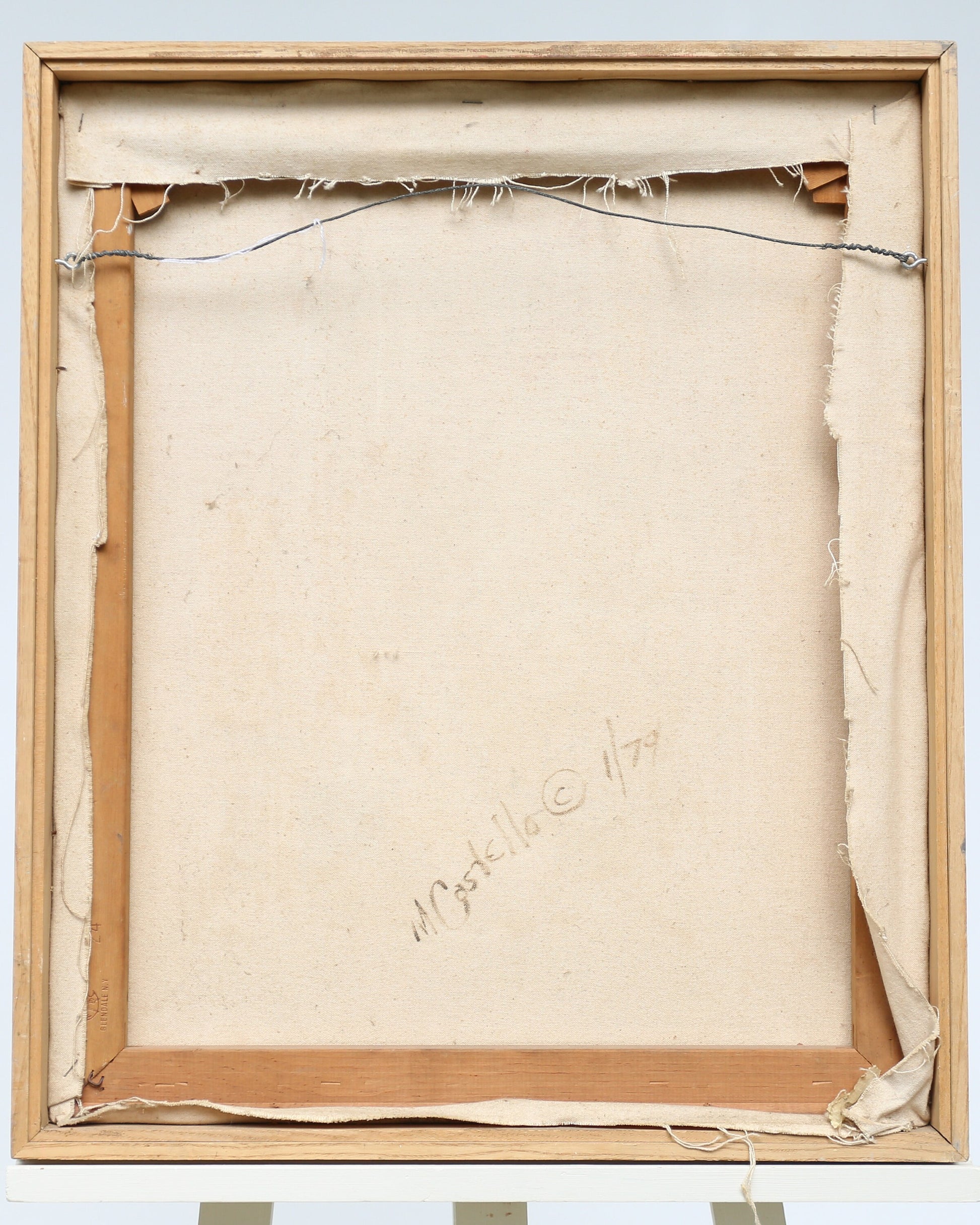 On offer late 1970s self portrait by noted Provincetown, Cape Cod artist Michael Costello. Signed on face and signed and dated on reverse 1979. The artist continues successful art practice in Provincetown to this day, and he has authenticated this self portrait. Costello's work has been widely shown and collected from the 1970s to the present day. Many times over the course of his career he has returned to self portraiture in oil, but he is also known for his drawings, allegorical themes and studies of reflection.
