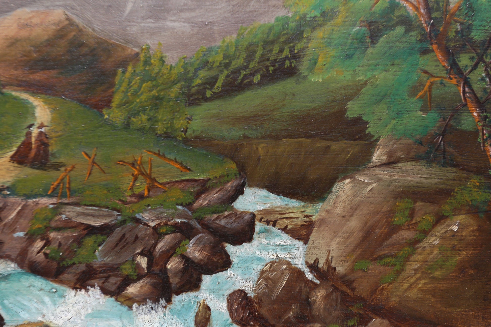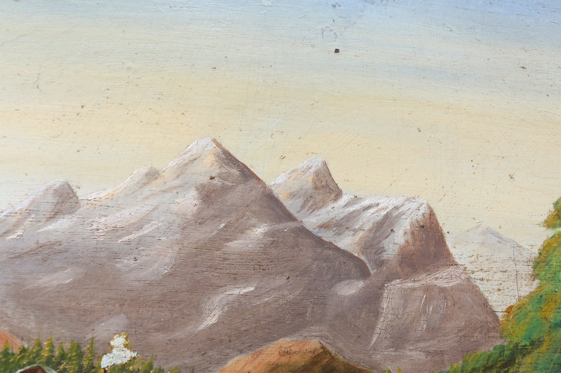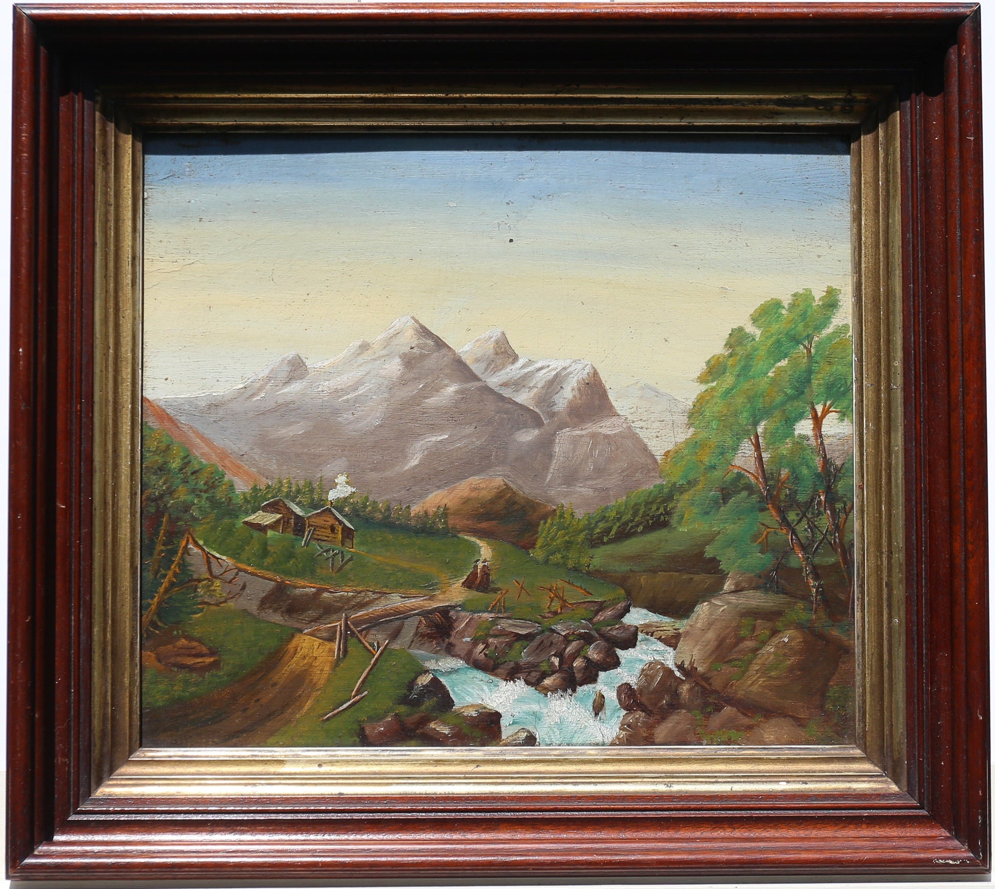 Oil Painting 19th century oil on board depicting monks in North American West with log cabins. A very rare view of American wilderness settlement in charming folky style. Possibly depicting early Jesuit settlements in Canada? The figures appear to be wearing long robes. c. 1850 1860, presented in original molded and gilt wooden frame. The mountains look somewhat like the Tetons in Wyoming, though it could be the Canadian Rockies. I welcome your opinion!