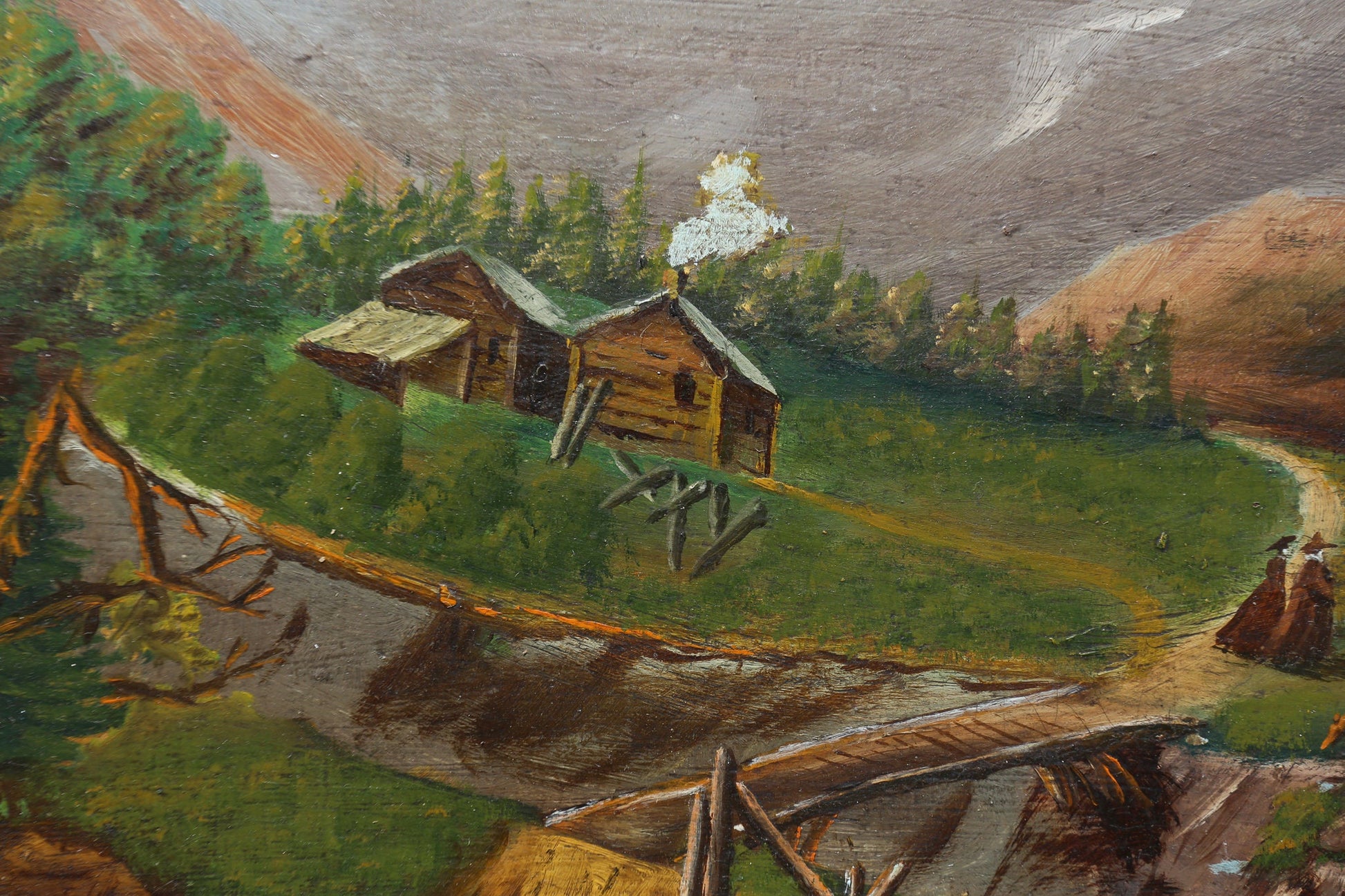 Oil Painting 19th century Oil on Board Monks in North American West Log Cabins Canada Canadian Rockies or American Tetons Mountains
