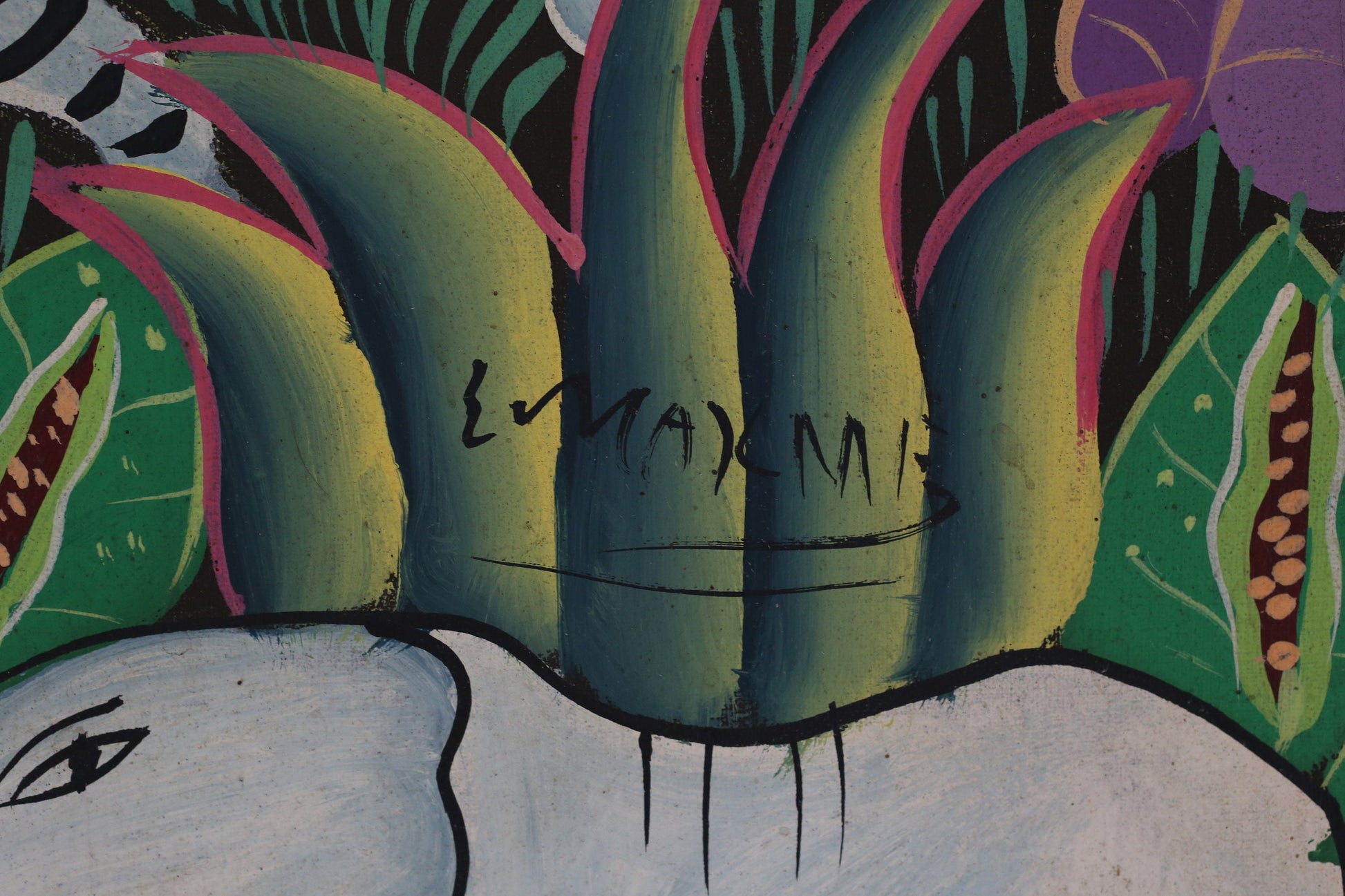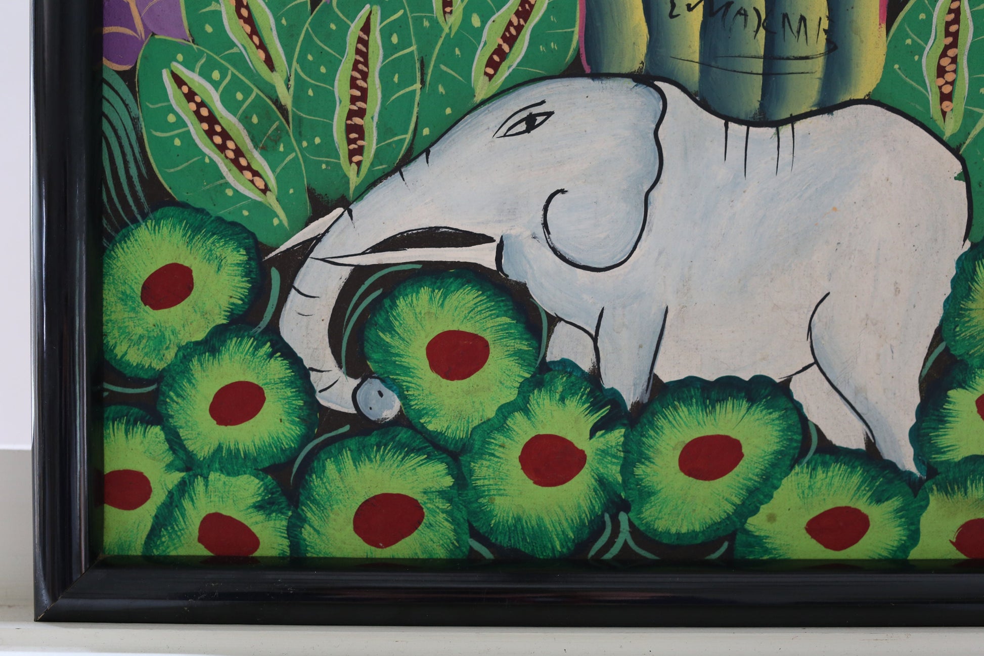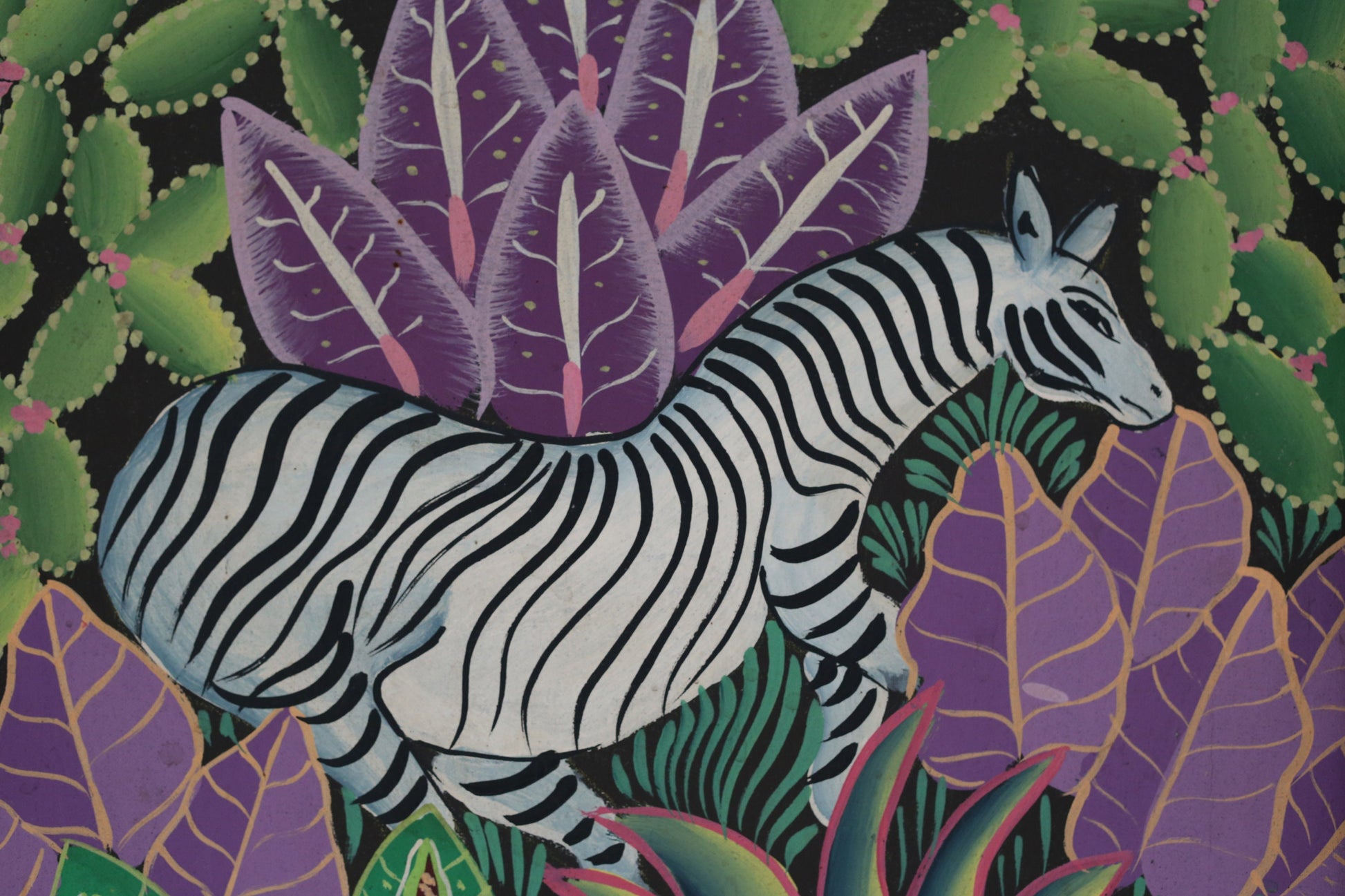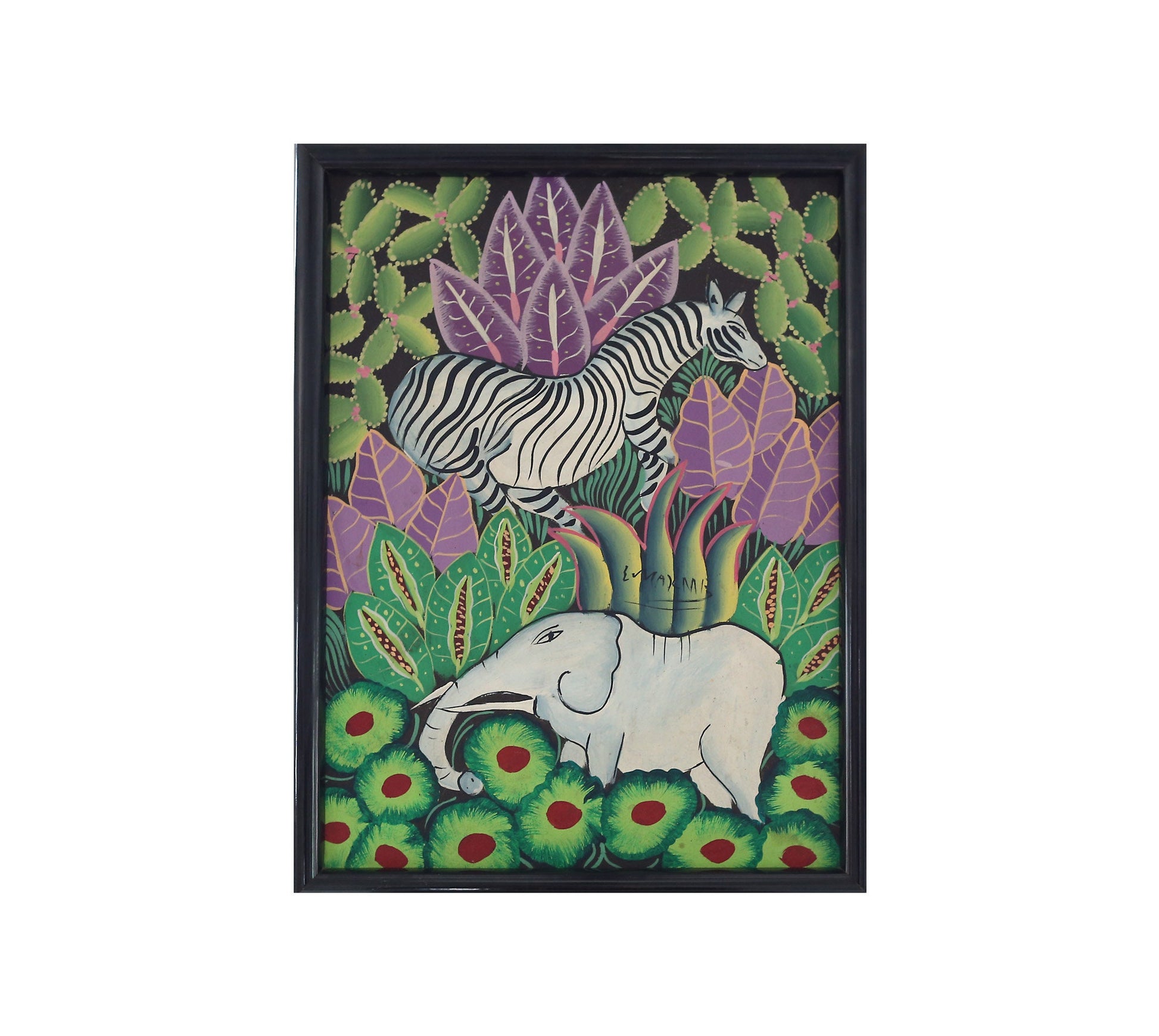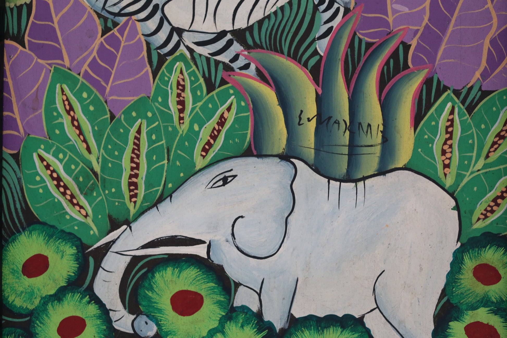 On offer African oil on canvas painting depicting a zebra and elephant hiding in jungle foliage. Vibrant colors throughout, particularly greens and purples. Signed or marked in center. Lots of graphic punch packed into a small area.