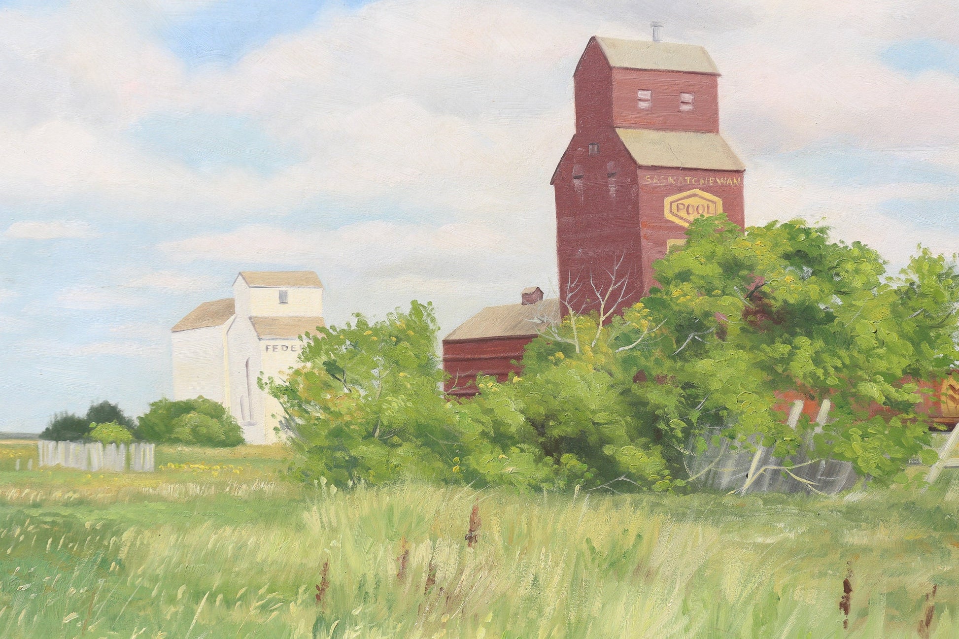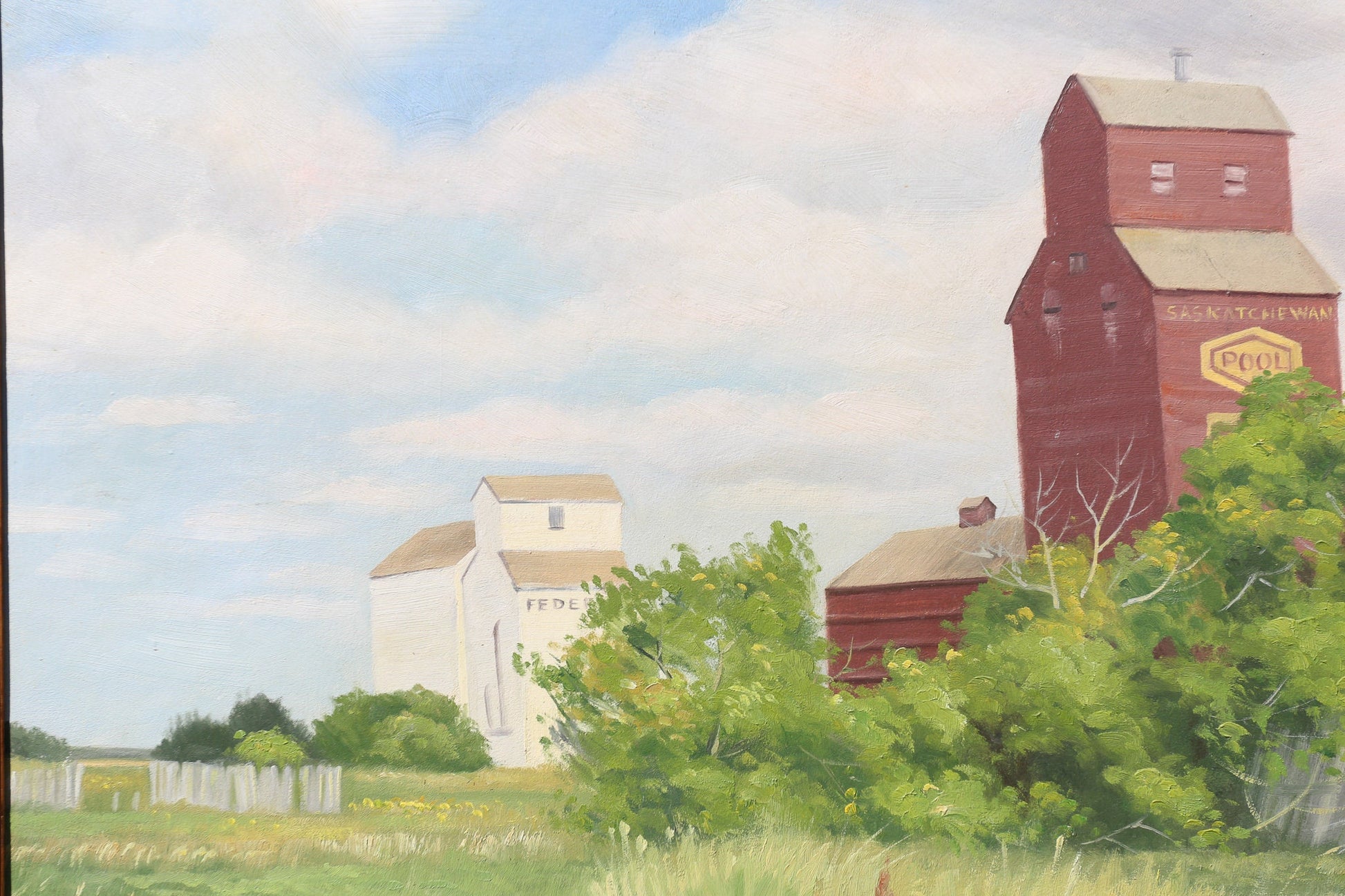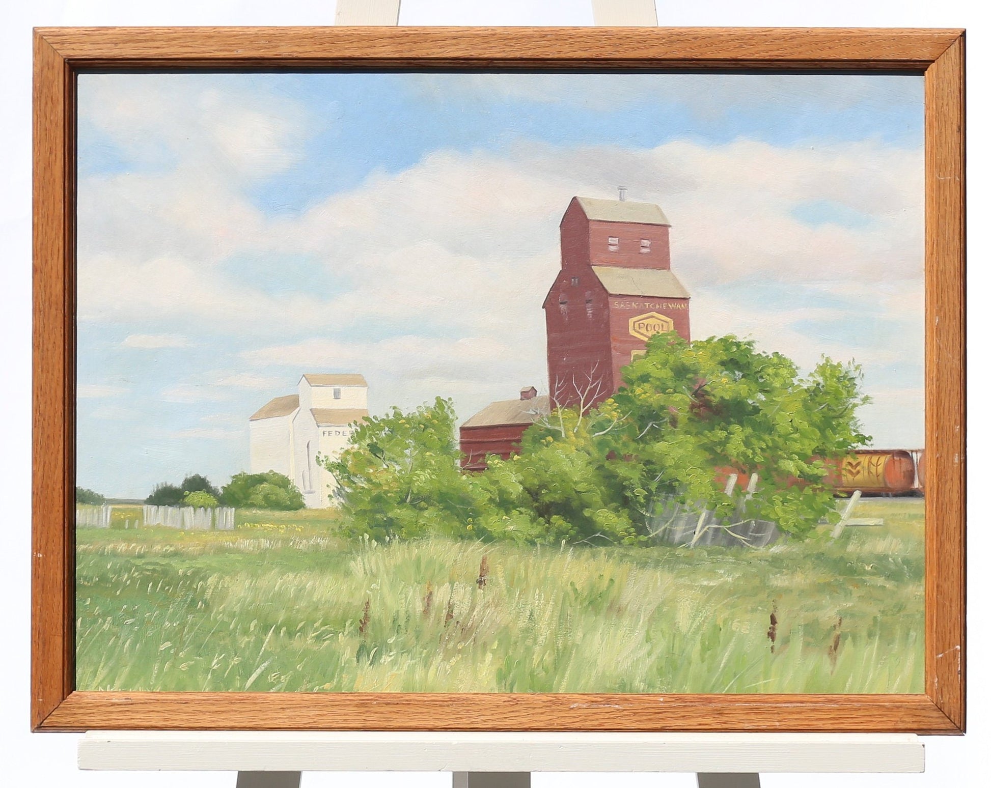 On offer artist signed Norman Kelly (1939- ), oil on board depicting a classic prairie scene. The painting perfectly captures the stillness and quiet beauty of the prairie. The painting depicts an iconic prairie elevator of the Saskatchewan Wheat Pool, a co-operative of farmers who sold wheat on the Canadian prairie. Prairie elevators are fast disappearing from the North American landscape. Stunning realist style of painting throughout, reminiscent of Edward Hopper.