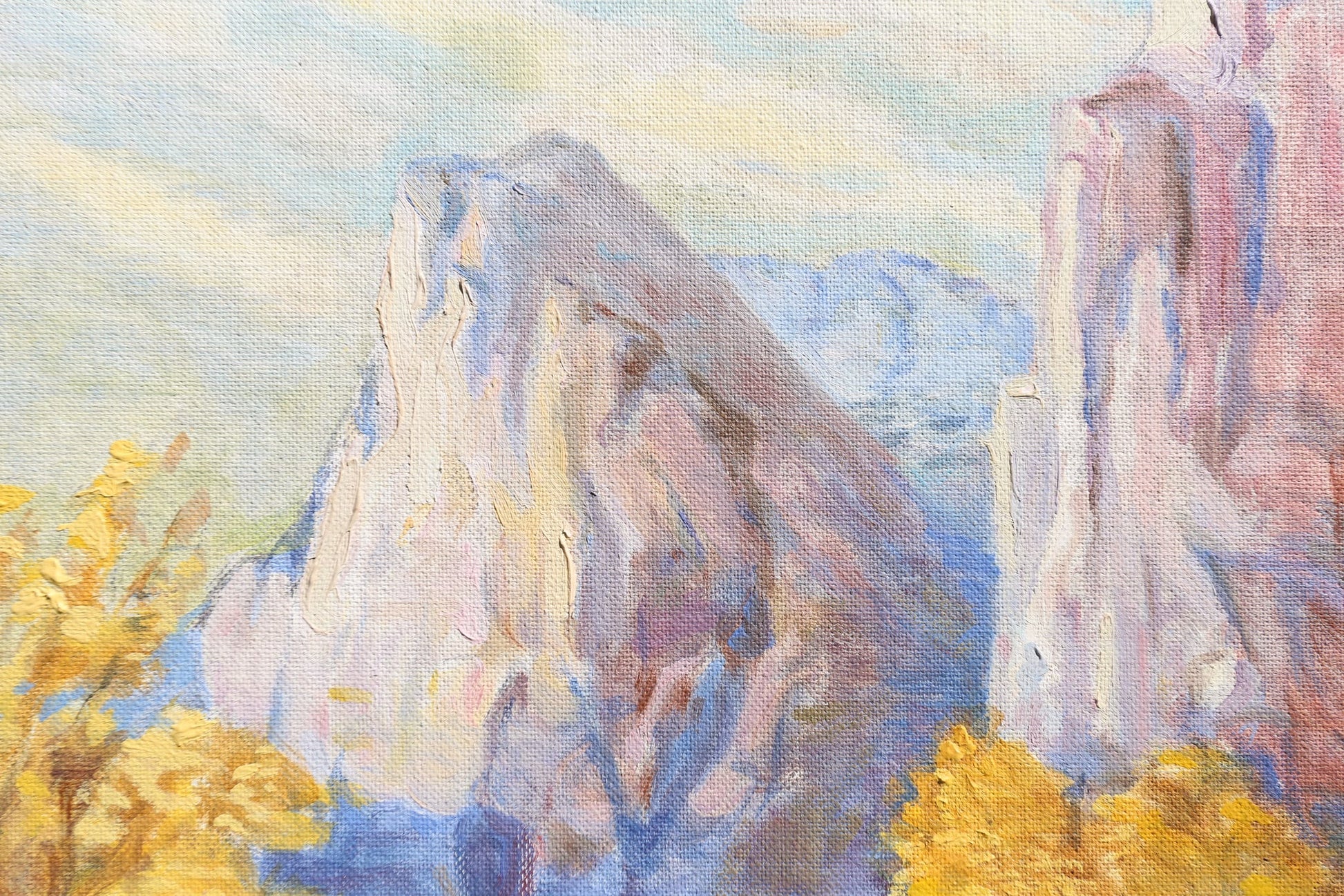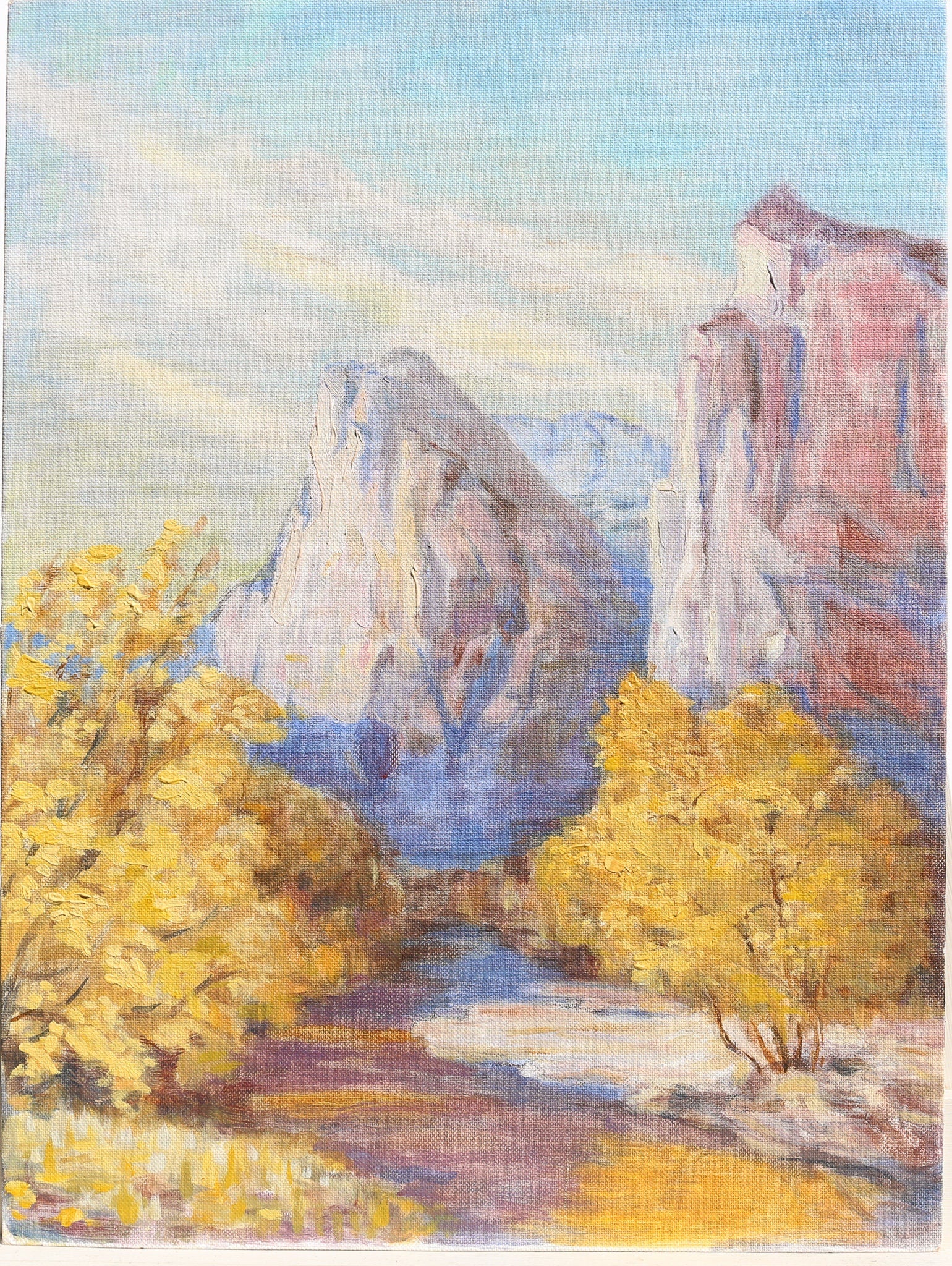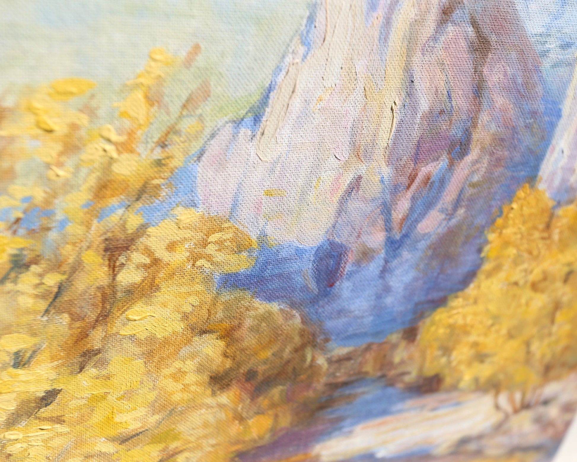 On offer artist signed oil on canvas board still life titled "Connecticut Rock Formations with Autumn Fall Trees." Sophisticated composition, skillfully painted throughout by Jule Melbardis (1879 - 1979), c. 1950. The artist practiced in both Latvia and throughout North America, most often in Connecticut.
